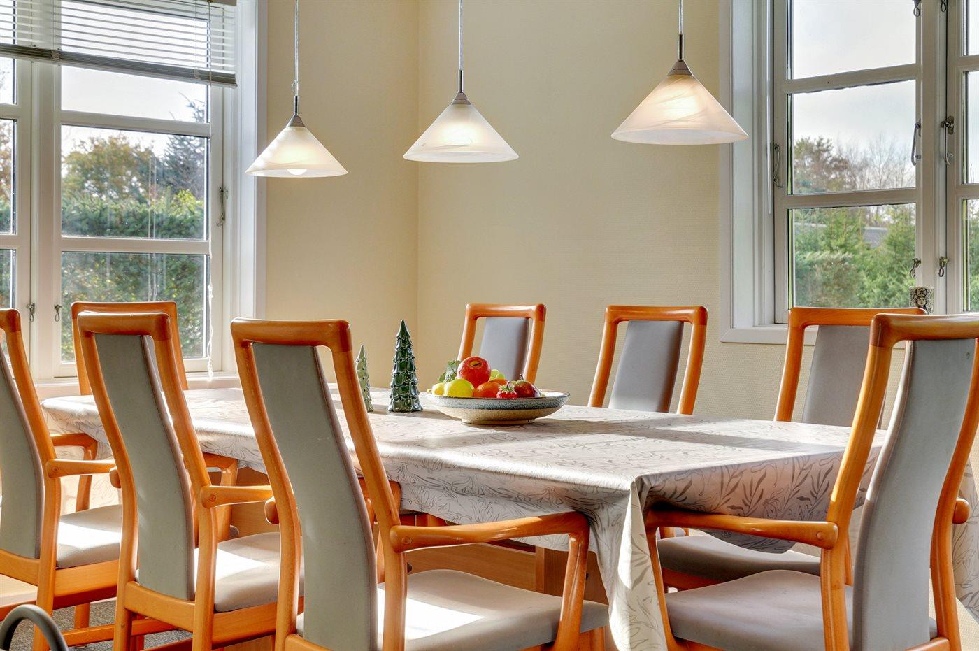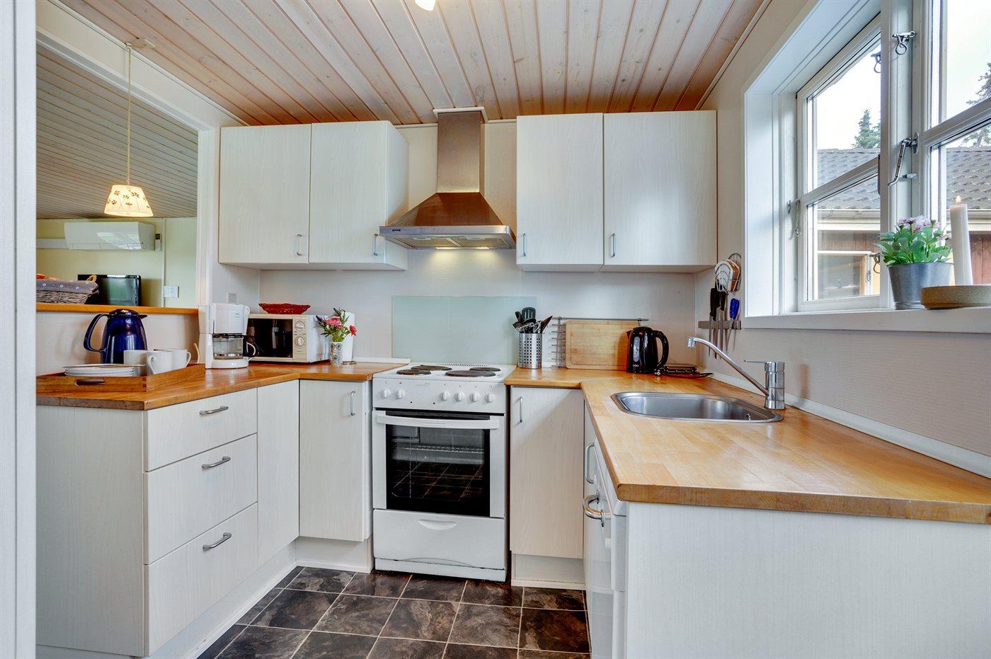 Køkkenet er udstyret med 1 køleskab. Der er 4 elkogeplader, bageovn, mikrobølgeovn samt opvaskemaskine.