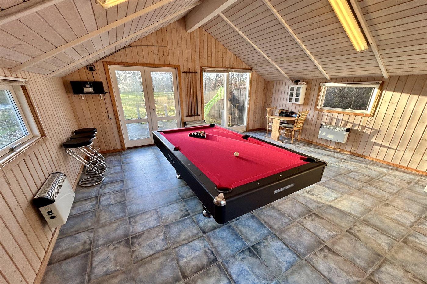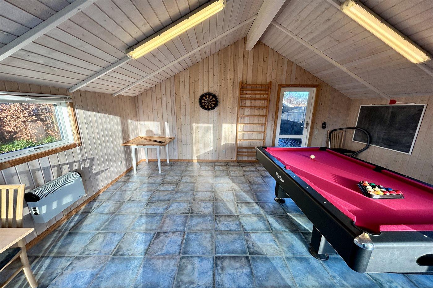 Et dejligt sommerhus med en stor lukket grund, hvor både voksne, børn og hunden kan boltre sig. Hvis I får problemer med at få børnene ind, skyldes det nok det store og fine legehus, som har både varme og lys. Der findes desuden et stort anneks med 4 sovepladser fordelt på 2 værelser samt 1 gæstetoilet. I annekset er der også et stort aktivitetsrum med forskellige spil samt motionsredskaber.