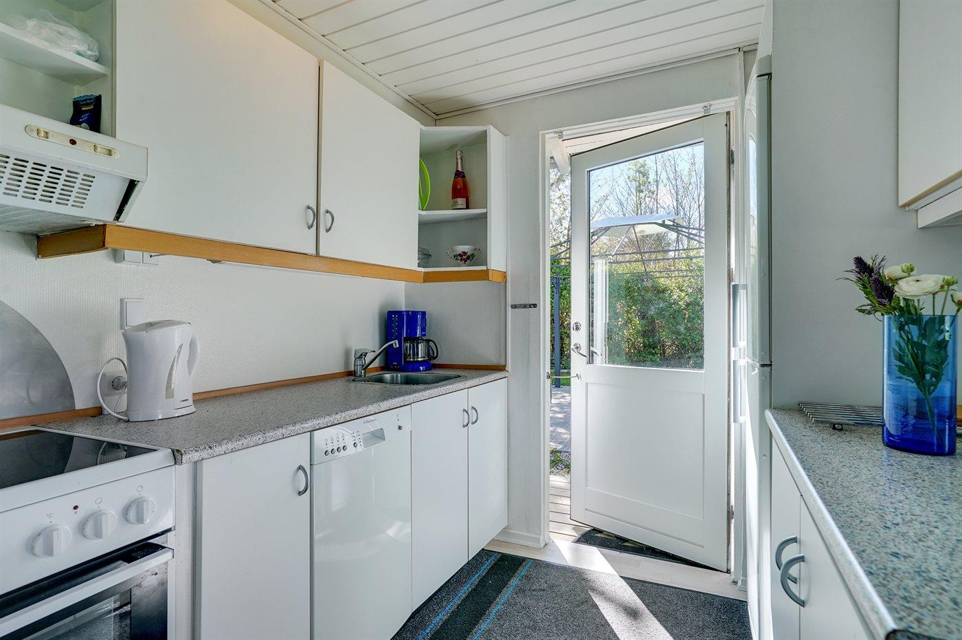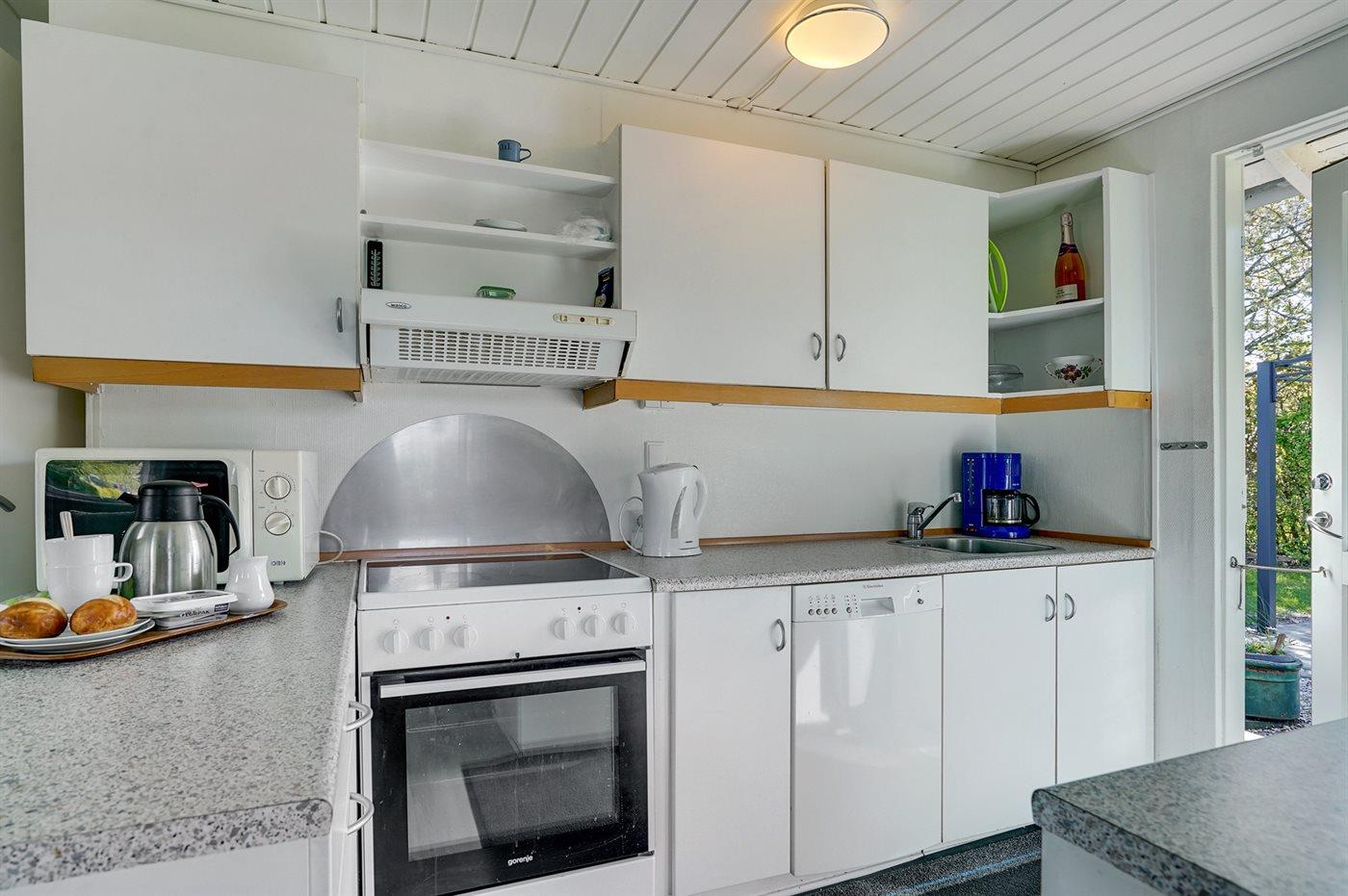 Køkkenet er udstyret med 1 køleskab. Der er 4 keramiske kogeplader, varmluftovn samt opvaskemaskine.