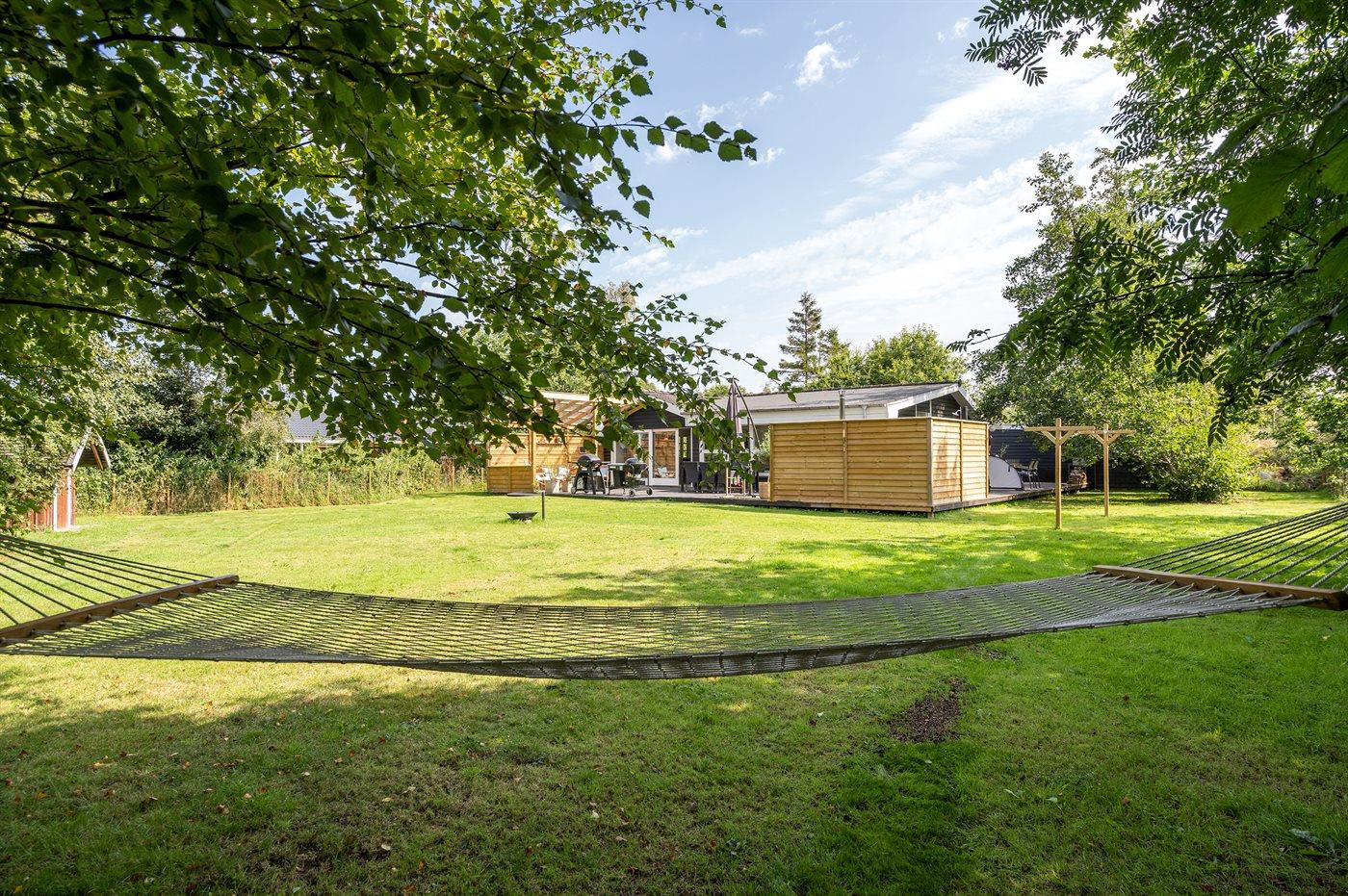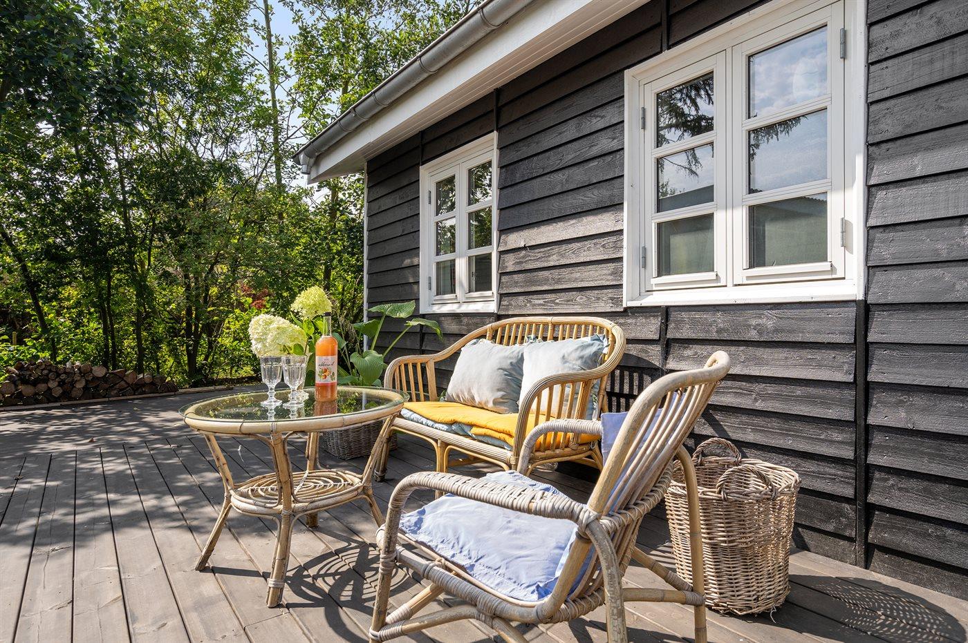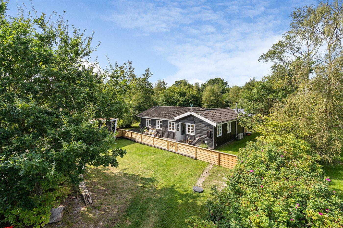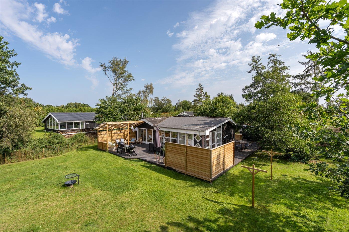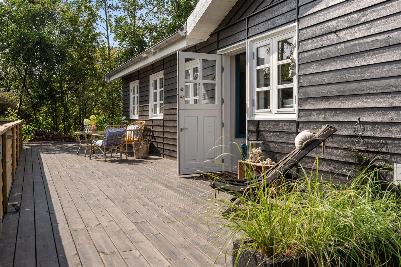 Dette dejlige sommerhus ligger på en indhegnet havegrund. Huset er omgivet af ca. 100 m2 terrasse samt ca. 15 m2 overdækket terrasse, hvor der er mulighed for at læse en god bog, nyde et lækkert måltid mad eller slappe af i vildmarkskarret eller den udendørs sauna.
