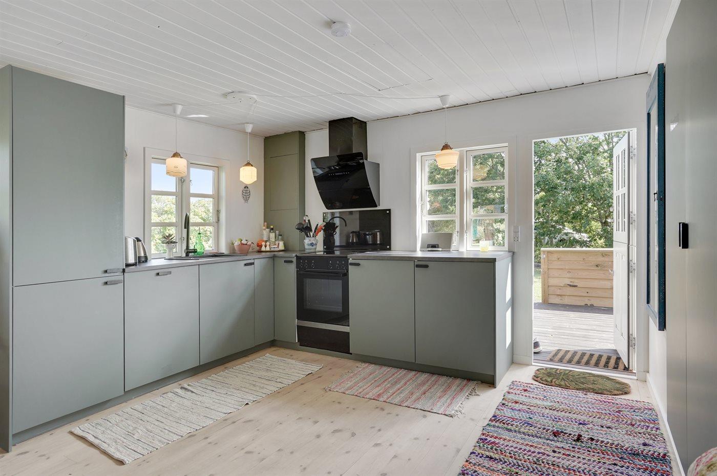 Køkkenet er udstyret med 1 køleskab. Der er 4 keramiske kogeplader, varmluftovn, mikrobølgeovn samt opvaskemaskine.