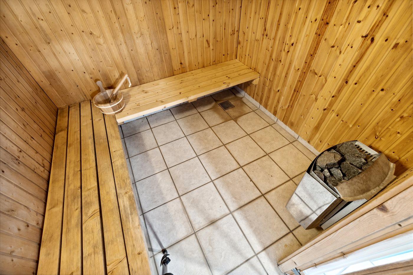 Der er 2 badeværelser med bruseniche og 2 toiletter. Der er gulvvarme på 2 badeværelser. I saunaen er der mulighed for afslapning.