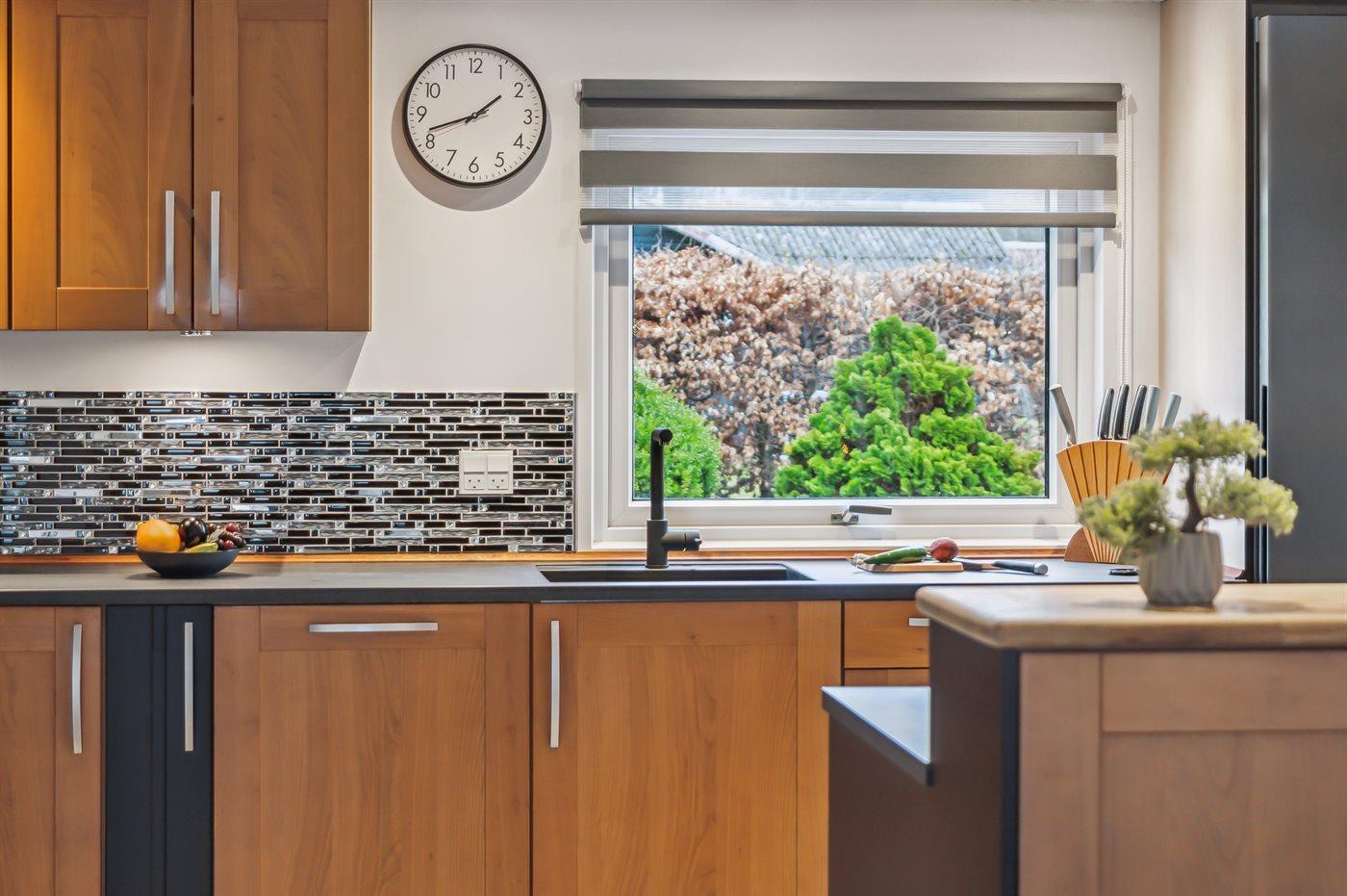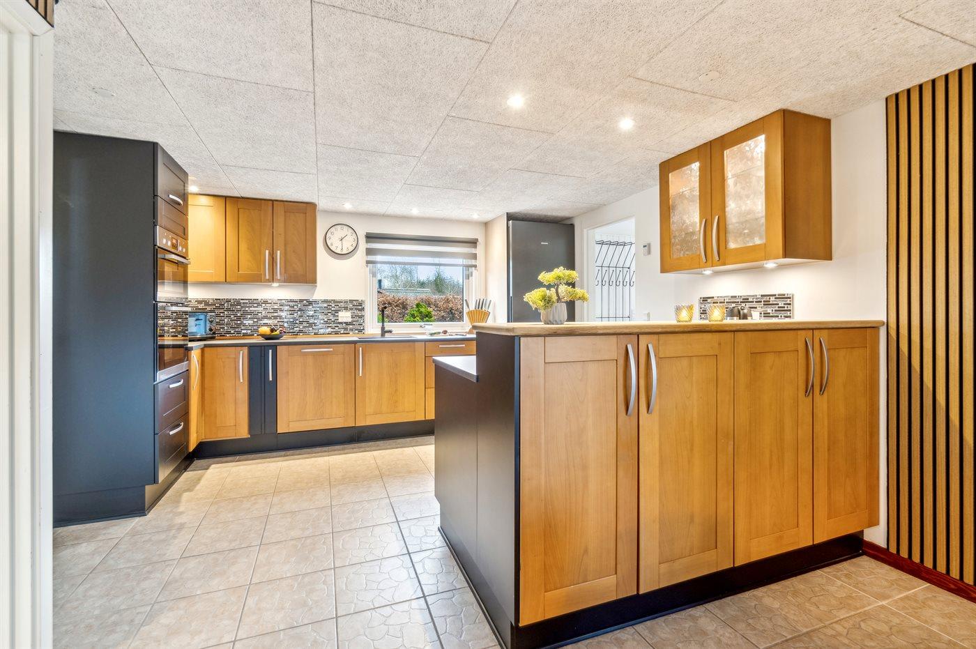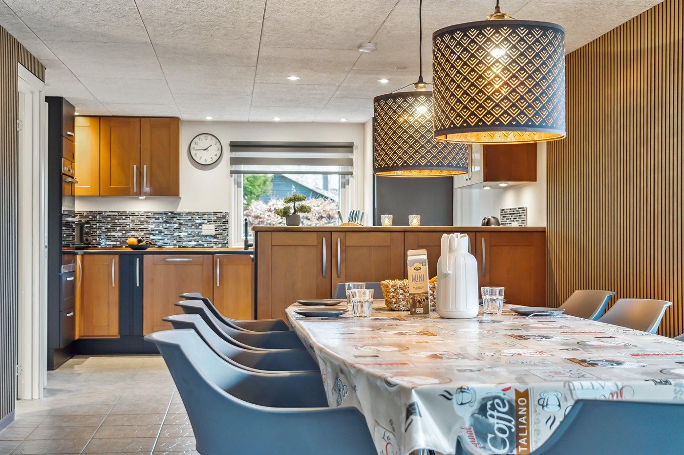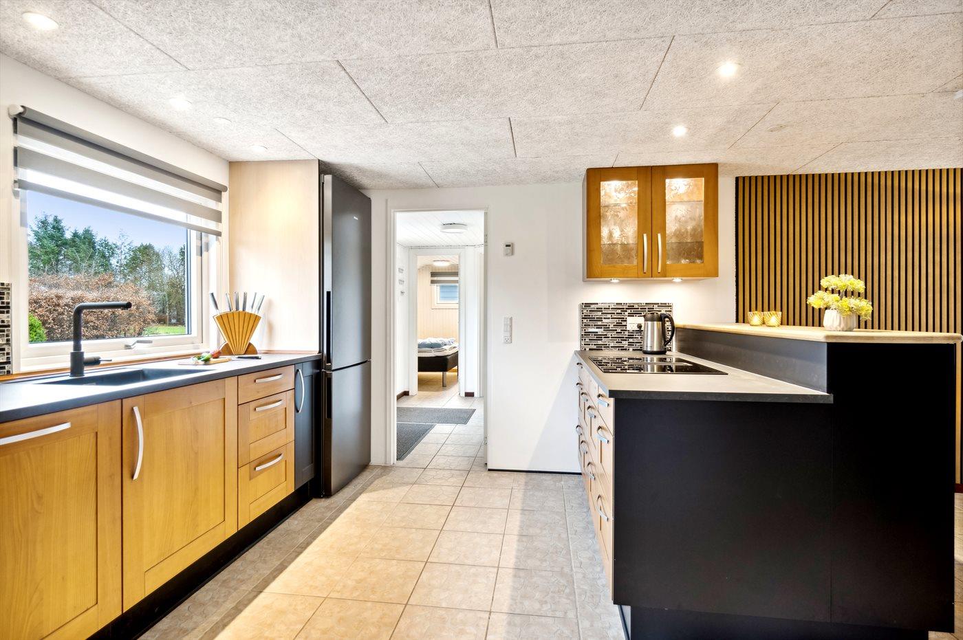 Køkkenet er udstyret med 1 køleskab. Der er 4 induktionskogeplader, varmluftovn, mikrobølgeovn samt opvaskemaskine.