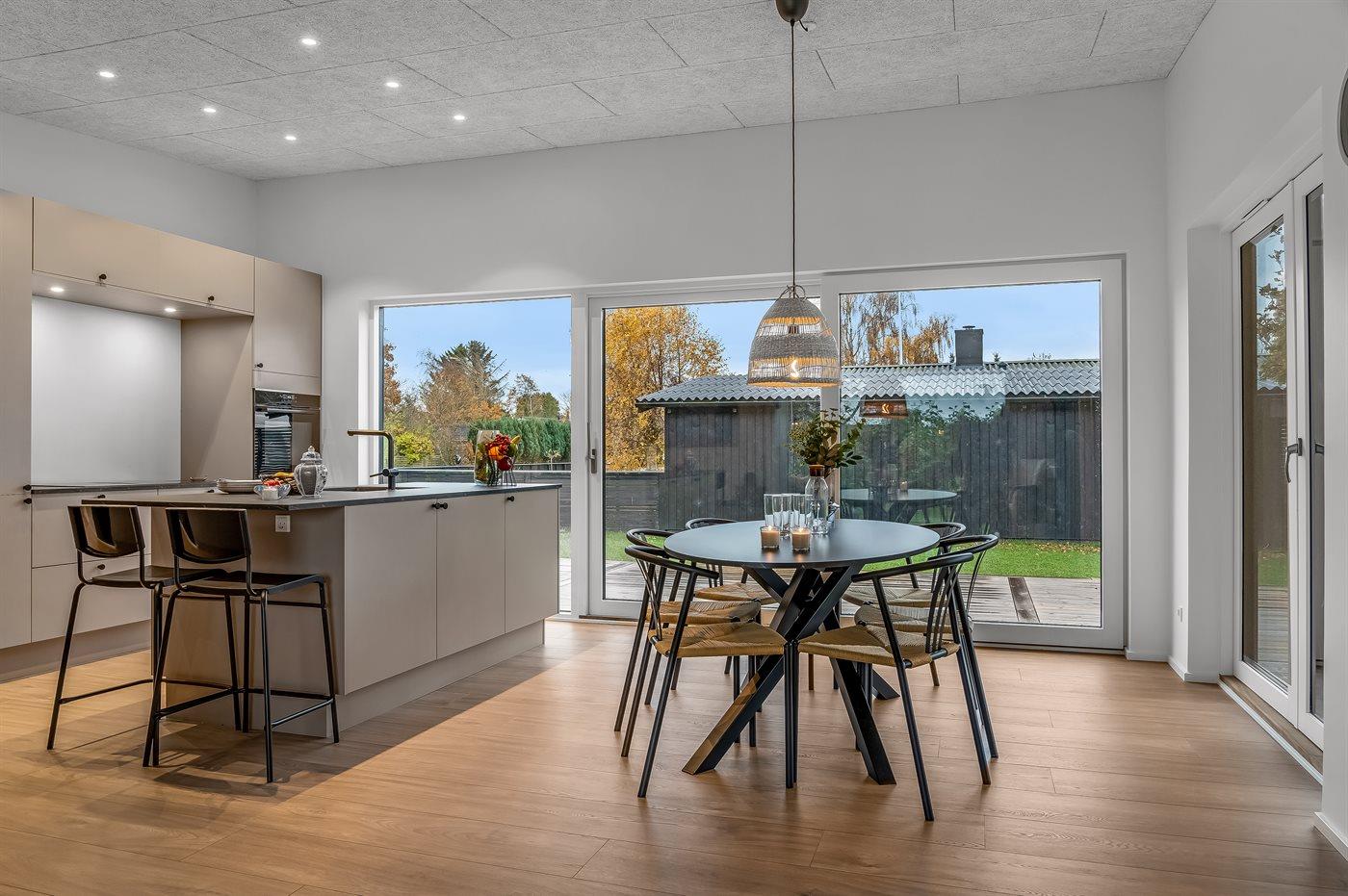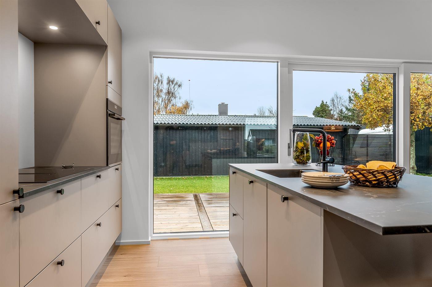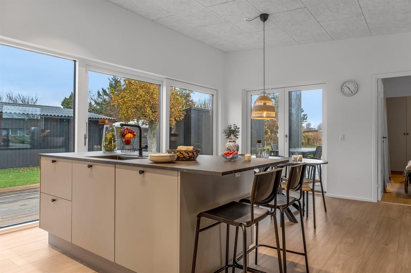 Køkkenet er udstyret med 1 køleskab. Der er 4 induktionskogeplader, varmluftovn samt opvaskemaskine.