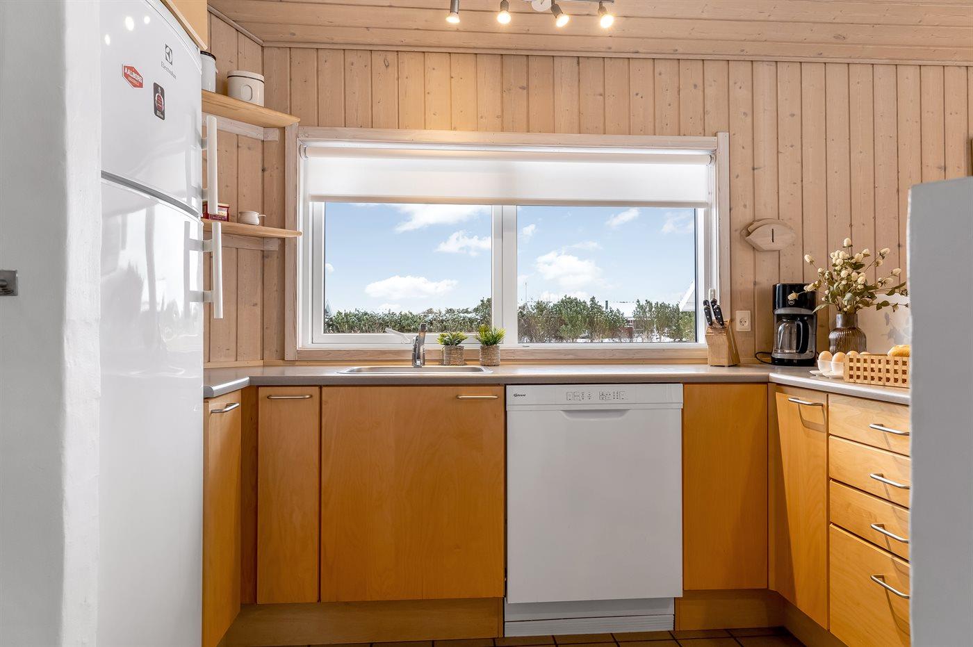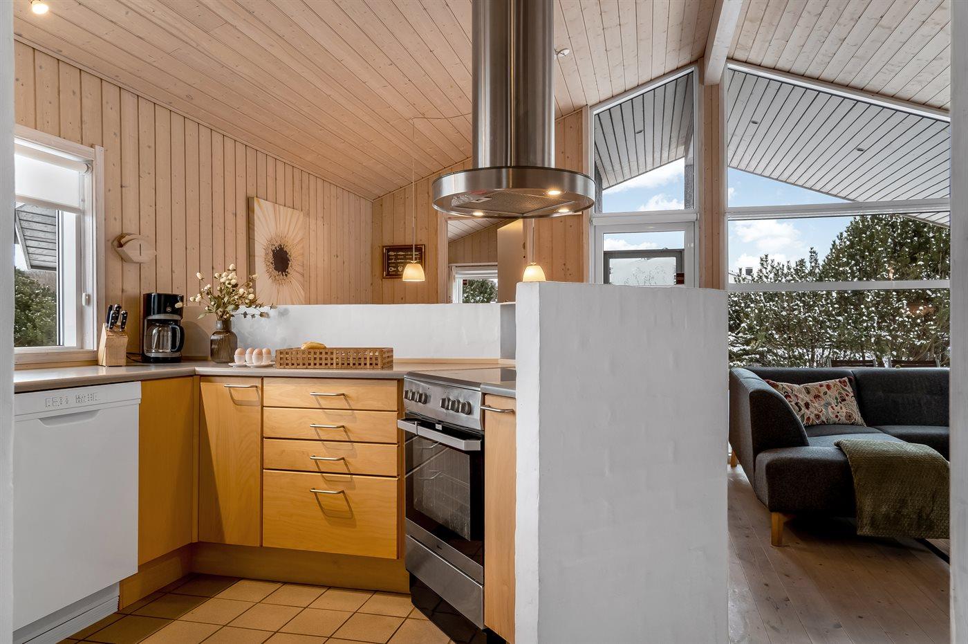 Køkkenet er udstyret med 1 køleskab. Der er 4 keramiske kogeplader, varmluftovn, mikrobølgeovn samt opvaskemaskine.