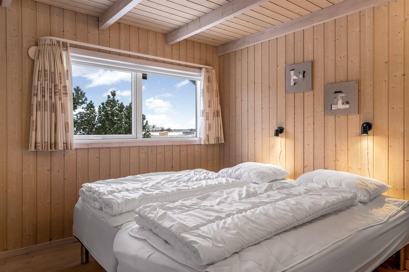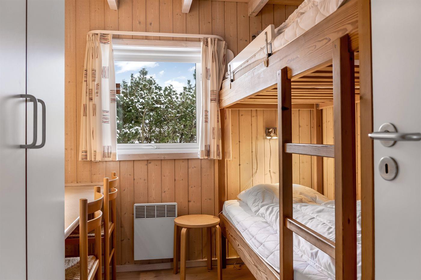 Der er i alt 3 soveværelser. Sovepladserne fordeler sig på: 4 sovepladser i dobbeltsenge. 2 sovepladser i køjeseng. Derudover er der 1 stk. barneseng.
