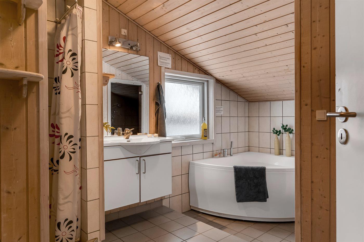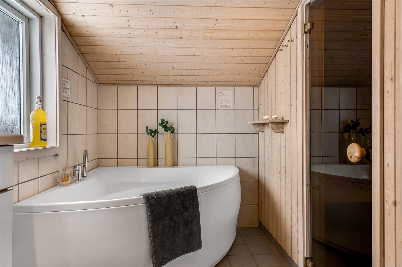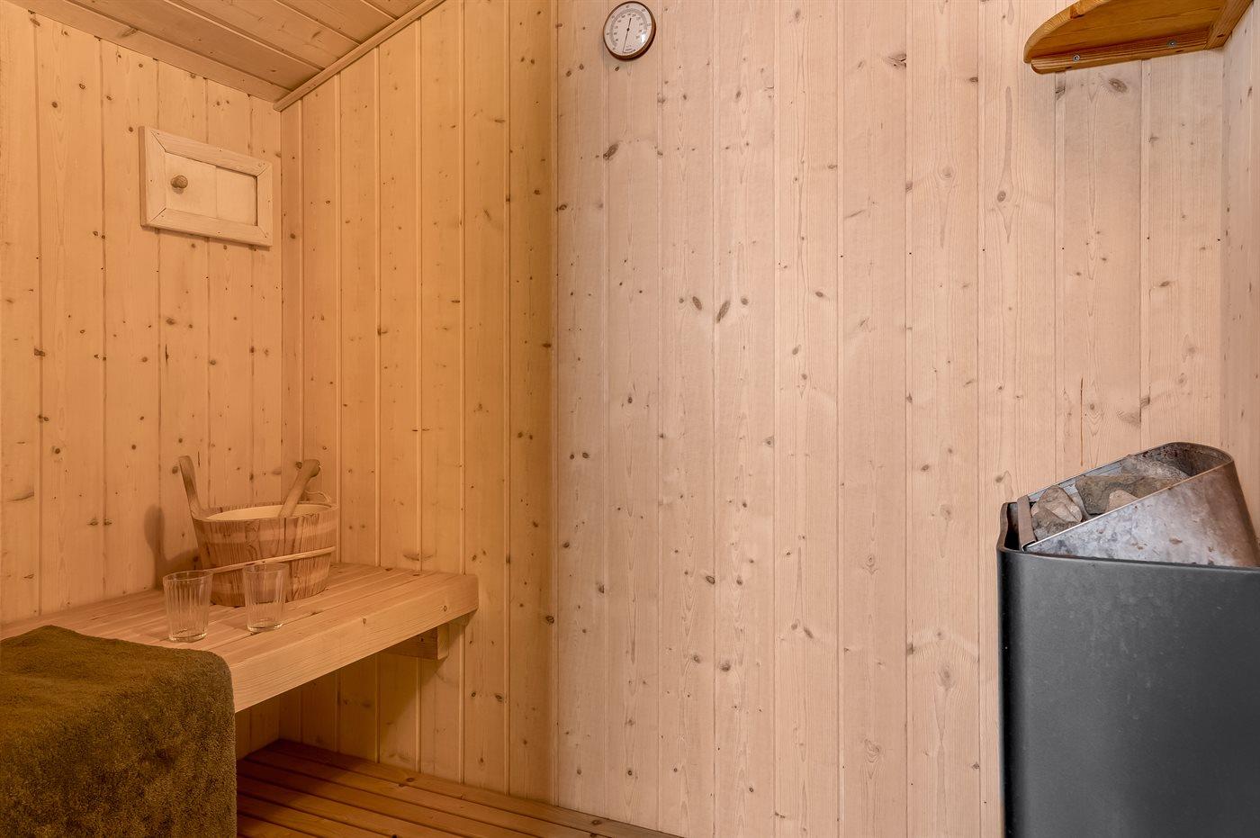 Der er 1 badeværelse med bruseniche og 2 toiletter, heraf 1 gæstetoilet. Der er gulvvarme på 1 badeværelse. Der er gulvvarme på gæstetoilettet. I saunaen er der mulighed for afslapning.