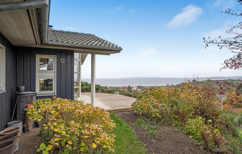 Dejligt træhus med panoramaudsigt over havet, komfort og skønne udendørsområder i Egsmark Strand.