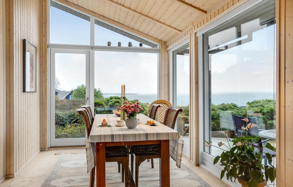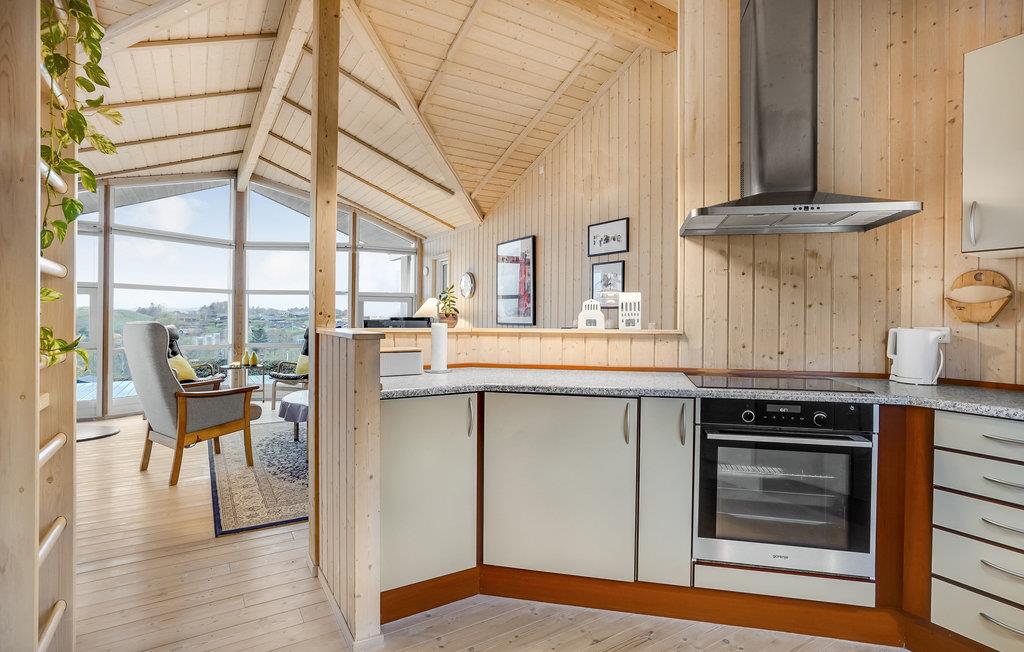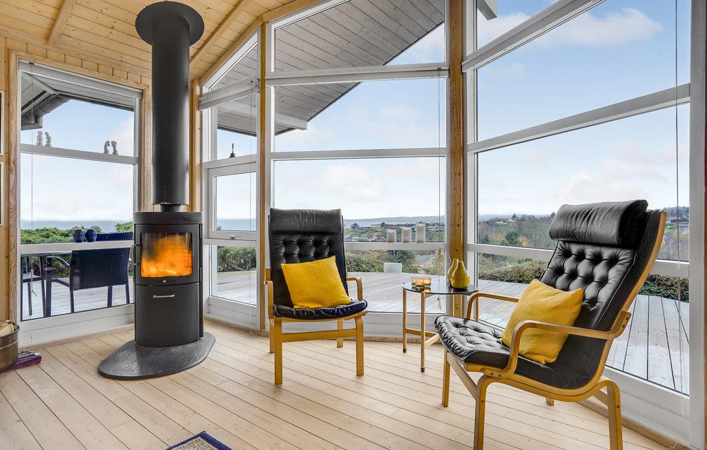 Dette lyse og smagfuldt indrettede træhus indbyder til en afslappende ferie i rolige og naturskønne omgivelser. I det veludstyrede køkken kan nogle af jer tilberede lækre feriemåltider og samtidigt hyggesnake med de andre, der slapper af i stuens komfortable møbler. Hele stuen har panoramavinduer, så I kan nyde alle dagens måltider til den vidunderlige havudsigt. Stuen har desuden åbent til kip, hvilket skaber en rummelig, hyggelig og lys atmosfære. Efter en lang dag i den friske luft havluft, kan I se en god film på fladskærmen, og om vinteren kan I slappe dejligt af til de knitrende flammer i brændeovnen.