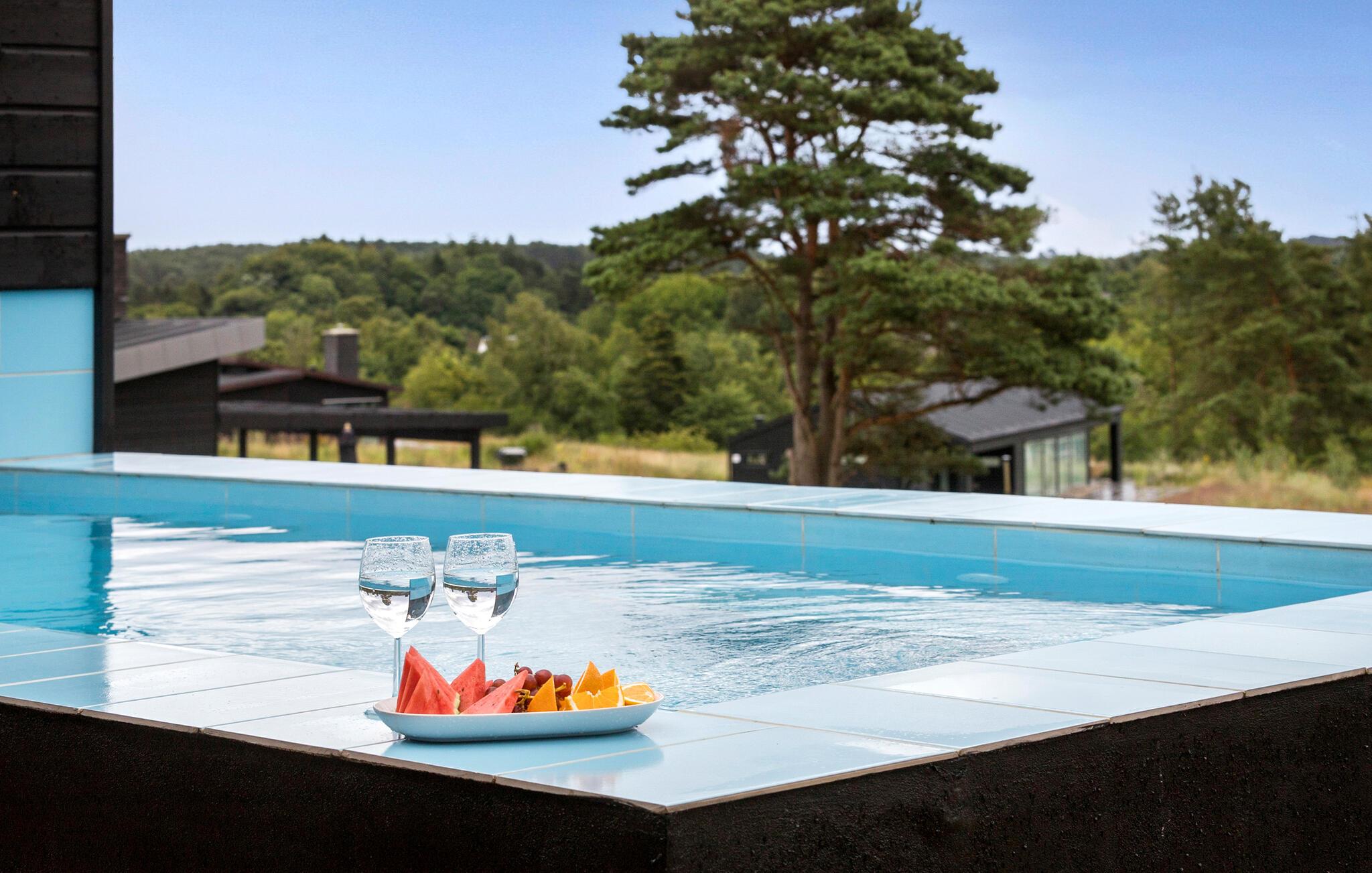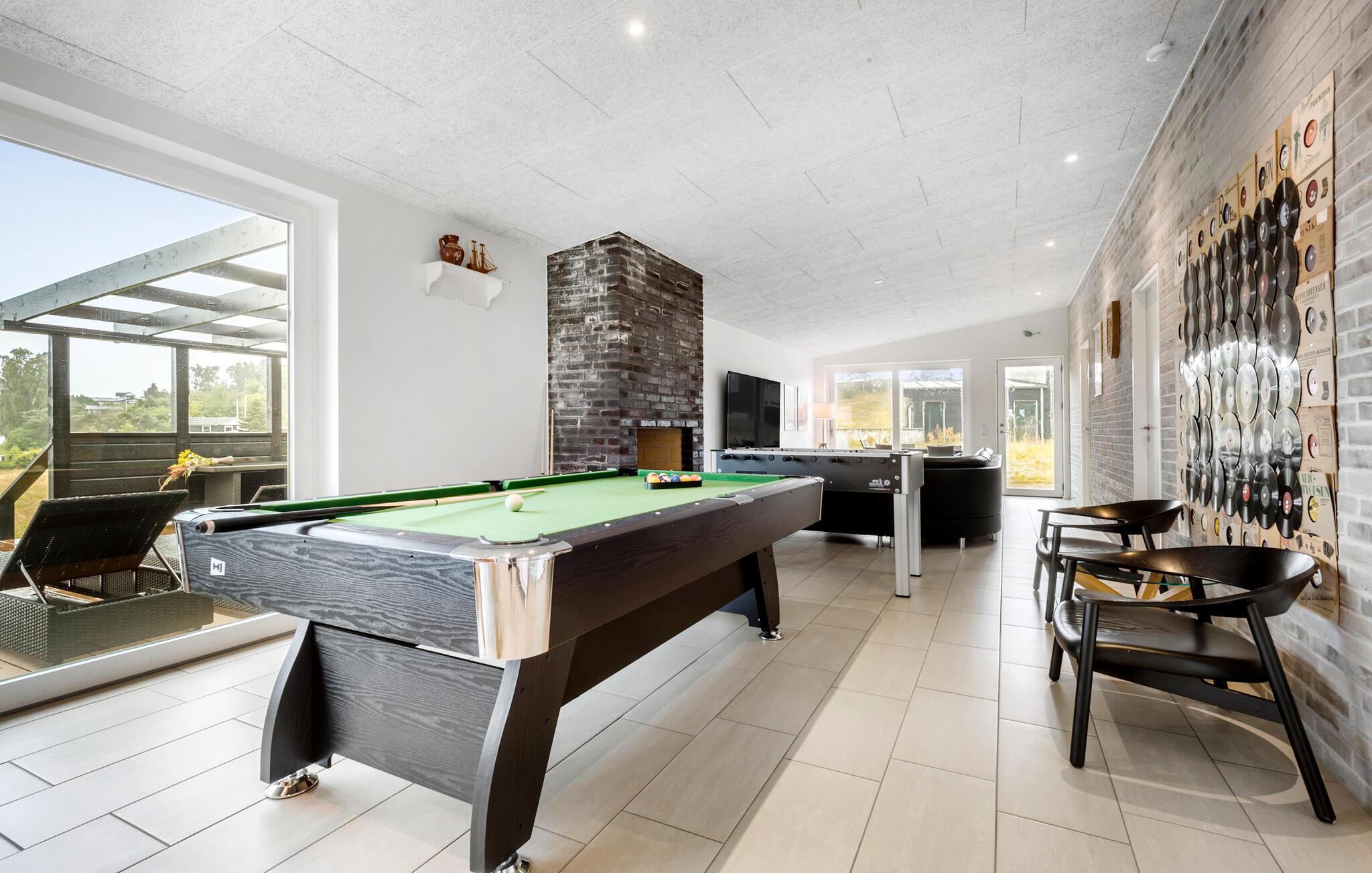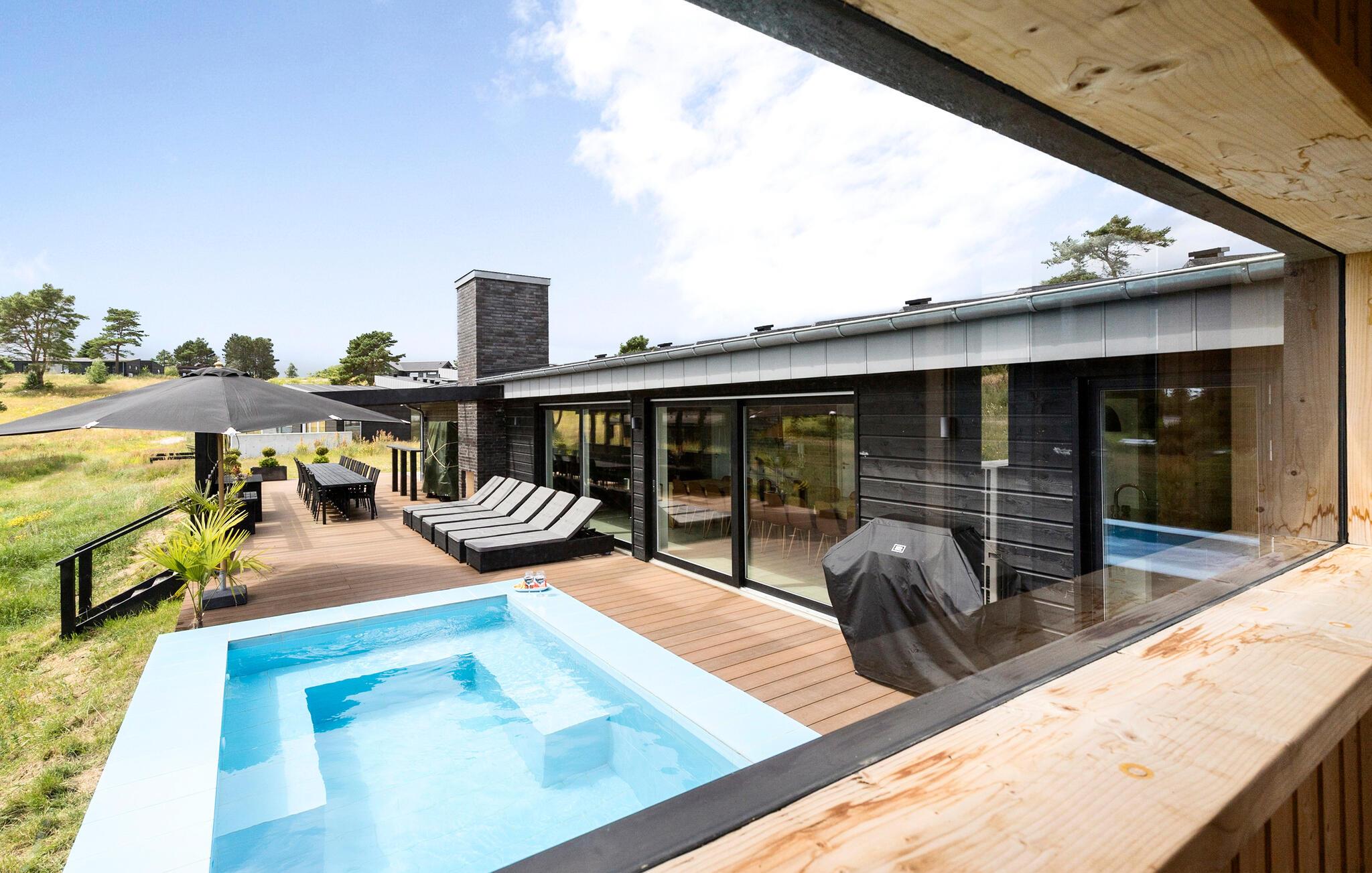 Luksuriøst feriehus ved Egsmark Strand med pool, sauna og aktivitetsrum, perfekt til familier.