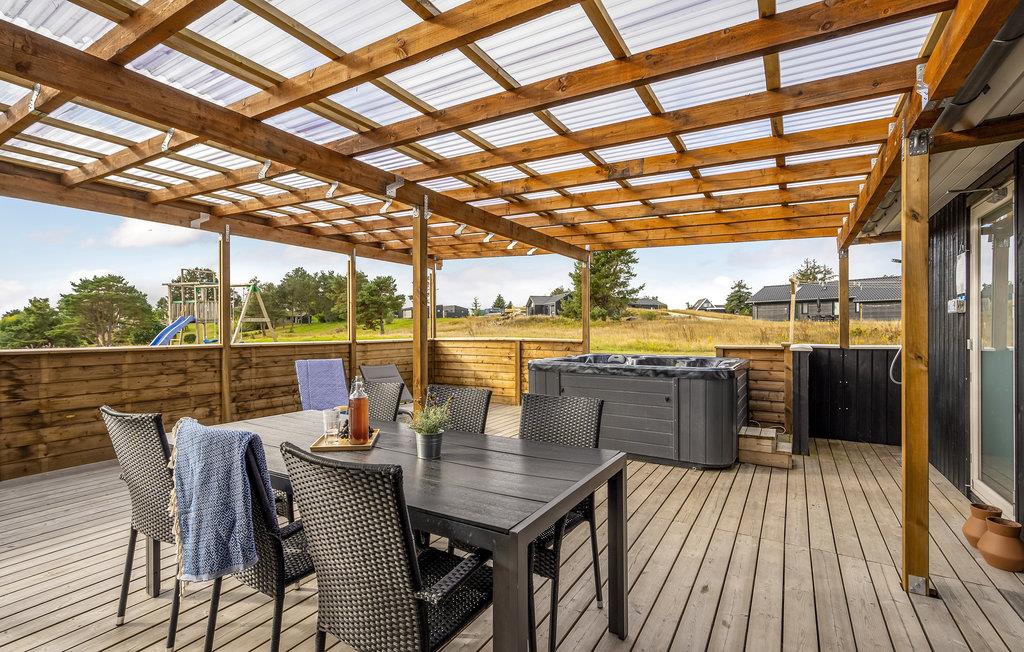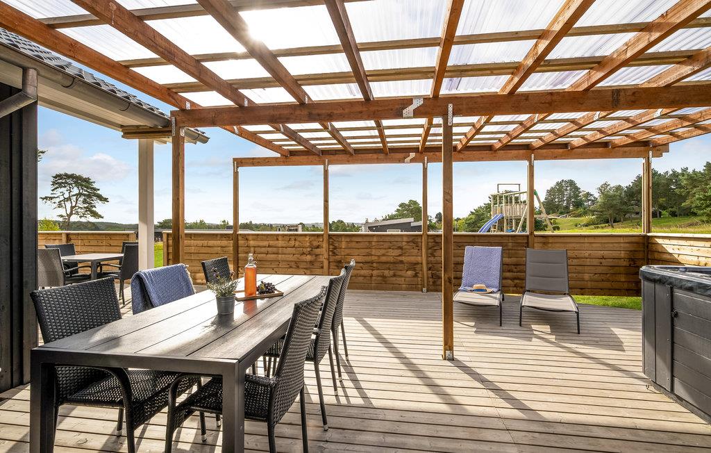 I forbindelse med husets terrasseområde findes der en overdækket terrasse, hvor I kan sidde til langt ud på aftenen selvom duggen falder.