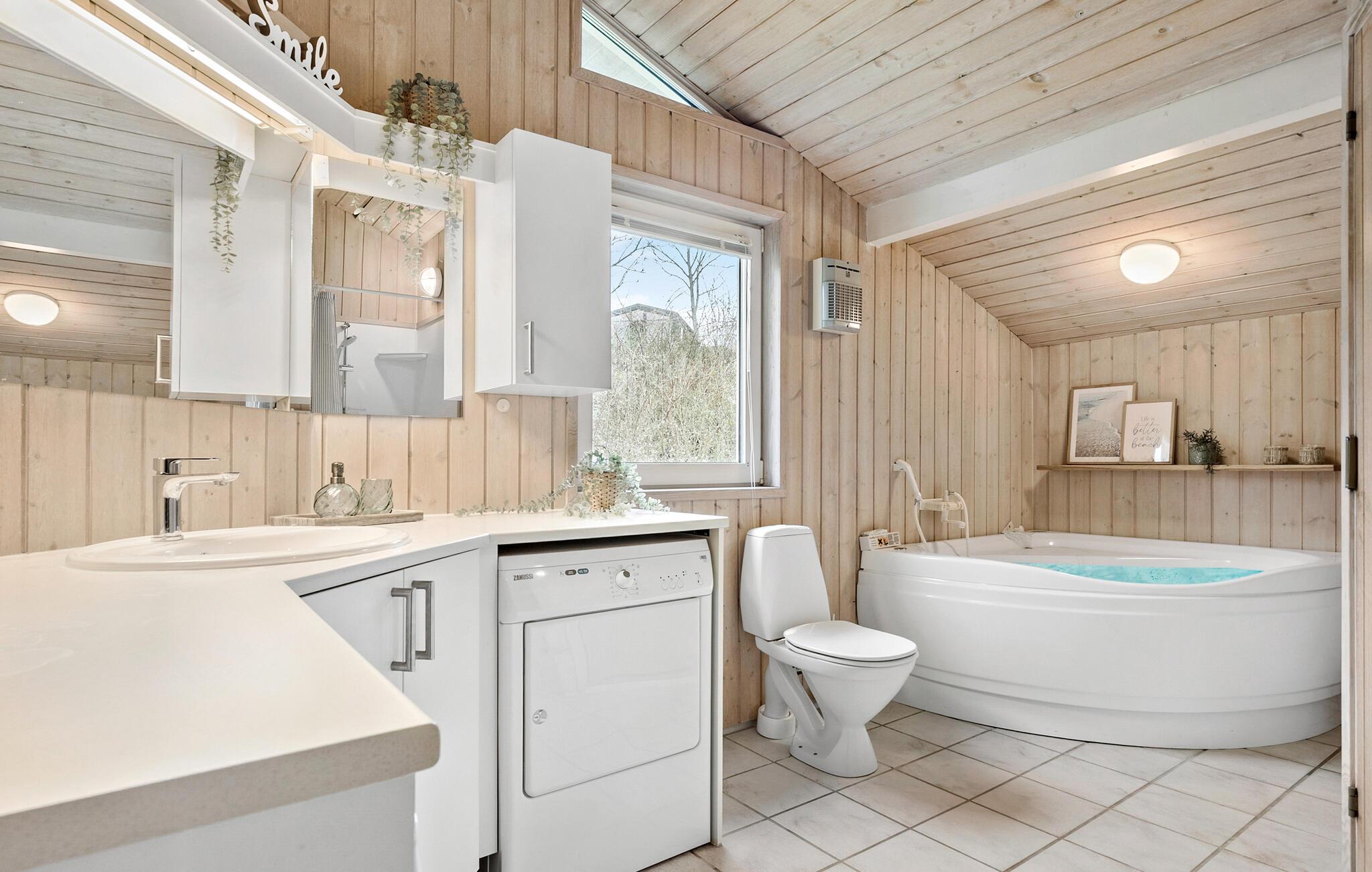 Tag familien under armen og lad turen gå til Egsmark Strand, hvor der er lagt op til en hyggelig ferie i dette lyse og komfortable hus. Boligen fremstår indbydende og rummer et vellykket mix af varme træelementer og moderne faciliteter, hvor I kan slappe af og lade hverdagen blive derhjemme. I det rummelige, veludstyrede køkken kan I tage jer god tid til at piske familiens livretter sammen, mens andre gør sig det behageligt i sofaen med en god bog eller et krydsord. I den indendørs pool kan I dyppe jer hele året rundt og efterfølgende nyde lidt god wellness og svede godt igennem i saunaen. Måske I skal slutte en dejlig feriedag af i boblerne i spabadet?