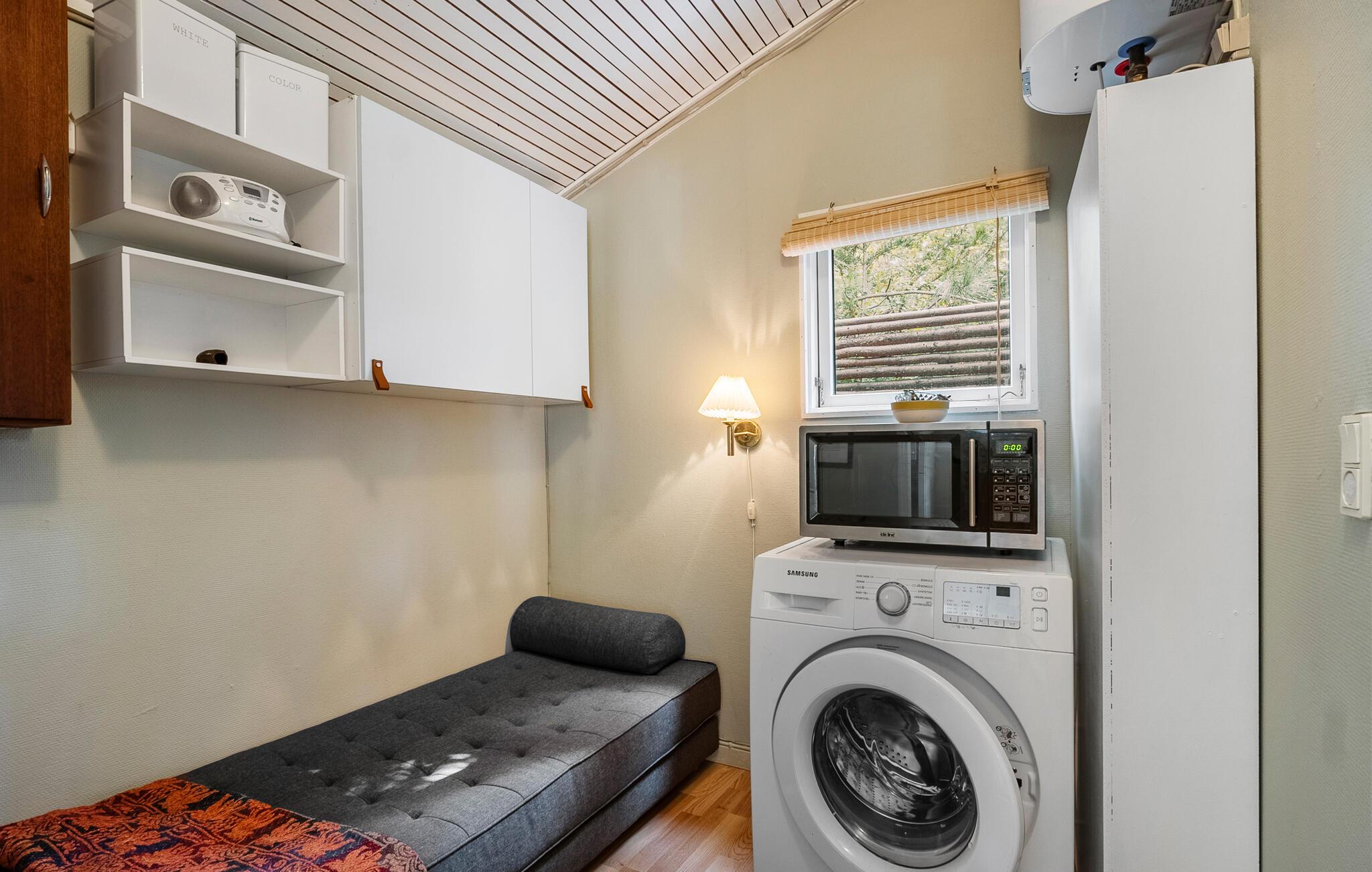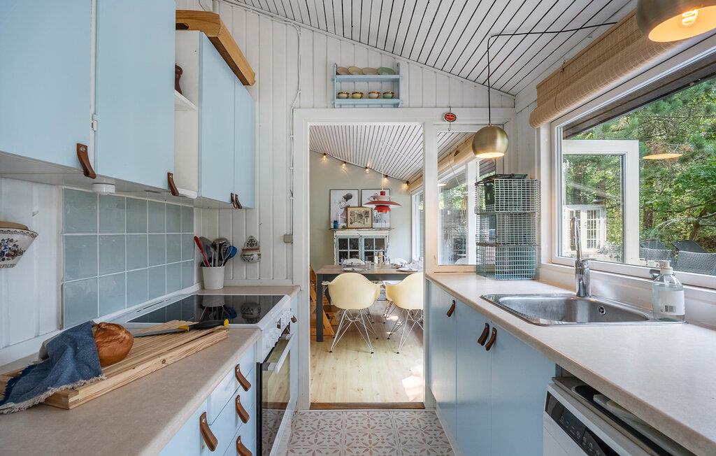 Sæt hverdagen på pause og hold ubekymrede ferier i dette børnevenlige feriehus. Her kan I nyde naturens fred og ro, komforten i en gennemtænkt indretning og den korte afstand til stranden. Find jer godt til rette i huset og nyd en stille stund i sofaen ved brændeovnen. Tilbered jeres måltider i det praktiske køkken og nyd dem ved spisebordet, som har udsigt til det grønne.