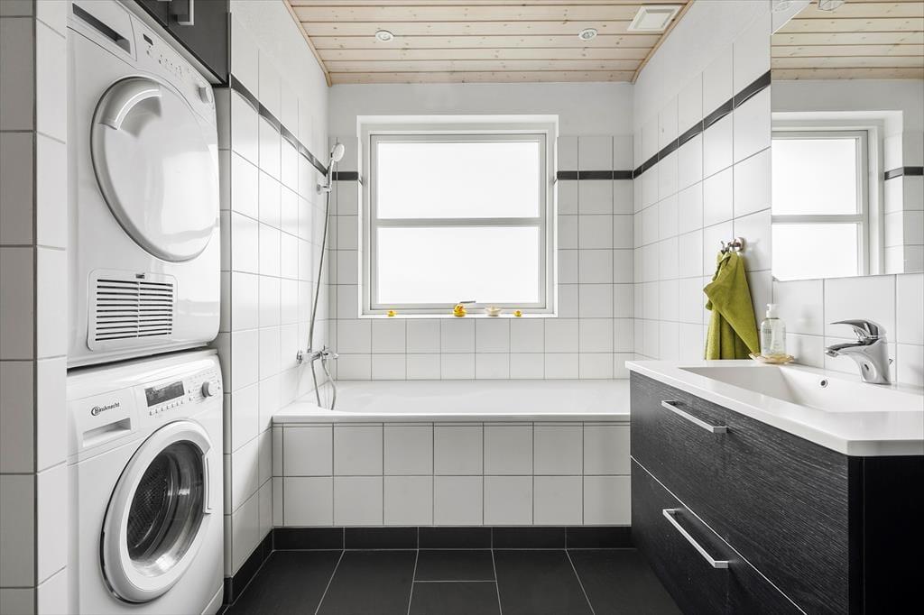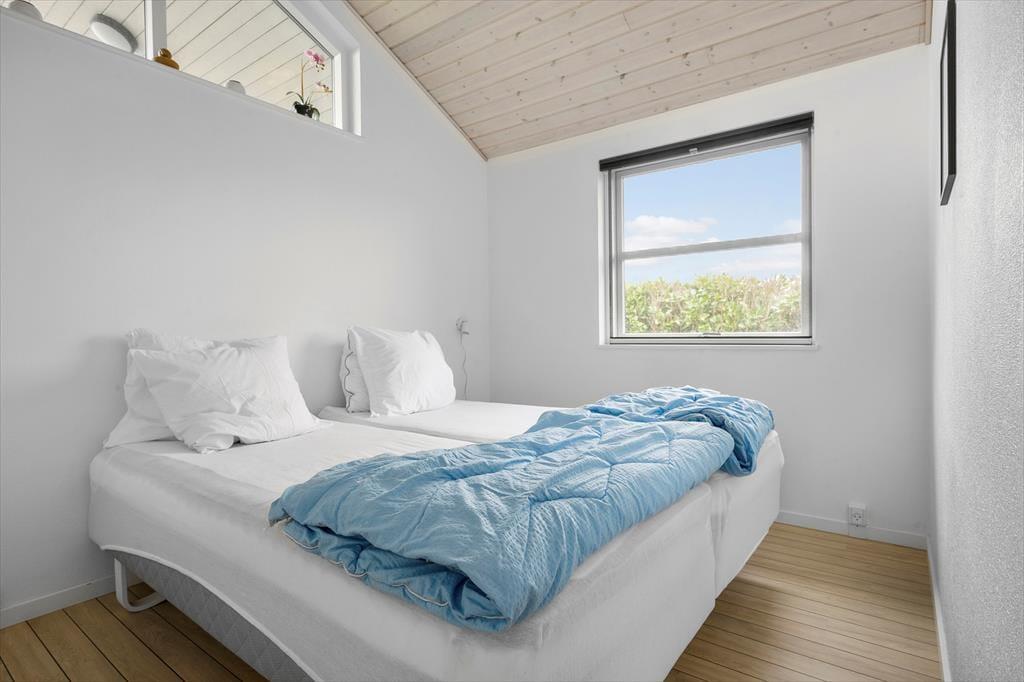 Huset har to rummelige soveværelser – det ene med to enkeltsenge (90x200) og det andet med en dobbeltseng (180x200). Derudover er der en hems med ekstra sovepladser på madrasser, som nemt nås via en bred trappe med gelænder. Badeværelset er lyst og moderne med bruseniche, badekar, håndvask, toilet og gulvvarme – perfekt til afslapning efter en dag fuld af oplevelser.