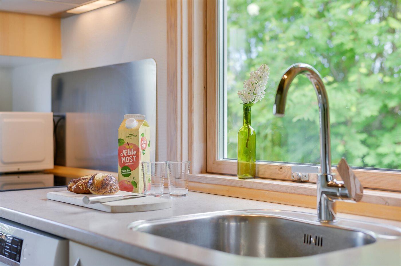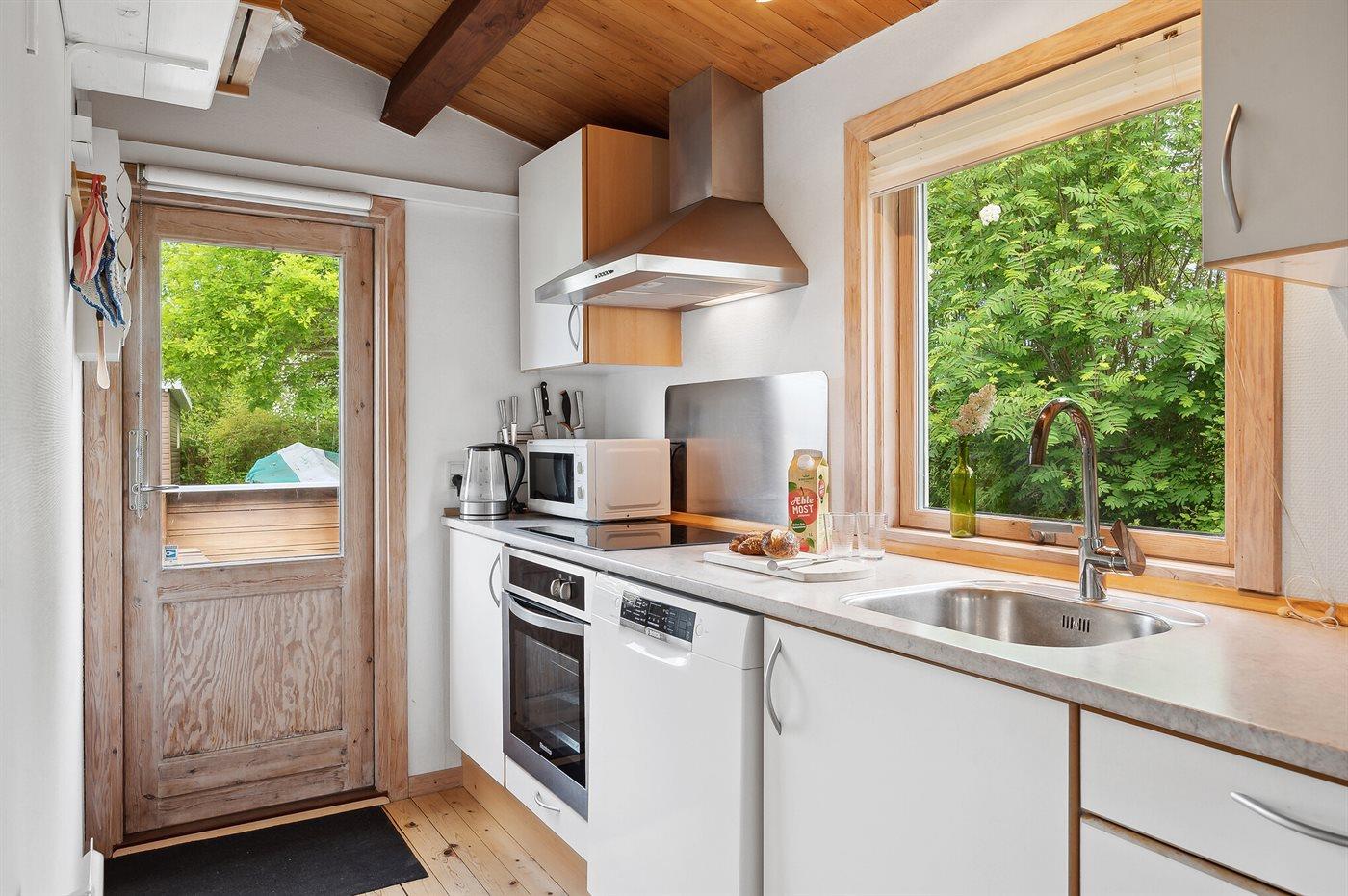 Køkkenet er moderne og veludstyret med alt, hvad du behøver til madlavningen – heriblandt køleskab, 100 liters frysekapacitet, fire keramiske kogeplader, varmluftovn, mikrobølgeovn og opvaskemaskine. Til de yngste gæster findes der en barnestol, så hele familien kan samles omkring måltiderne.
