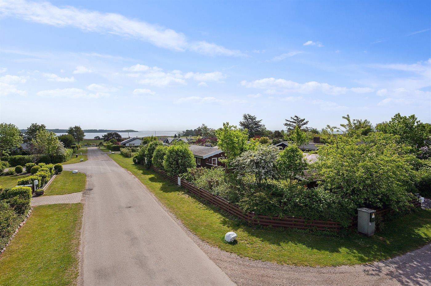Grunden er en 694 m² stor naturgrund, beliggende blot 250 meter fra både hav og fjord, og der er adgang til badebro i nærheden. Den nærmeste forretning ligger 3 km væk, og der er 7,5 km til den nærmeste golfbane. Udendørs findes både åben og overdækket terrasse, et redskabsrum, samt flere legefaciliteter såsom gynge, sandkasse, rutsjebane og fodboldmål. En legeplads ligger kun 2 km fra huset. Der er grill og carport, og det er muligt at parkere ved huset.