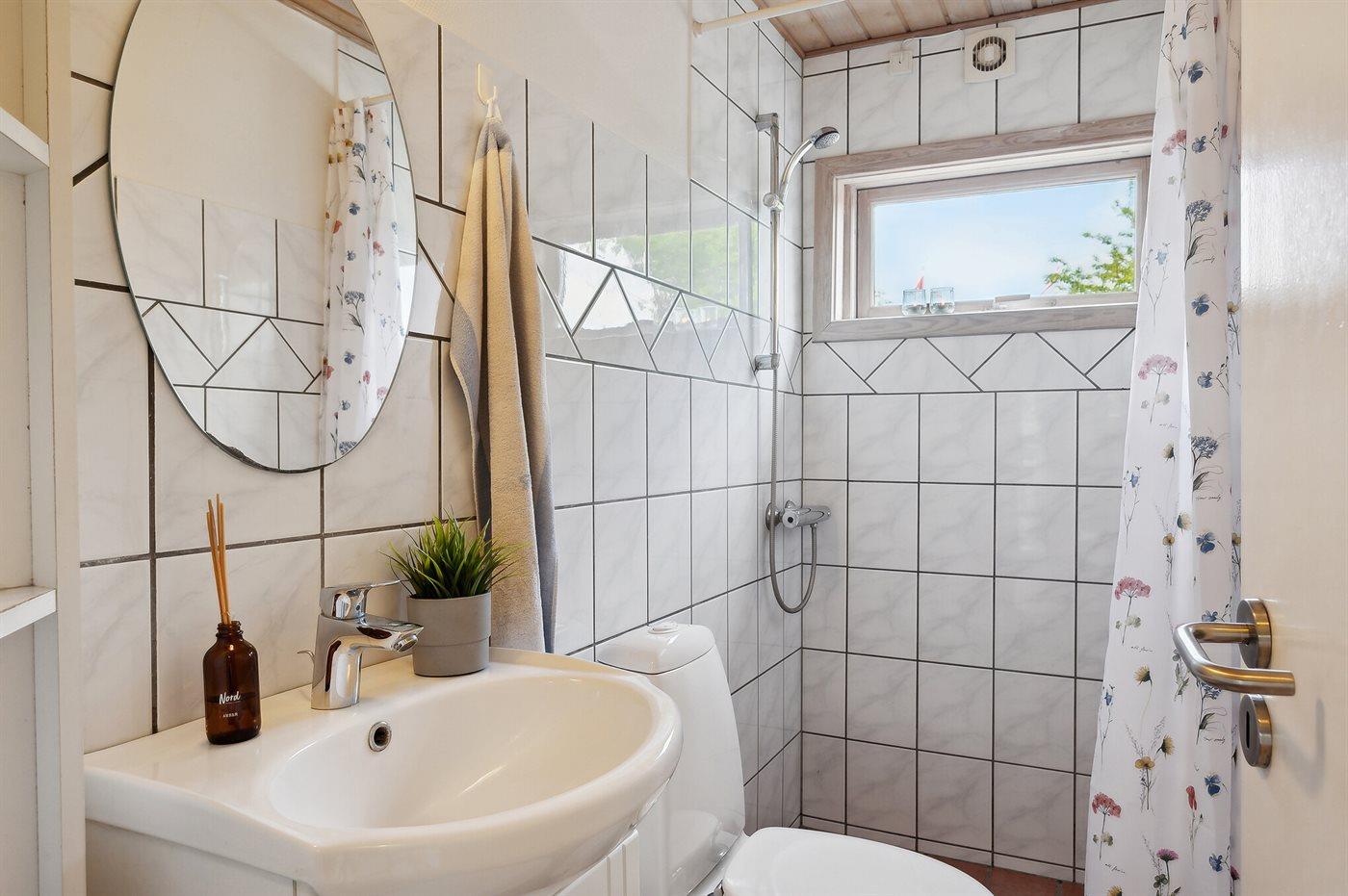 Badeværelset har bruseniche, toilet og gulvvarme.