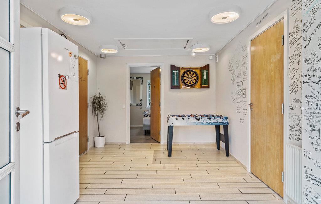 Hvis I er på udkig efter en skøn base for årets ferie med den udvidede familie, er dette rummelige hus ved Engesvang det helt perfekte valg. Her får I, ude som inde, alt det I behøver til et ophold, hvor ingen kommer til at kede sig. Indretningen fremtræder varmt og indbydende med store fællesrum og gode møbler. Efter aftensmaden kan I tage et slag dart eller pool, inden I runder aftenen af med brætspil eller en god film i den rummelige sofa.