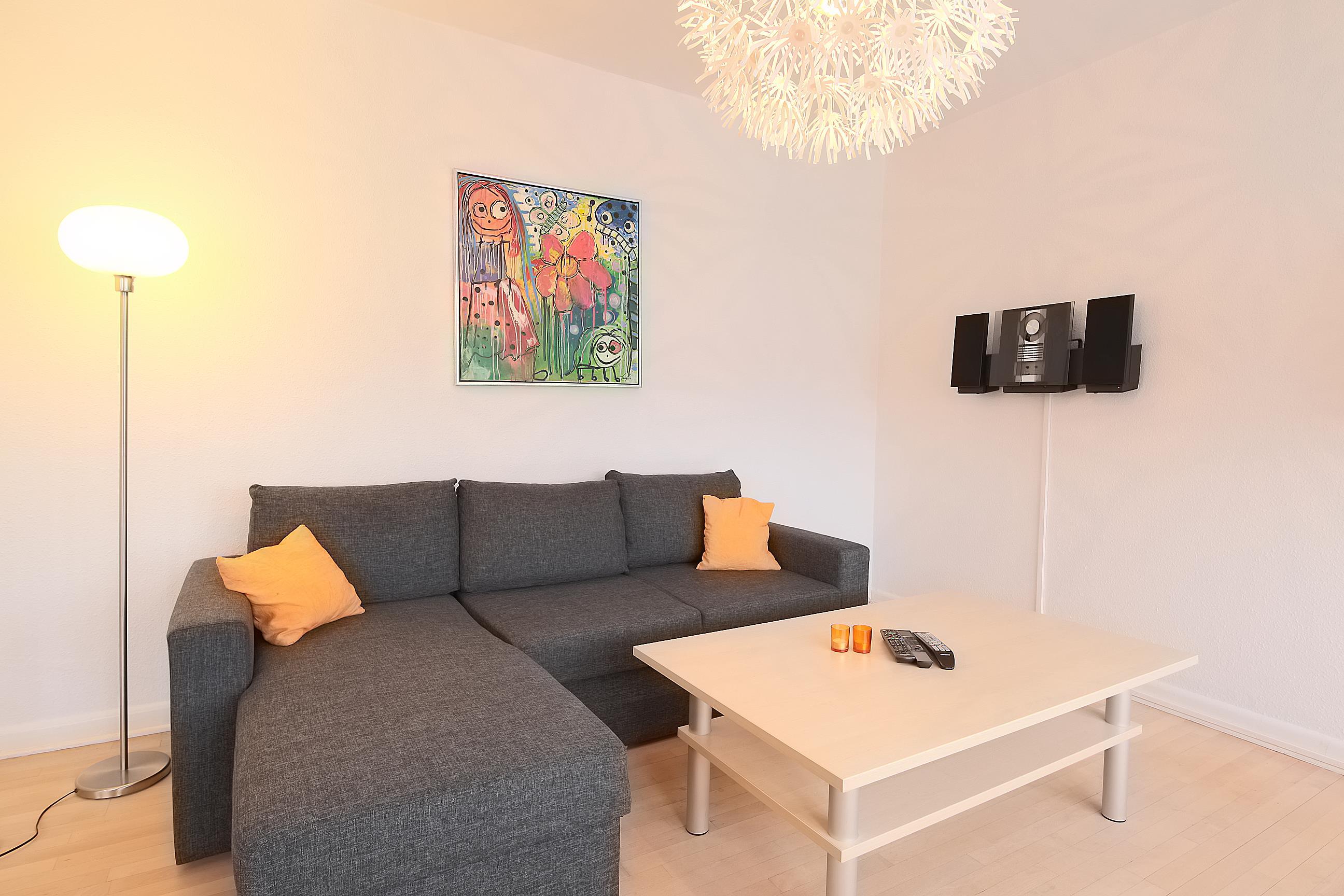 Dobbeltstue med hjørnesofa, tv, internet, radio, spisebord. Udgang til en lille overdækket balkon.