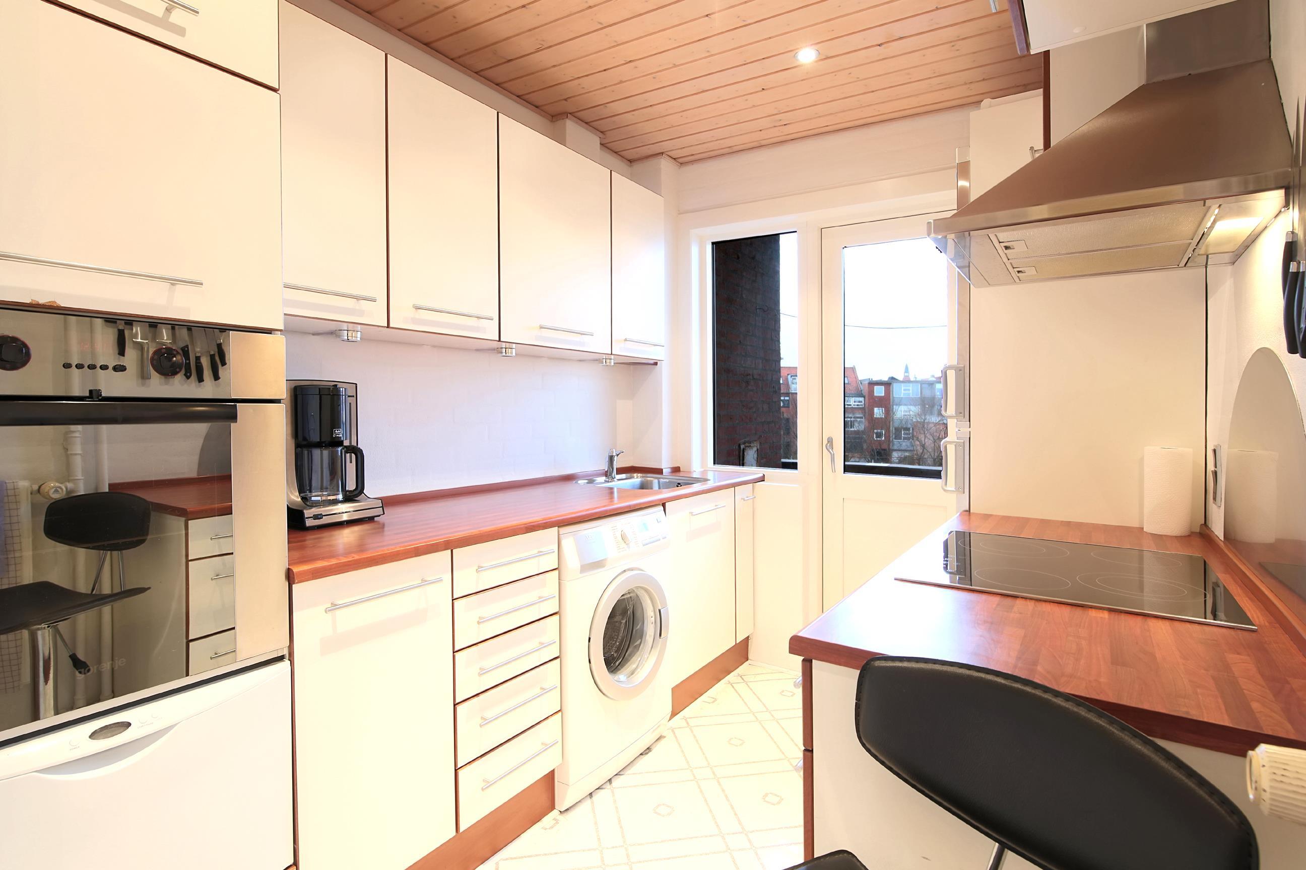 Veludstyret køkken med opvaskemaskine, kølefryseskab, komfur med ovn, emhætte. Udgang til en lille østvendt balkon.