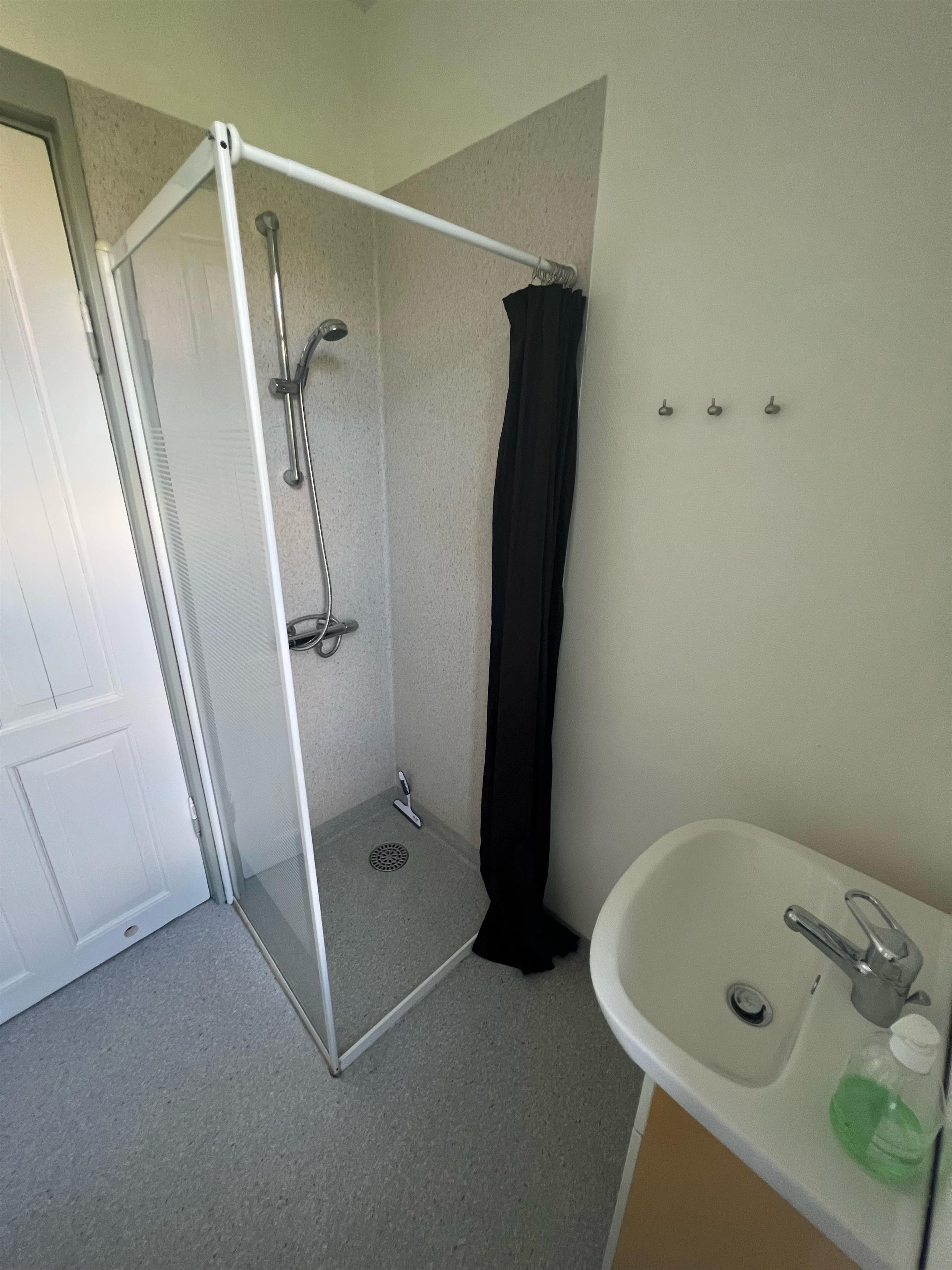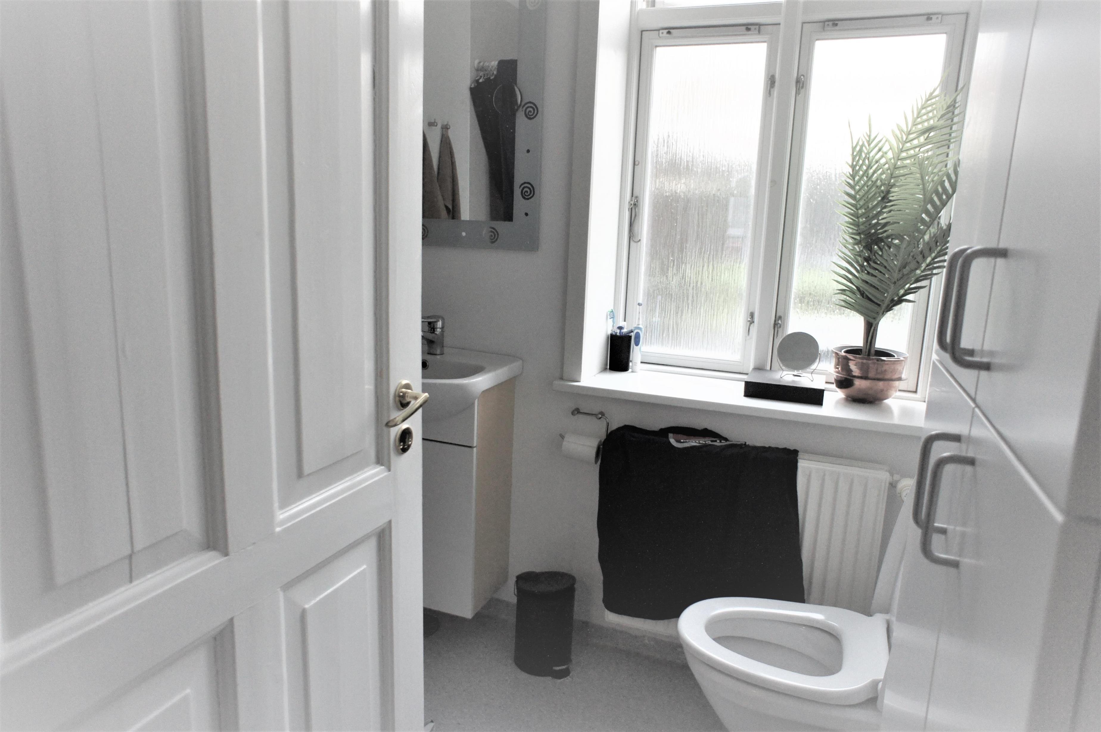 I lejligheden er et flisebeklædt badeværelse med håndvask, bruseniche og toilet.