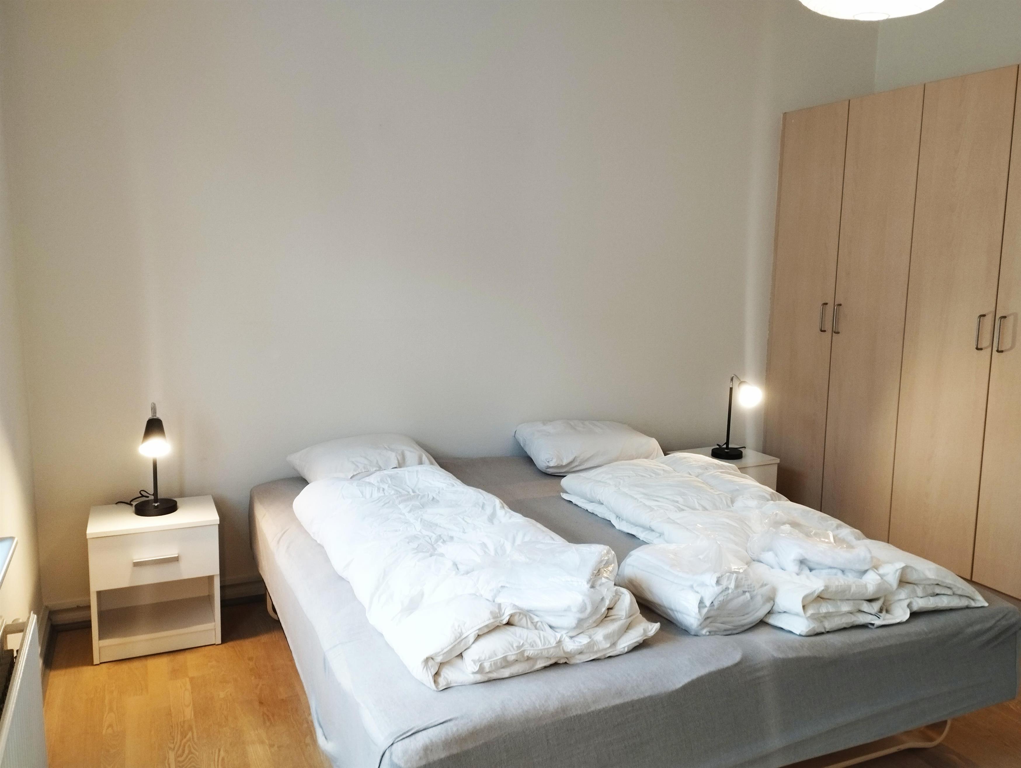 Soveværelse med dobbeltseng og klædeskab