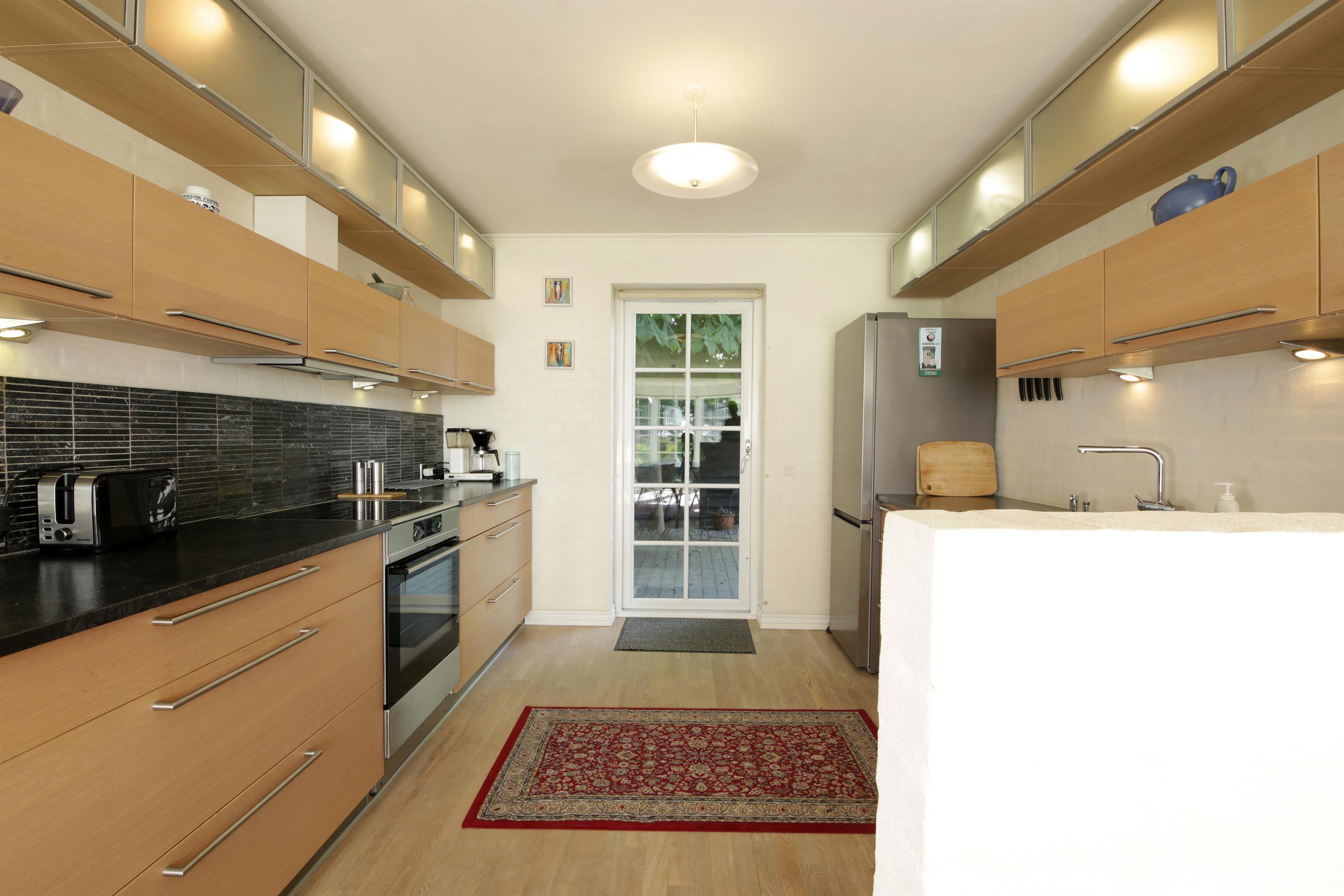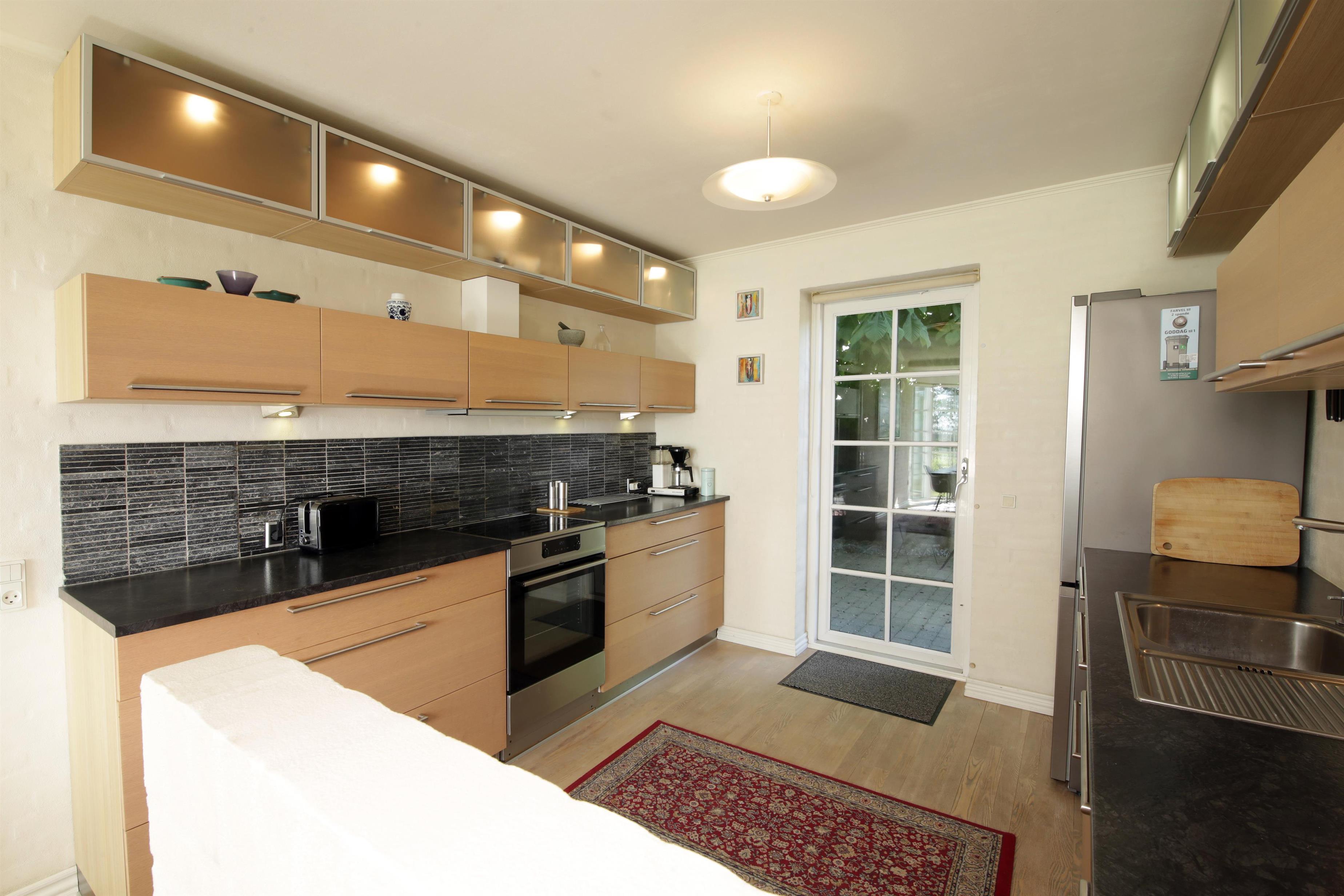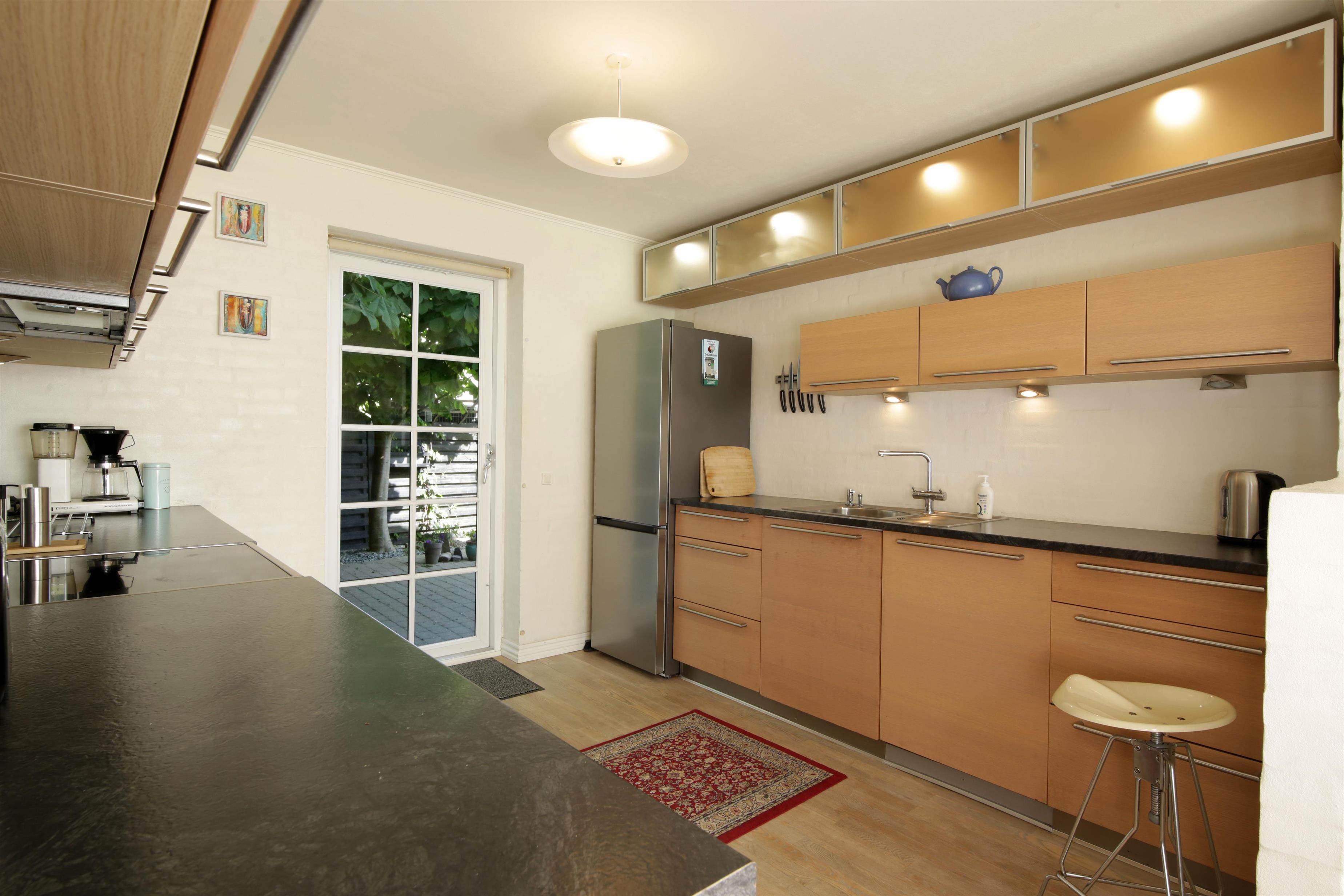 Køkkenet er udstyret med alle moderne hårde hvidevarer: opvaskemaskine, komfur med ovn, emhætte og køle/fryseskab.