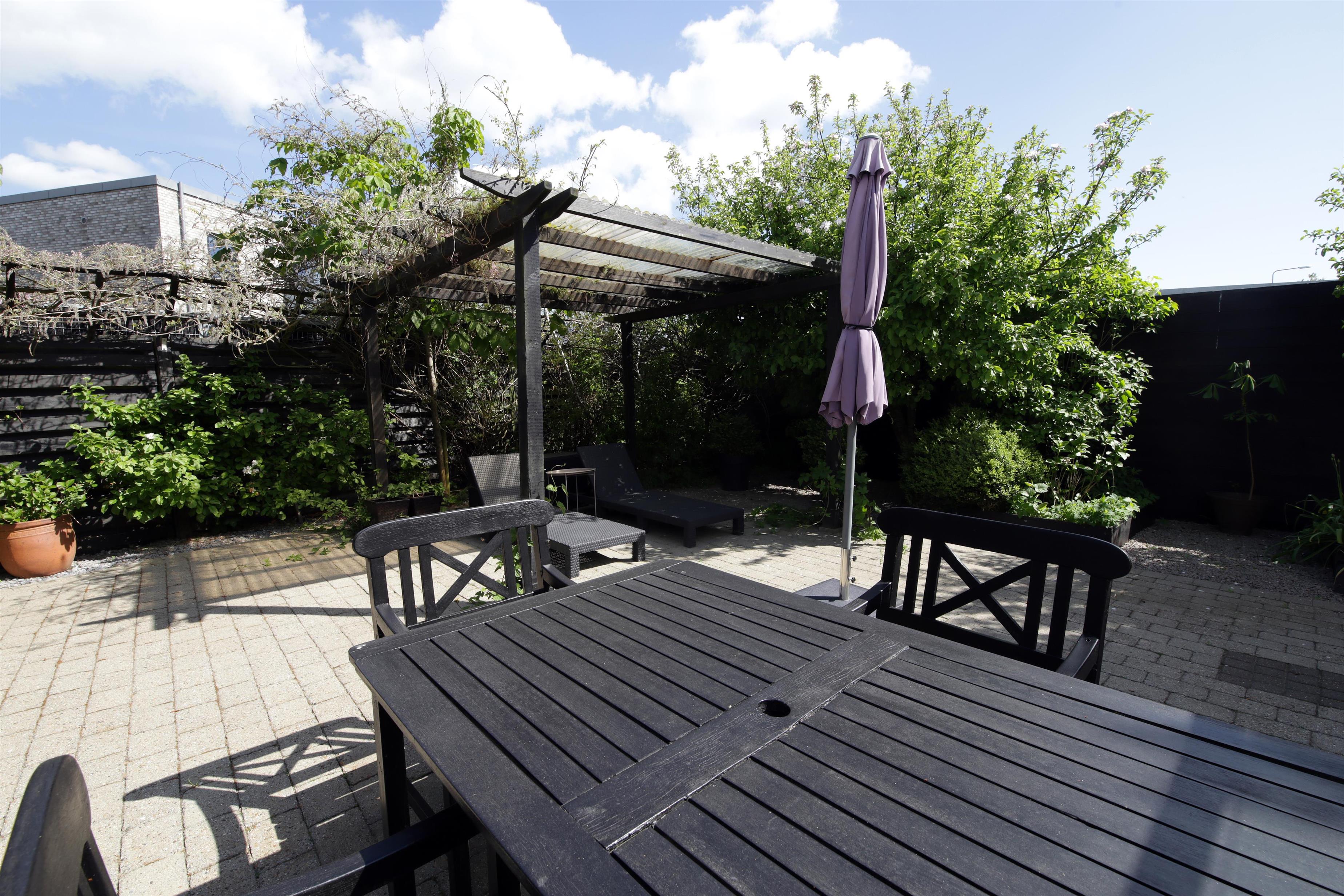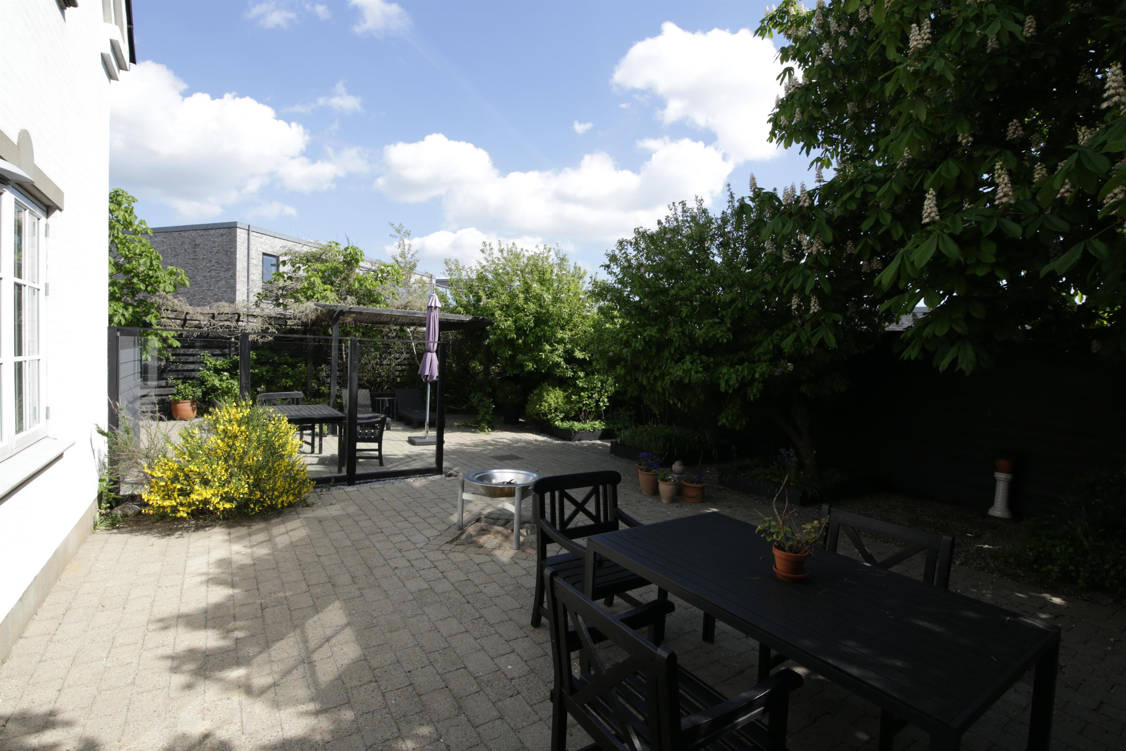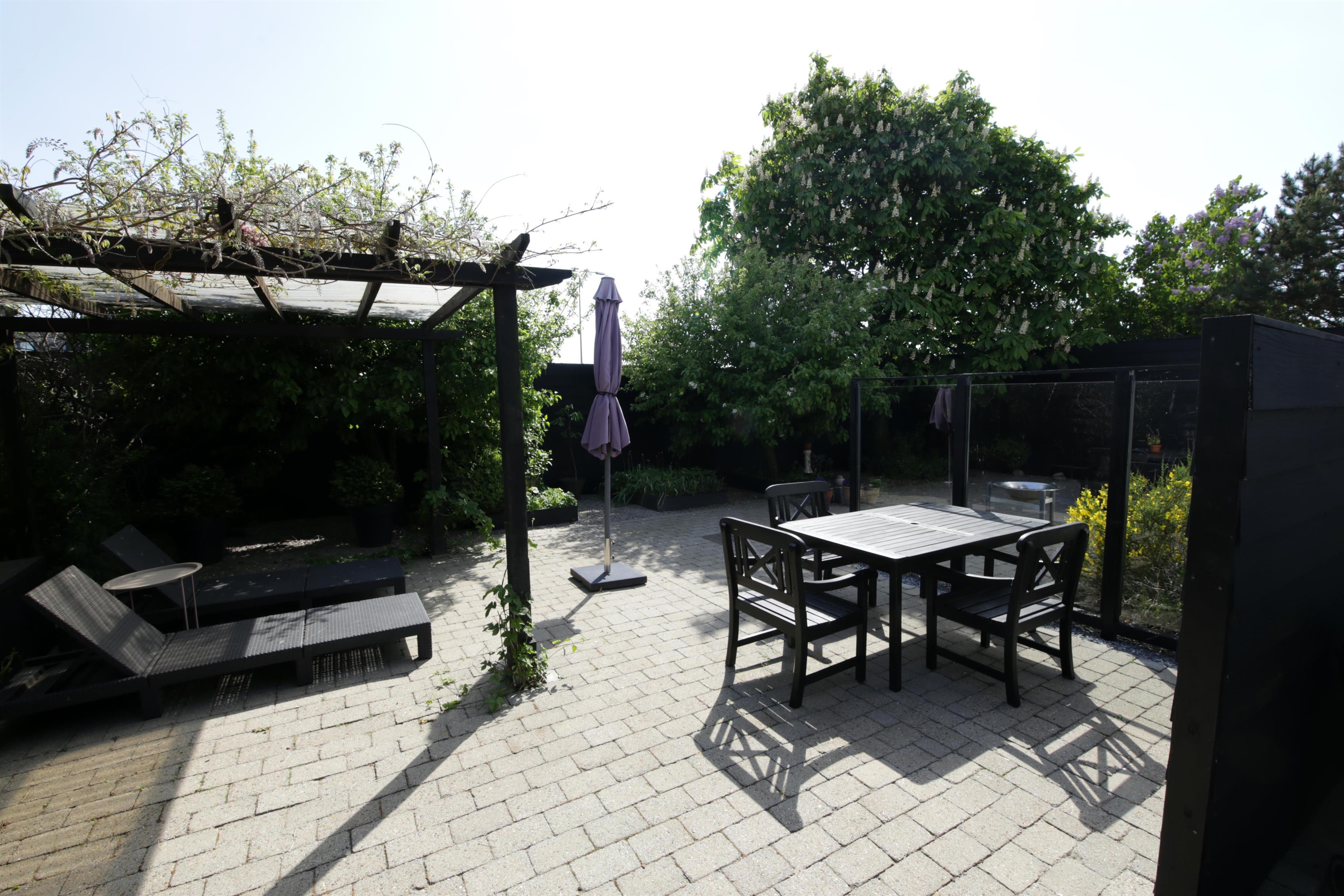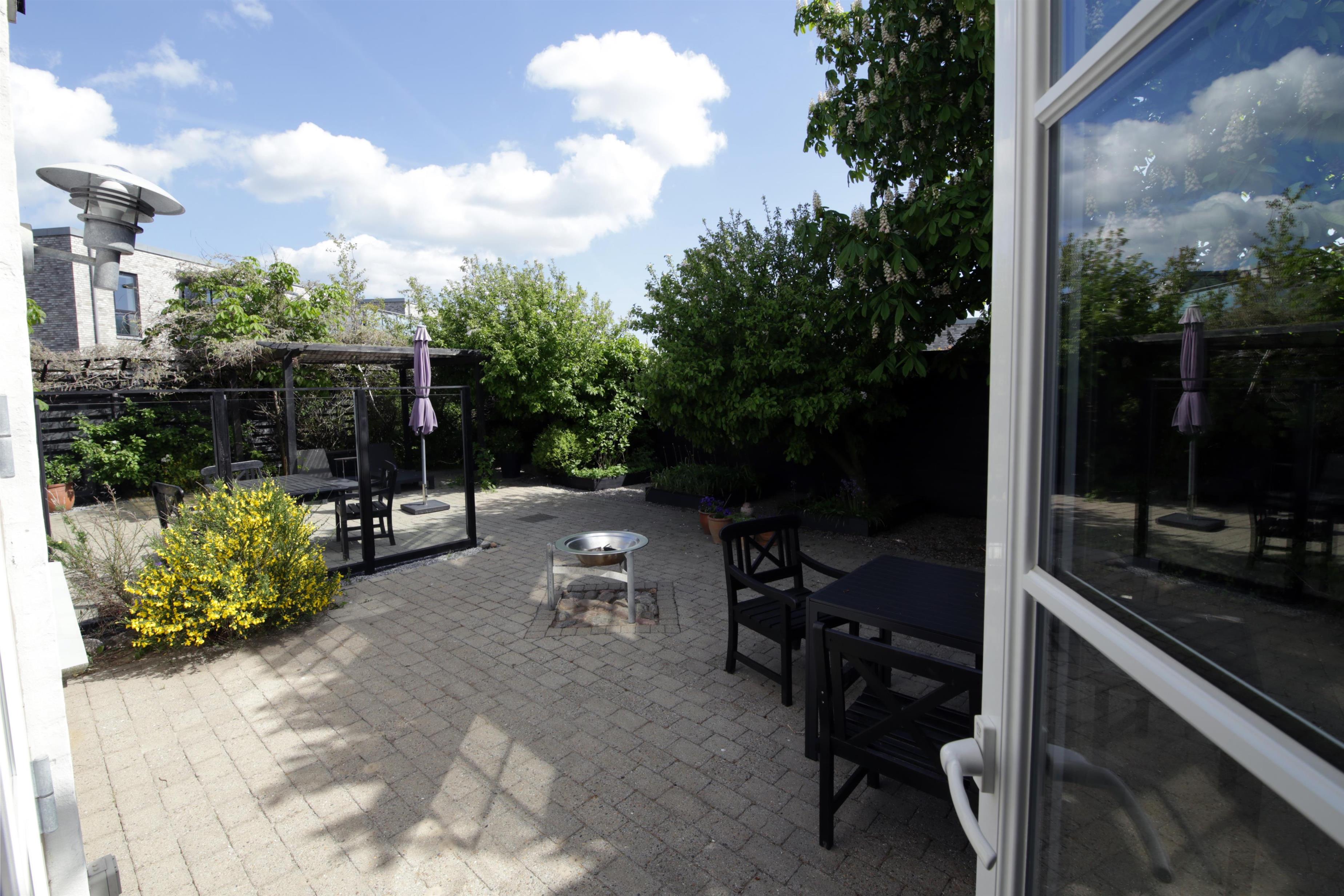 Lukket gårdhave med havemøbler, liggestole og grill. Gårdhaven er indrettet med en prydhave med stensætninger og dekorative buske og blomster.