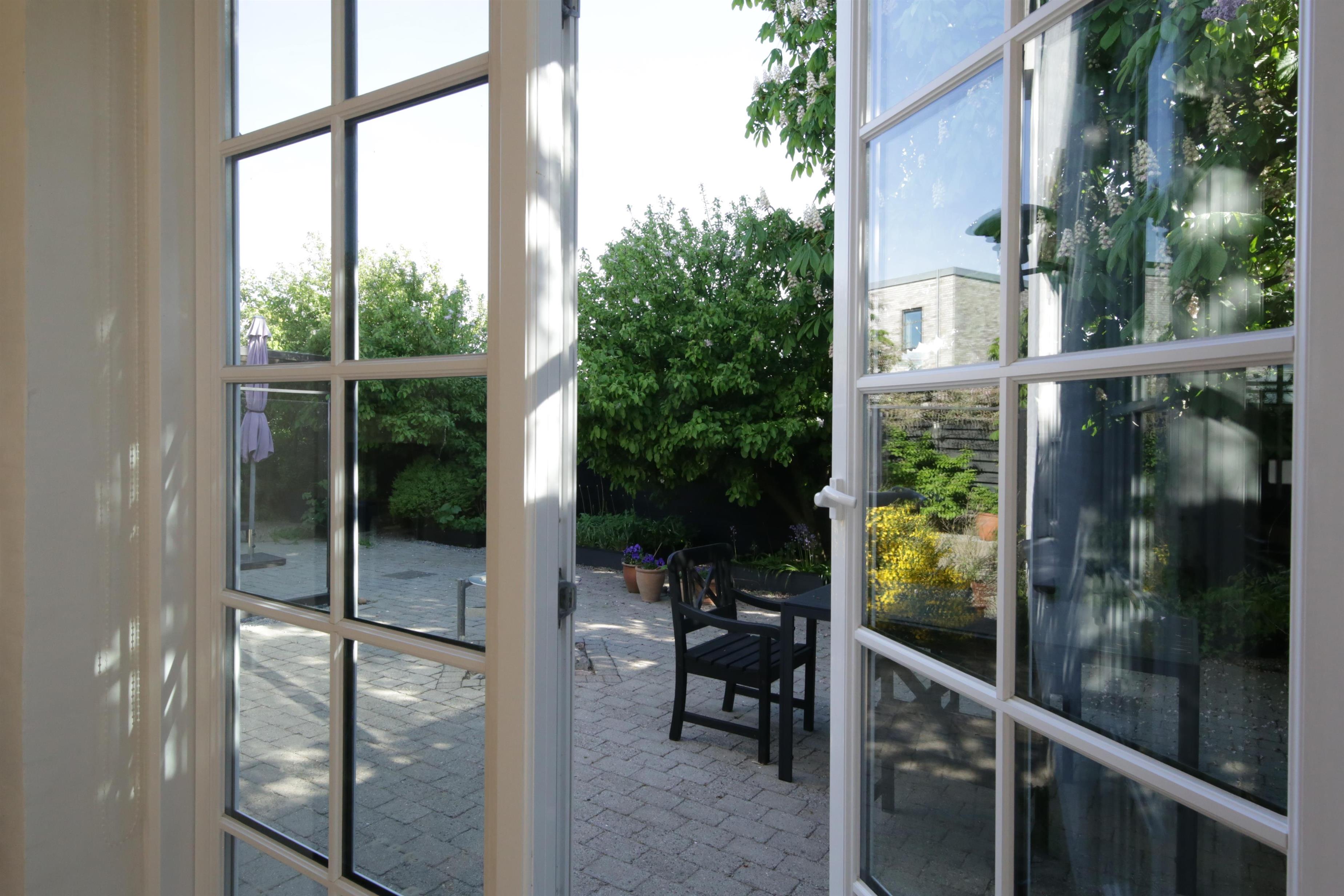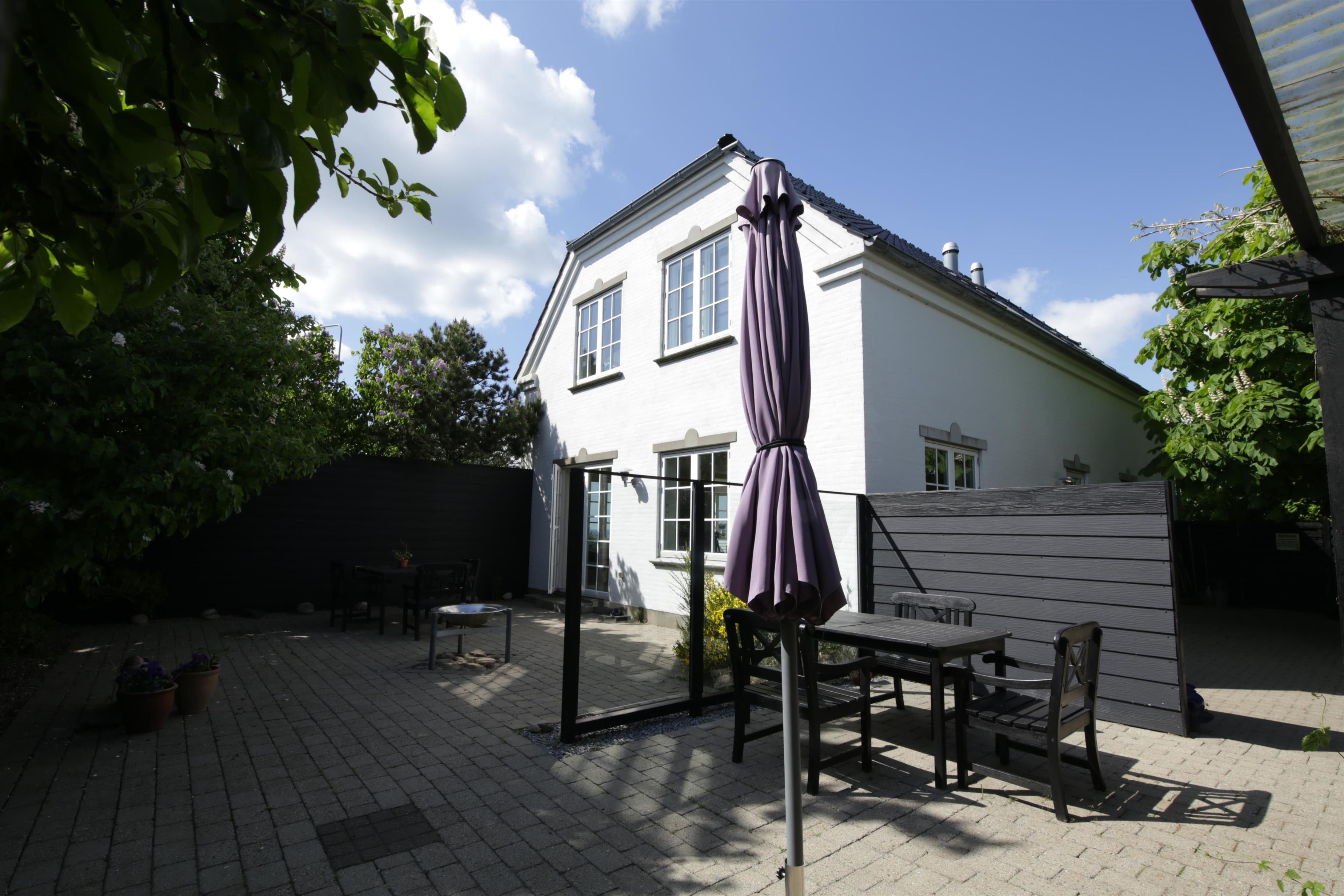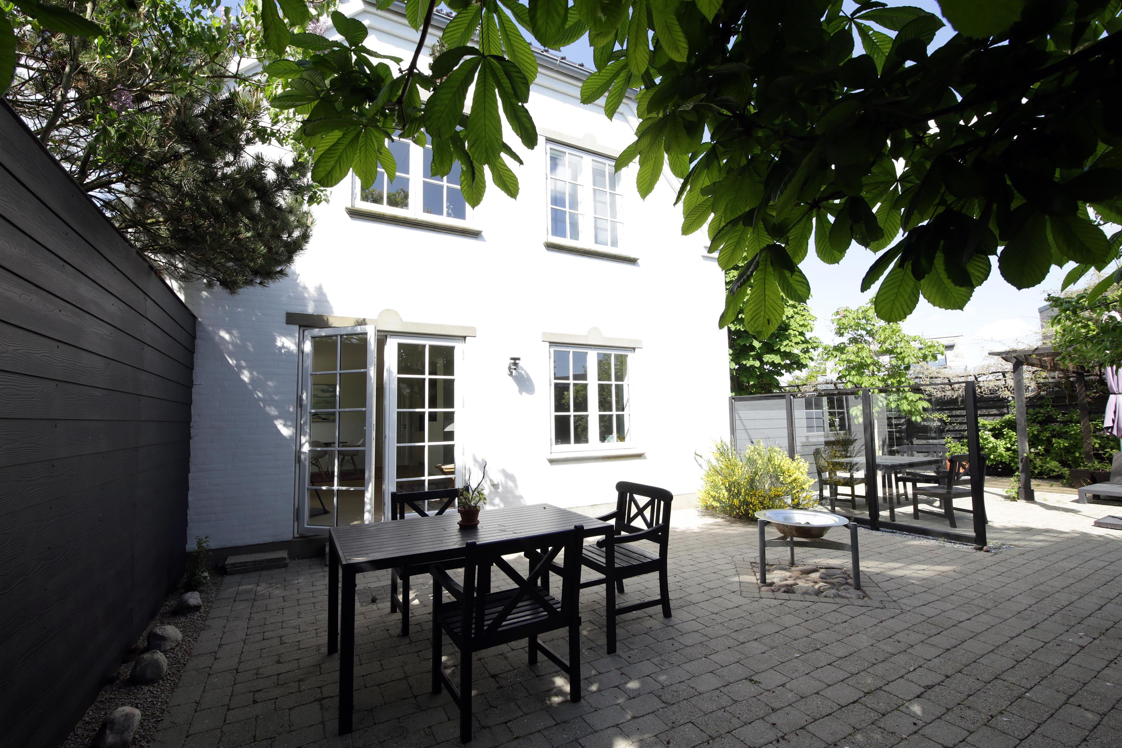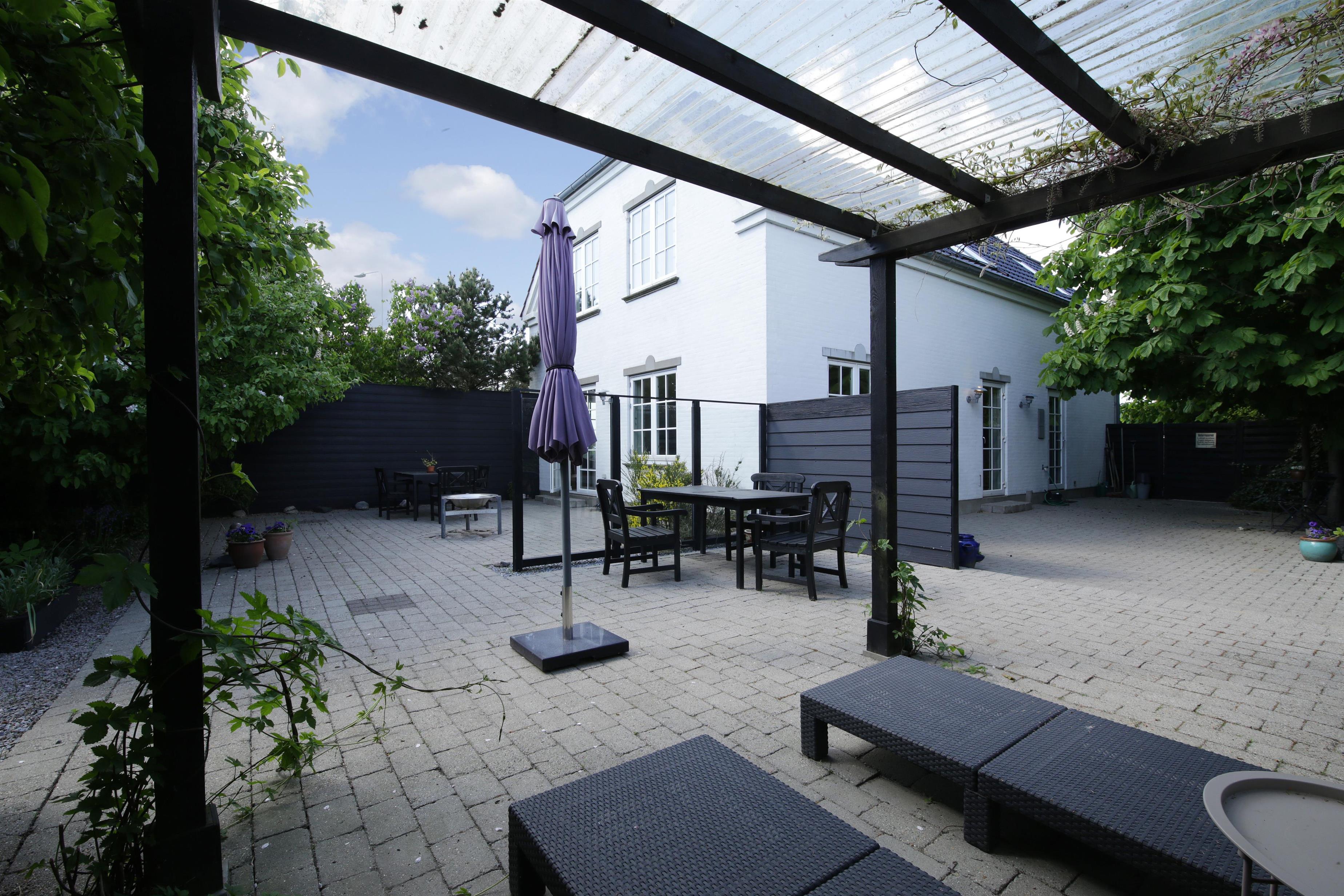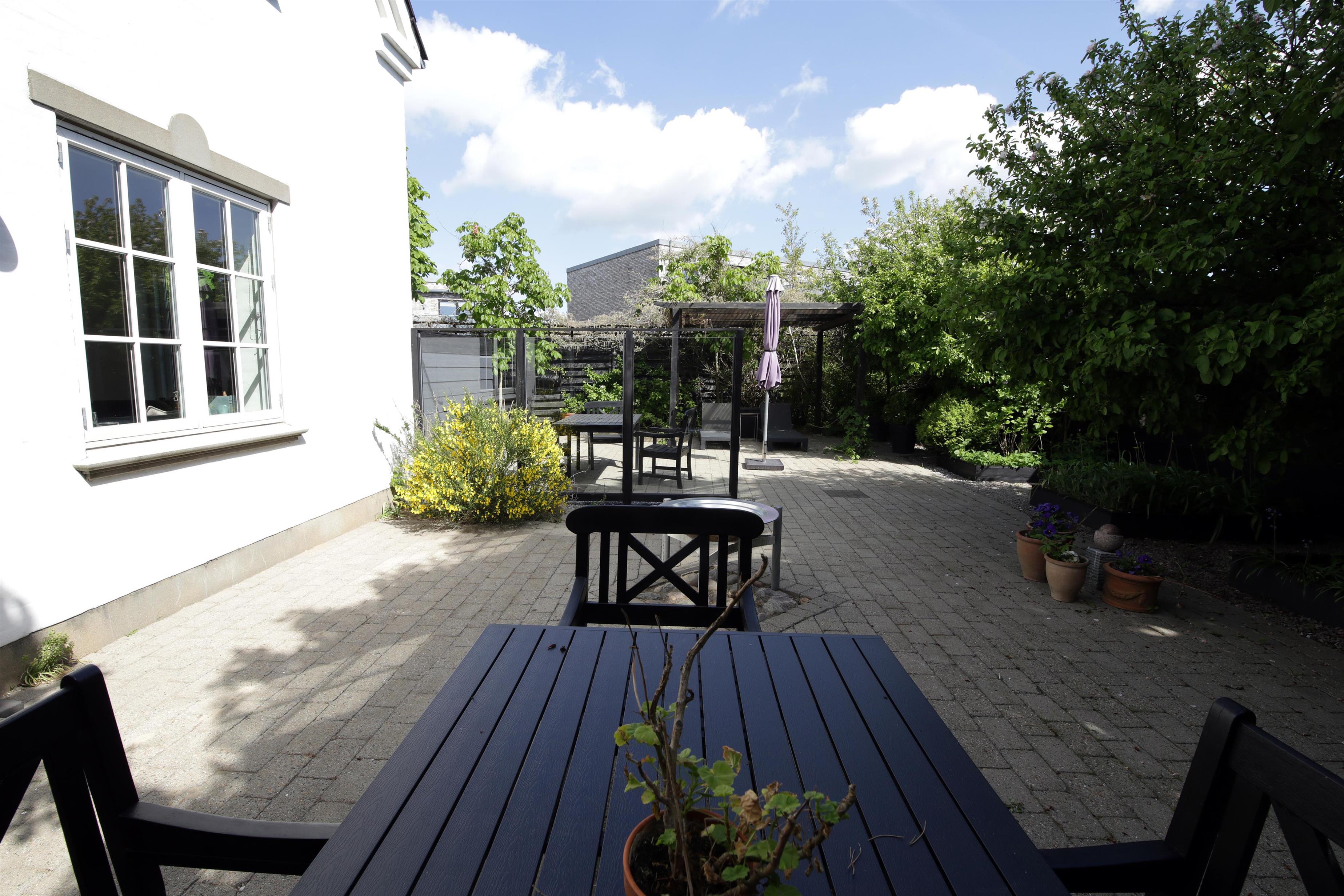 Lukket gårdhave med havemøbler, liggestole og grill. Gårdhaven er indrettet med en prydhave med stensætninger og dekorative buske og blomster.