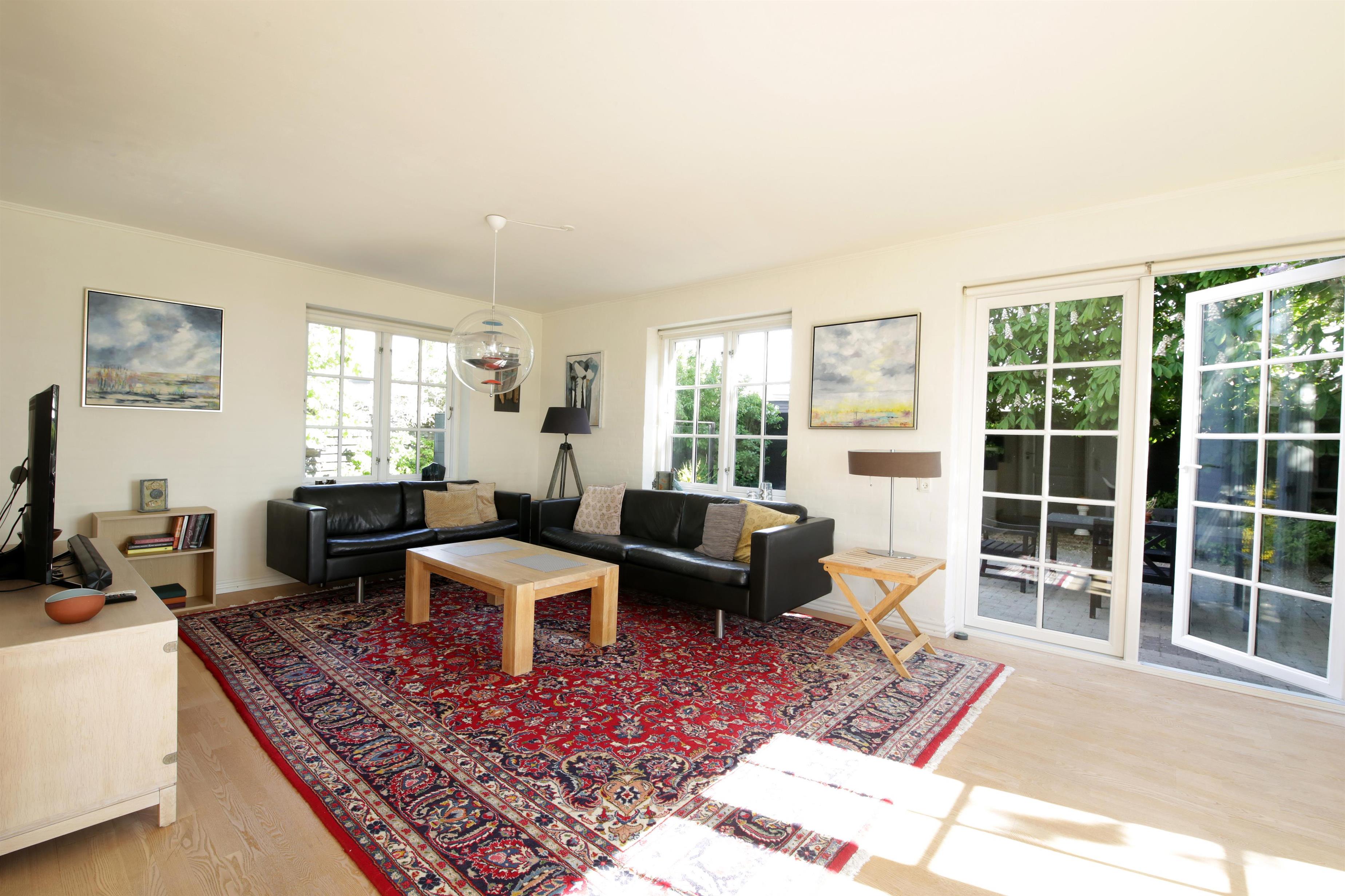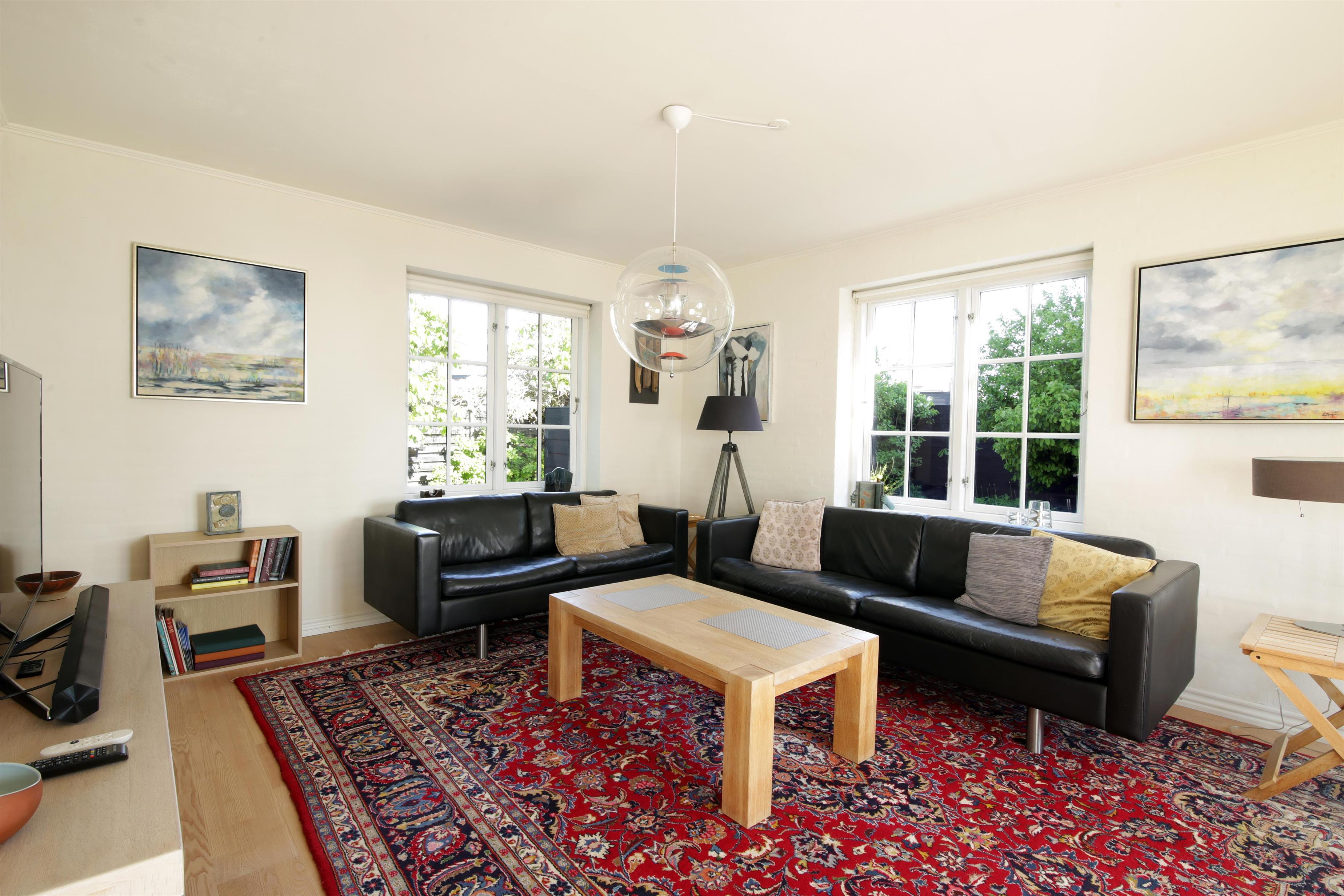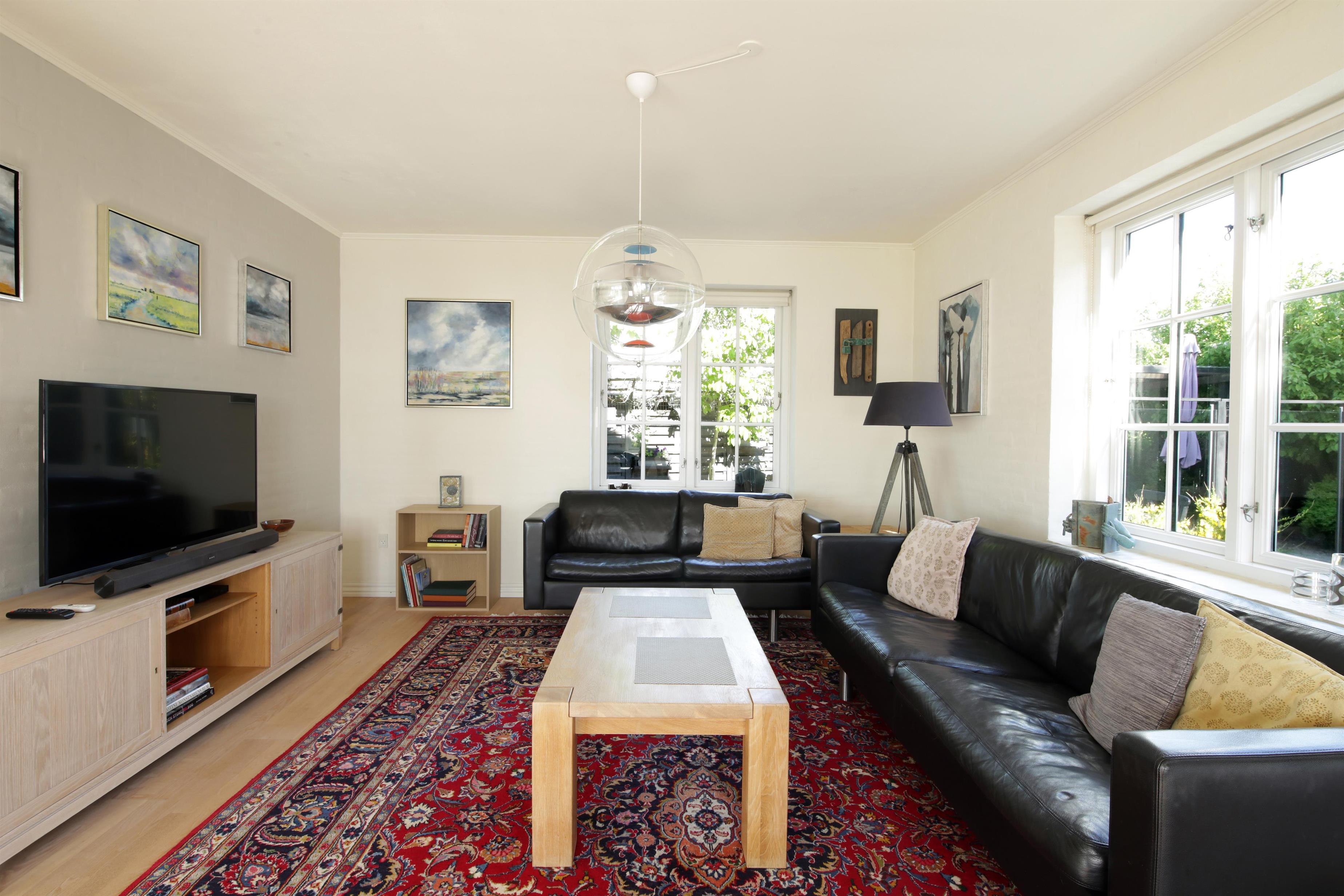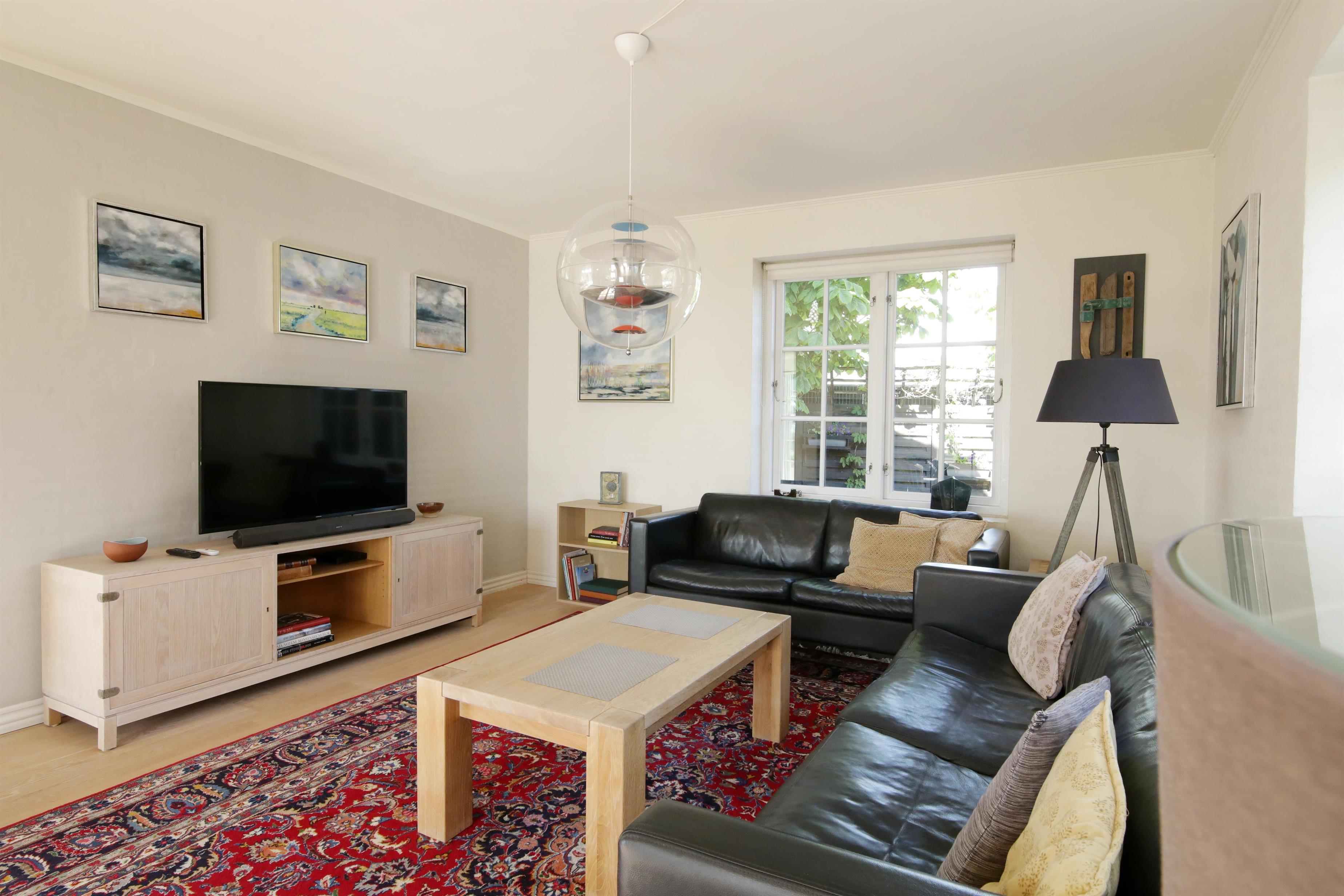 Opholdsstue med trægulv, lædersofa, wi-fi, tv og klimaanlæg.