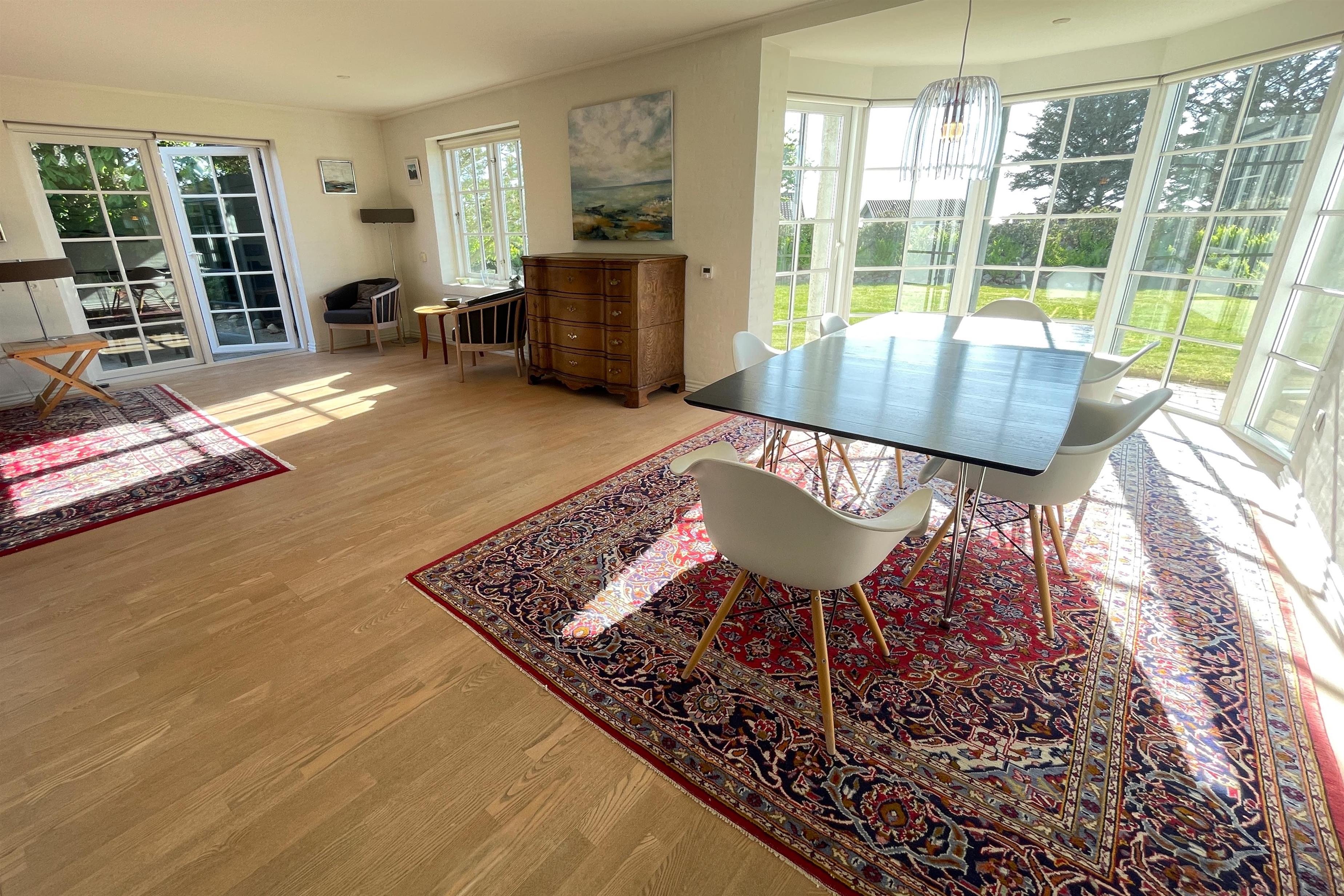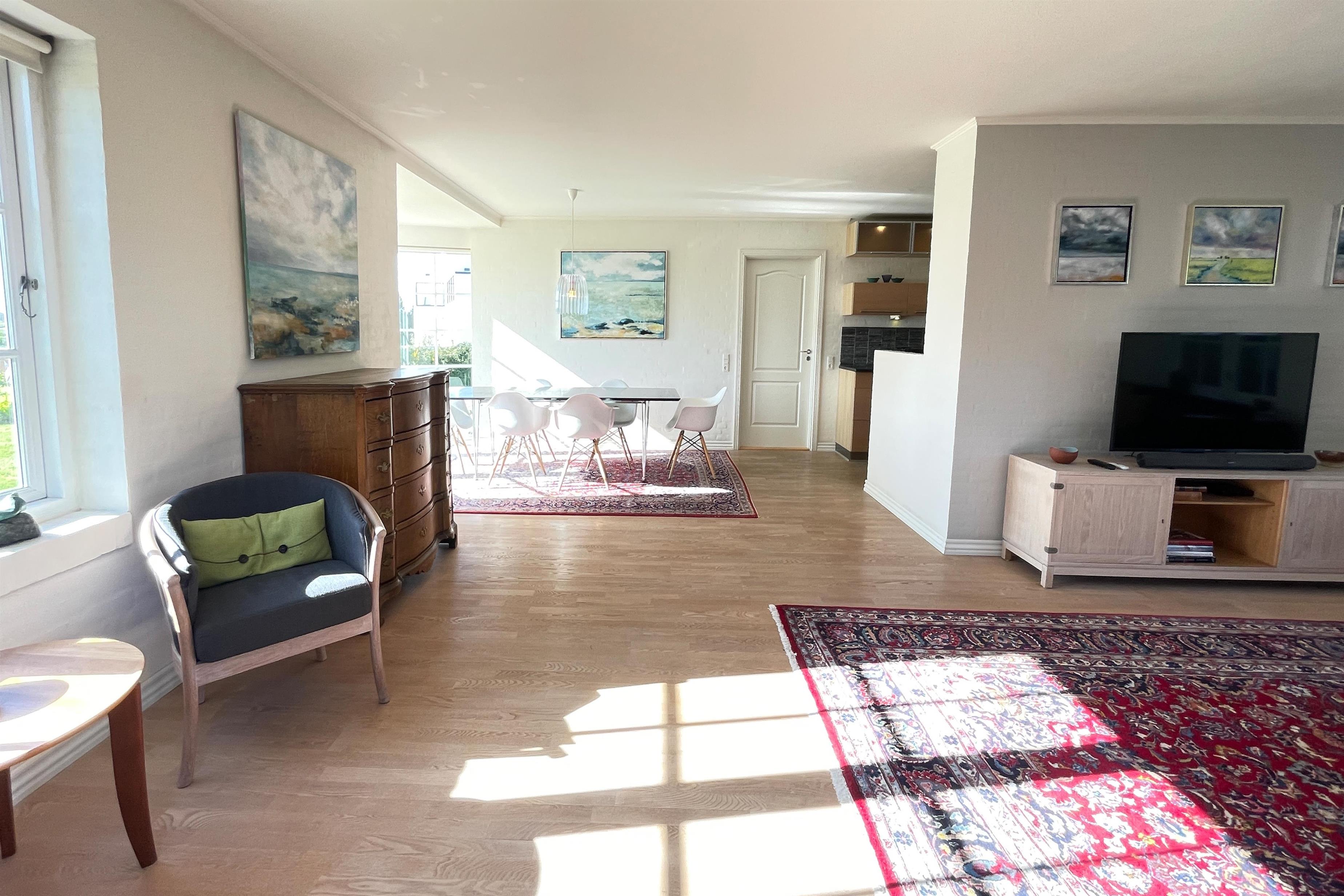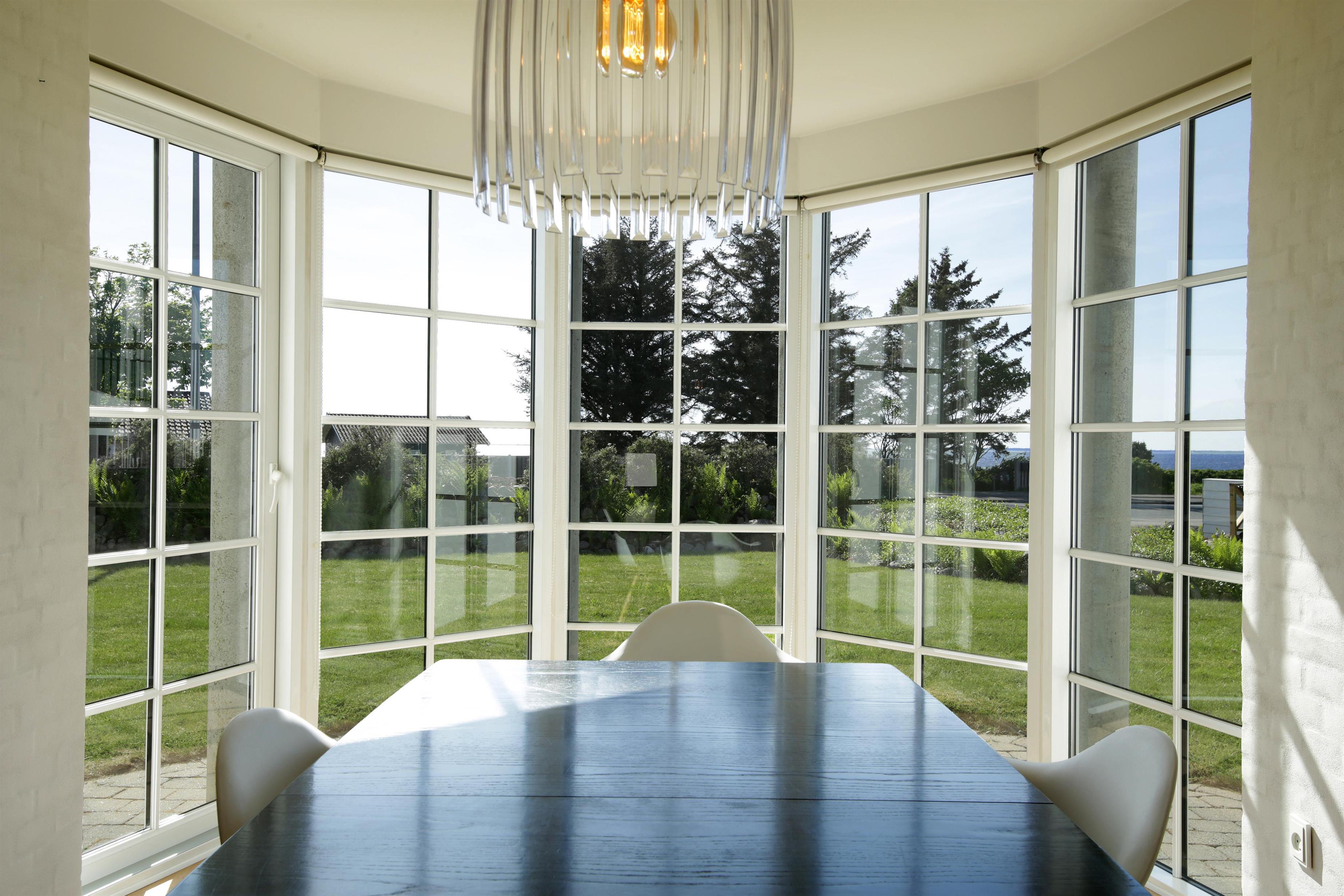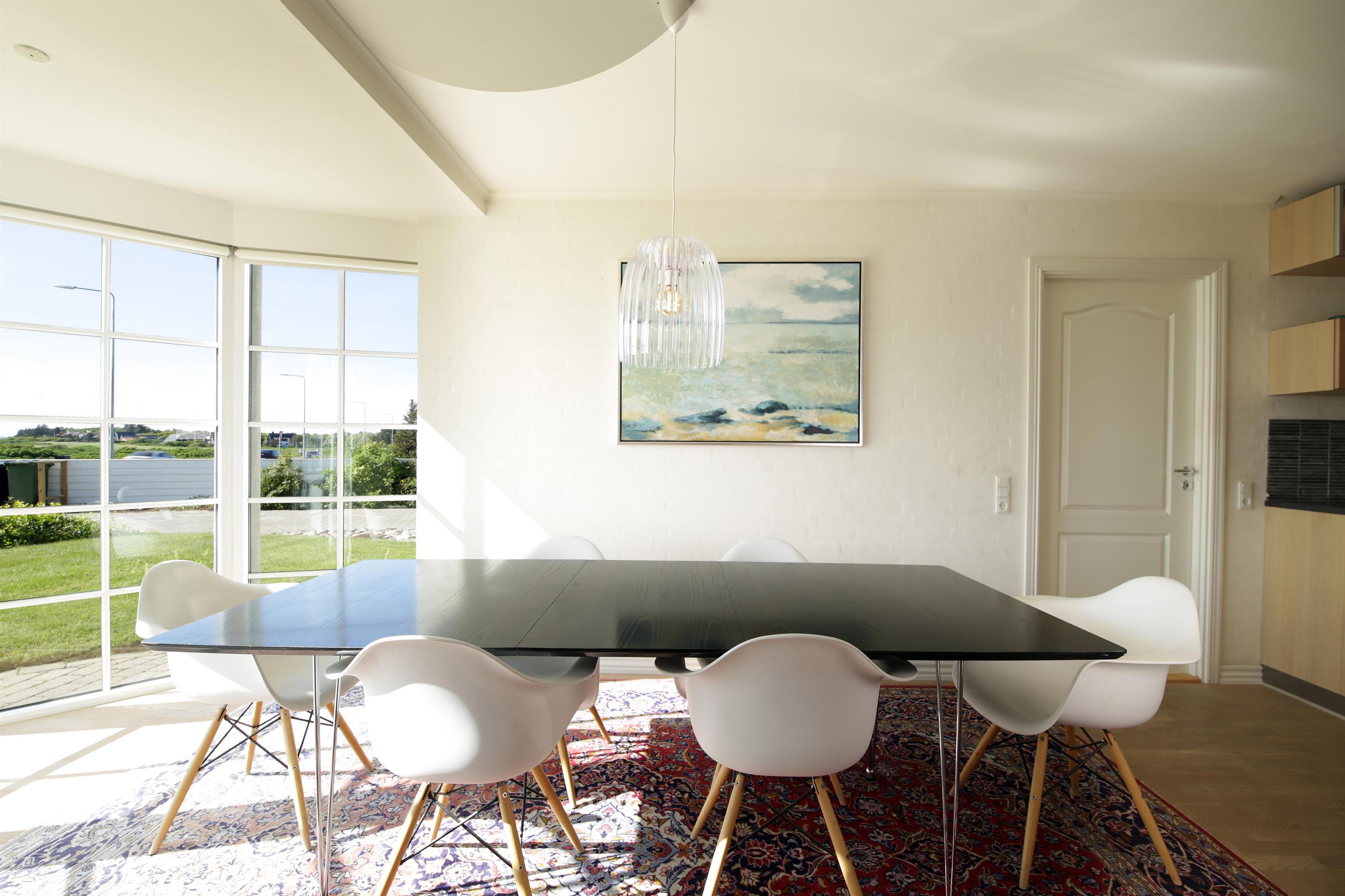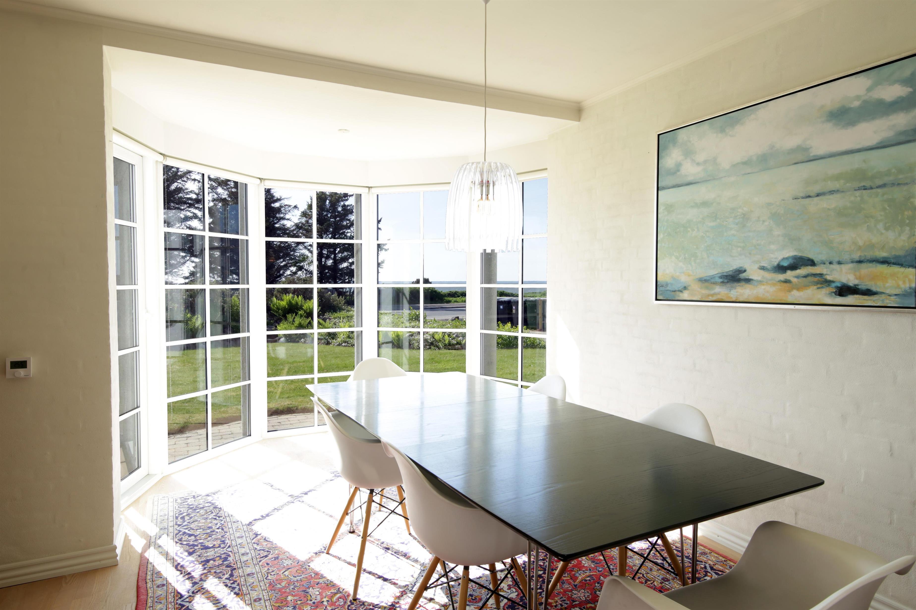 Spiseplads i åben forbindelse med et veludstyret køkken. Fra spisepladsen kan man følge skibstrafikken og livet på vandet med kite-surfere.