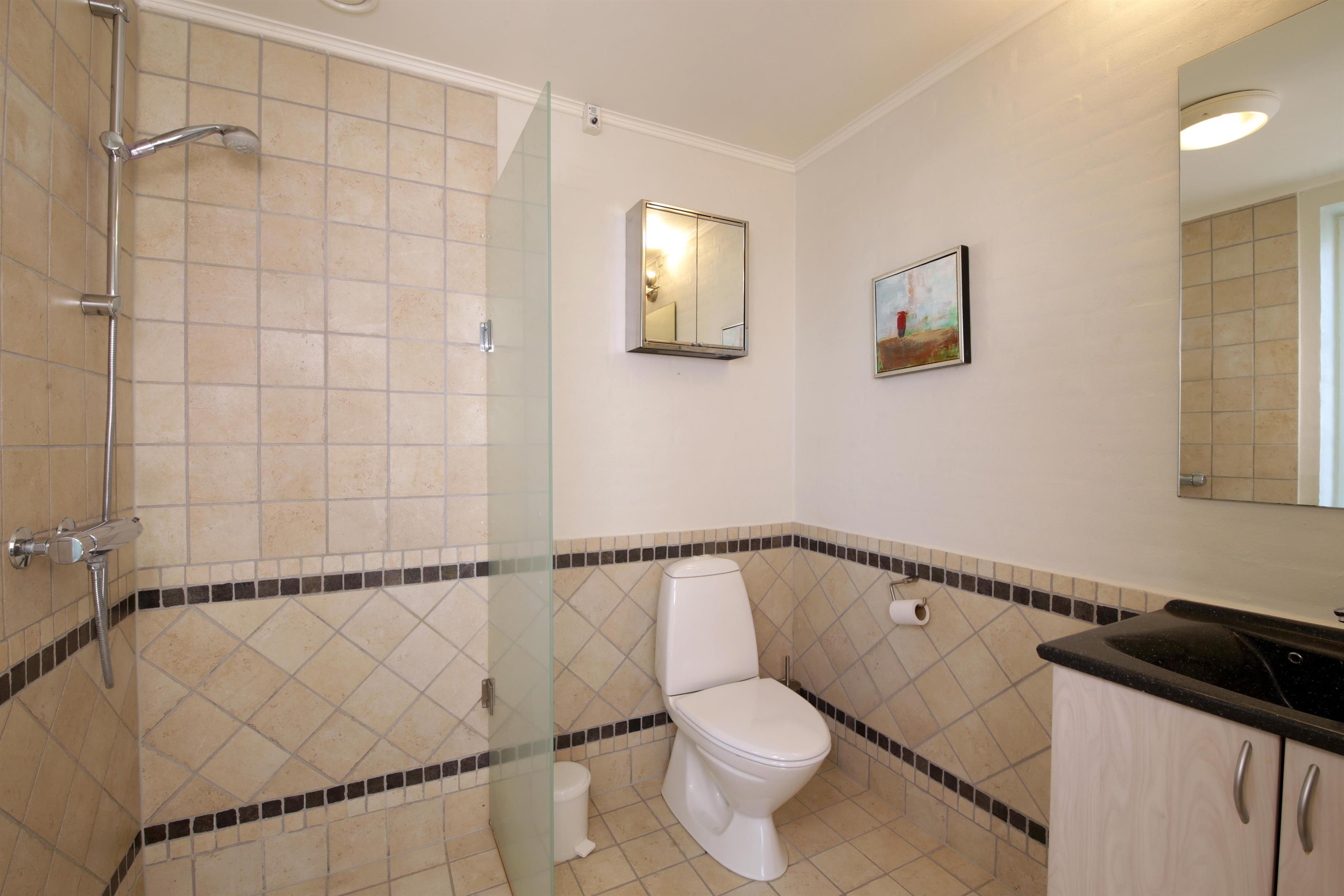 Moderne badeværelse i høj kvalitet med håndvask, bruseniche og toilet.