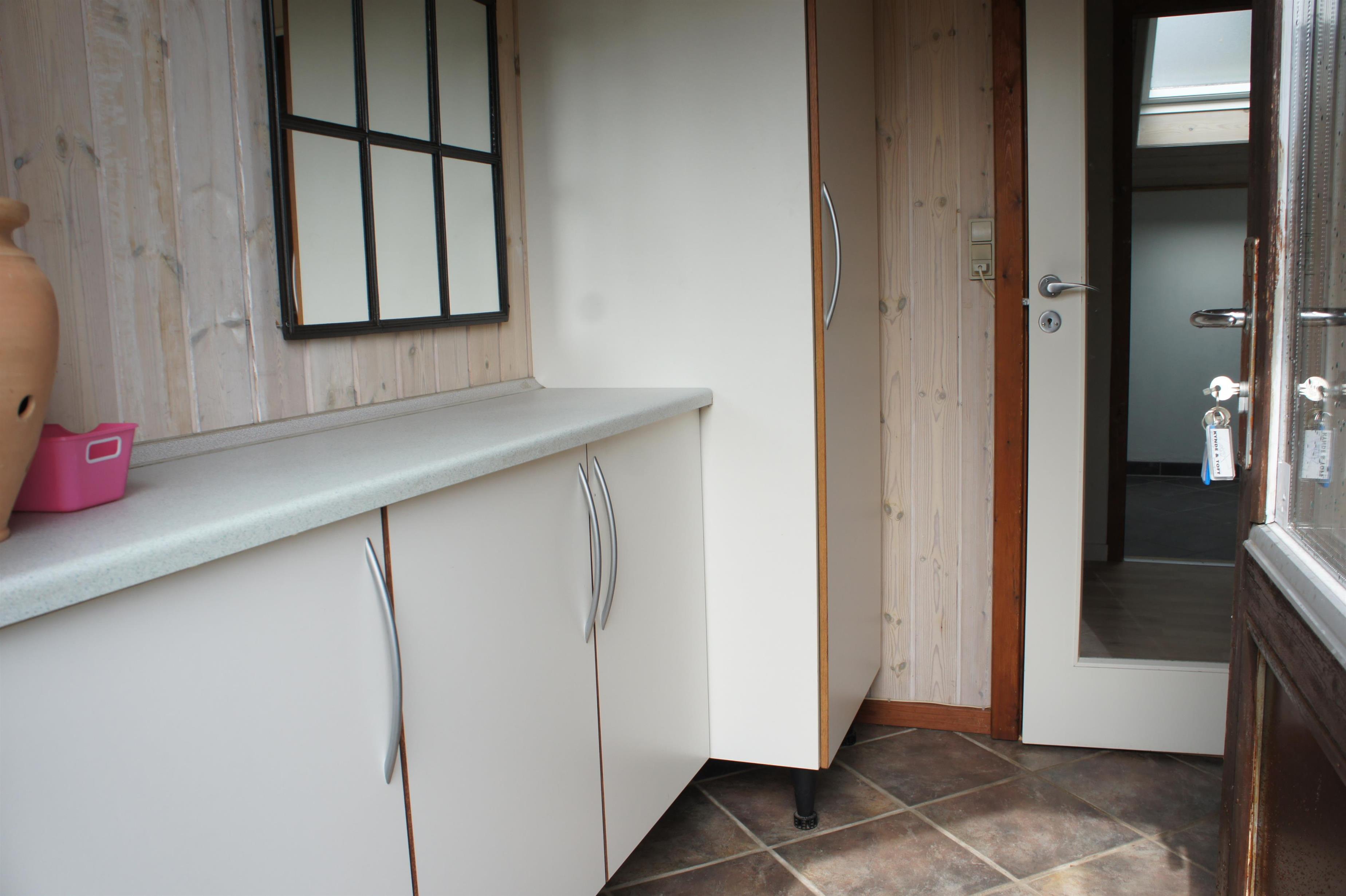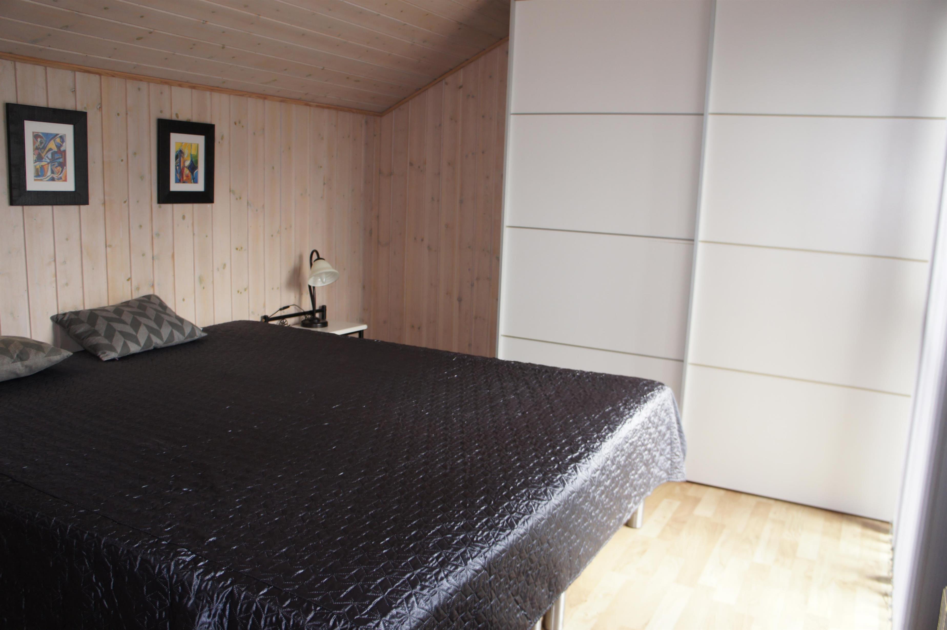 1: Dobbeltseng (160 x 200), skabsplads og udgang til terrasse.