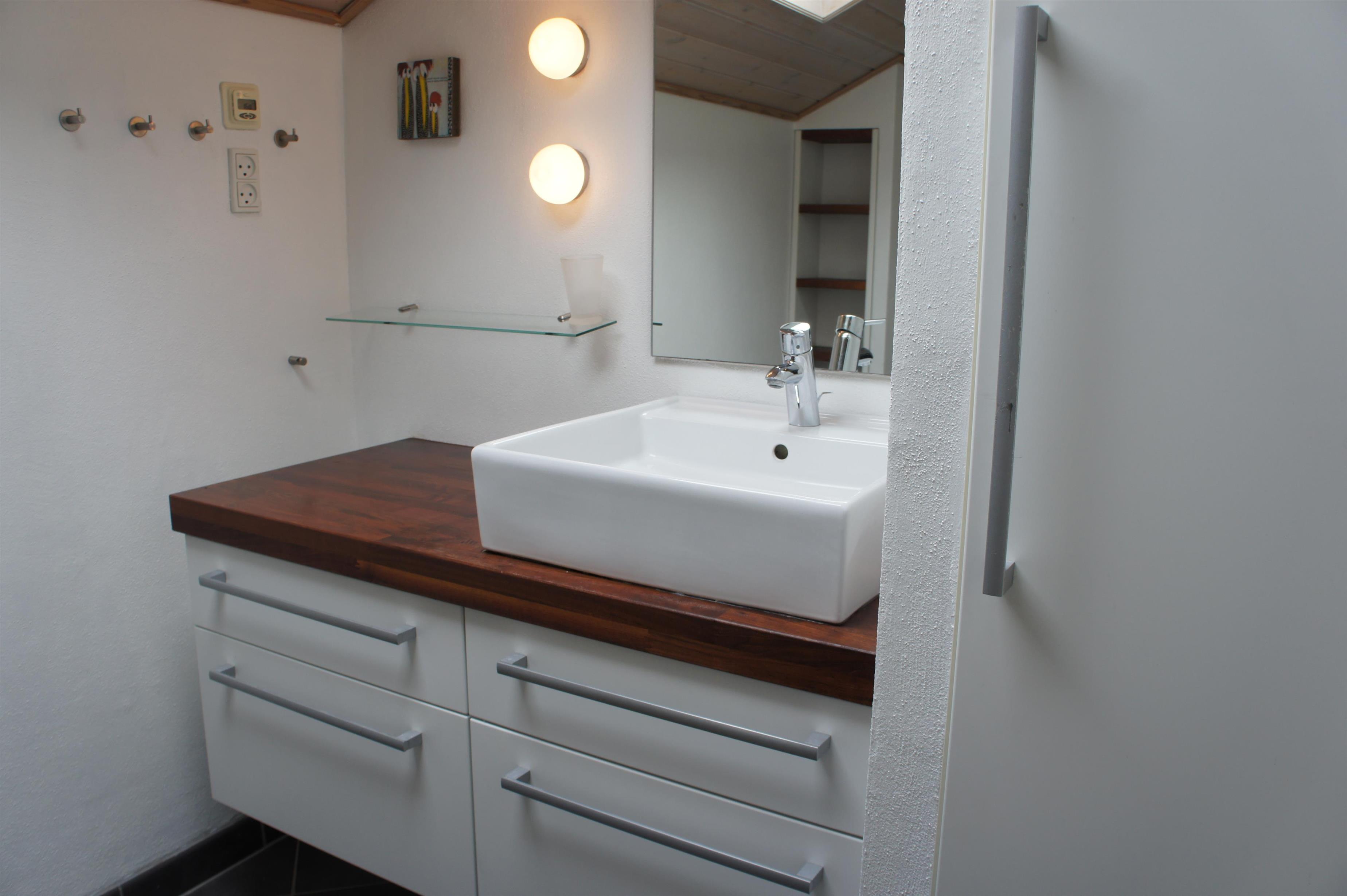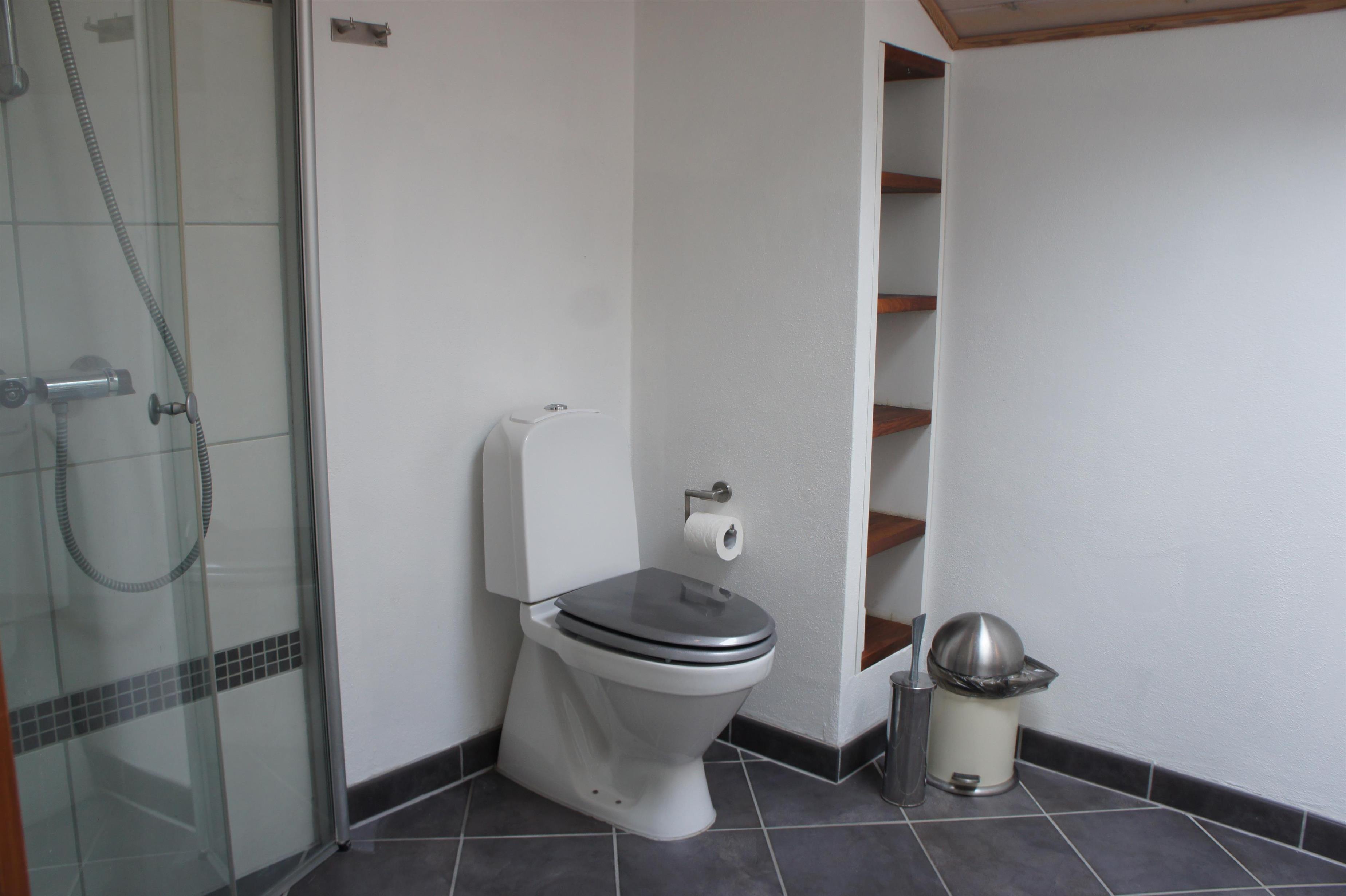 Badeværelse med håndvask, toilet, bruseniche.