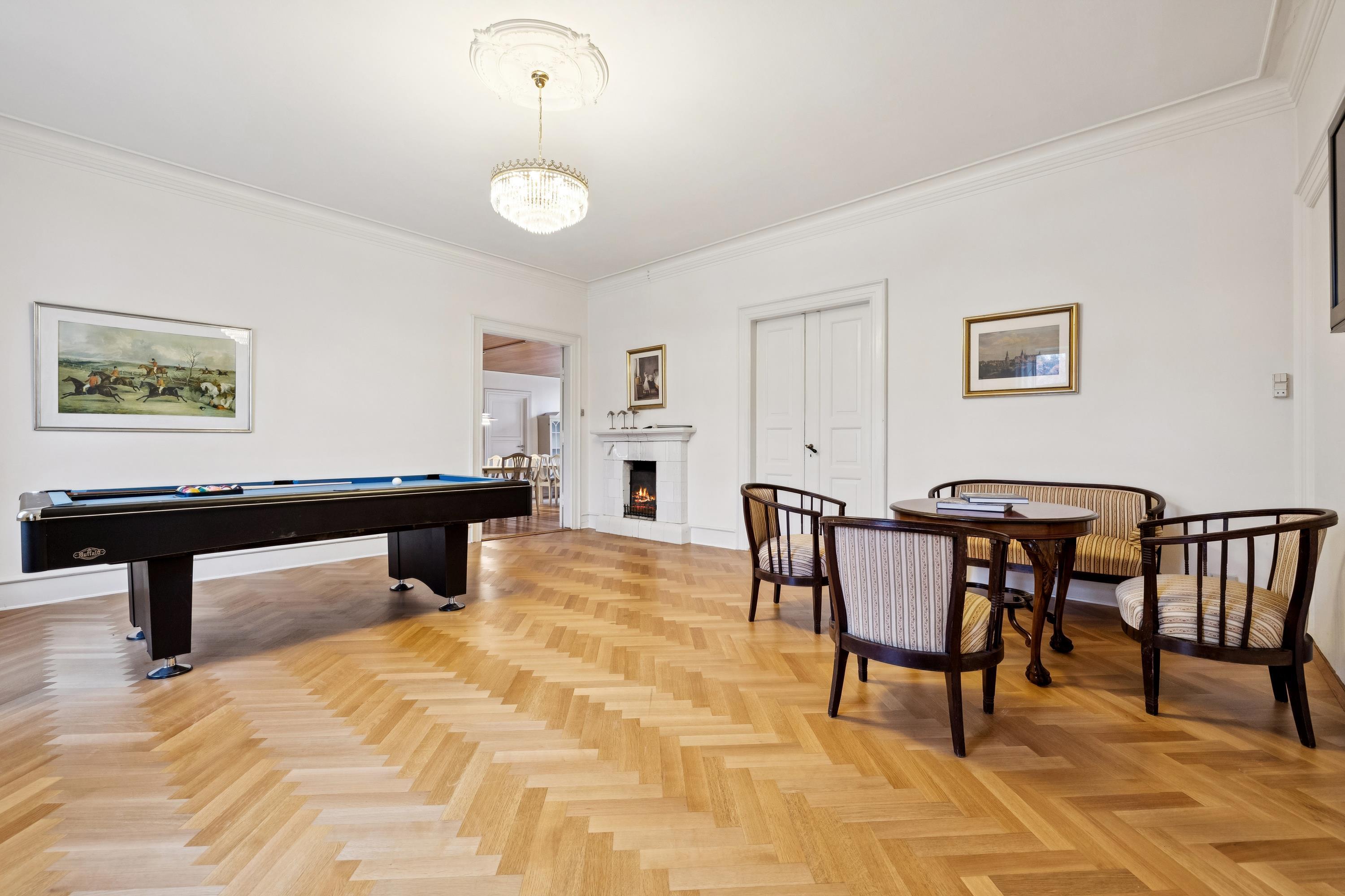 Hovedhuset emmer af herskabelig elegance med højt til loftet, store opholdsrum og panoramavinduer med udsigt over vandet. Her kan 28 gæster overnatte fordelt på otte soveværelser, og samtidig nyde den store stue, havestuen med direkte udgang til haven, billardbordet og hyggelige krog med legetøj til børnene. Atmosfæren er både luftig, elegant og hjemlig – perfekt til samvær, måltider og afslapning.