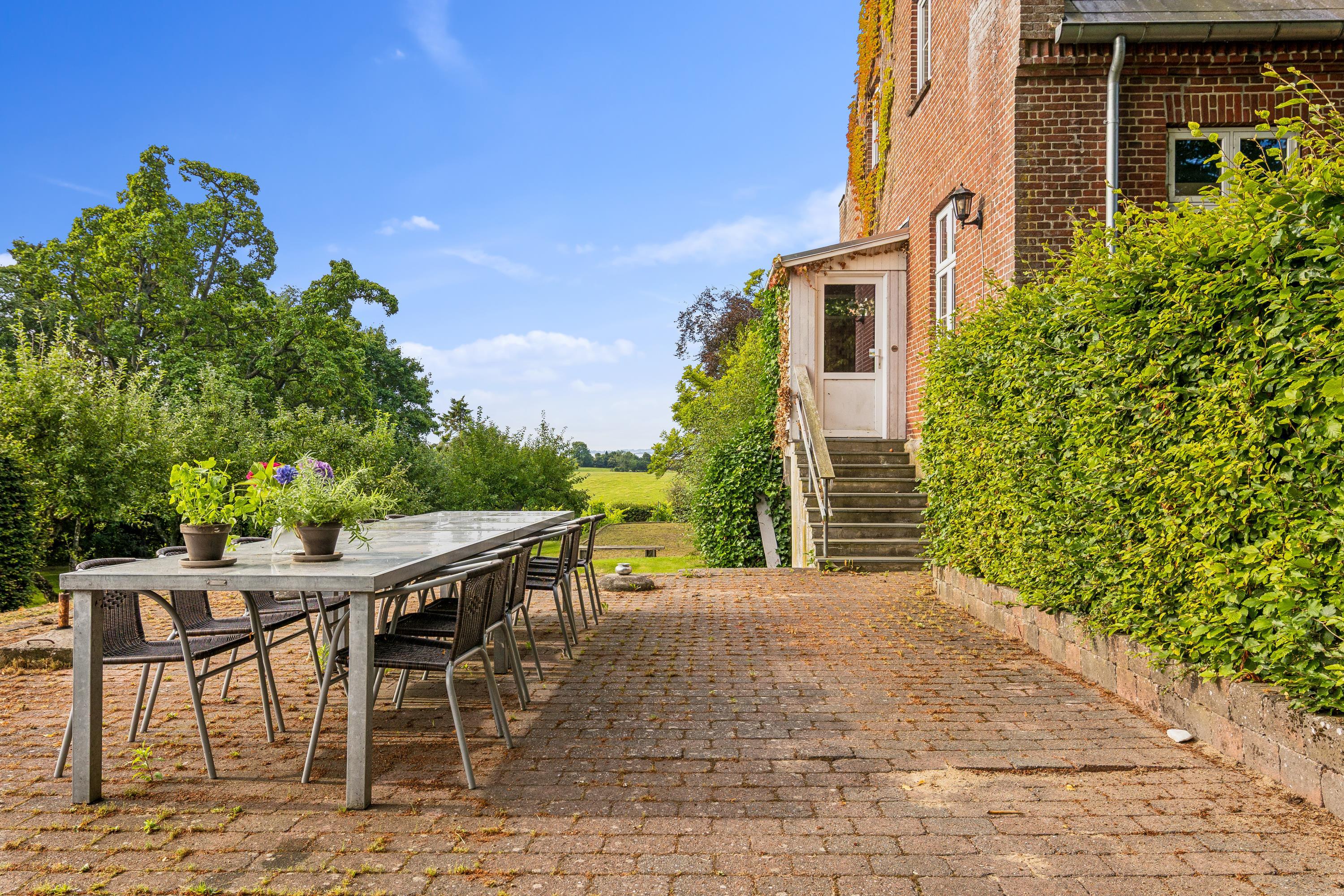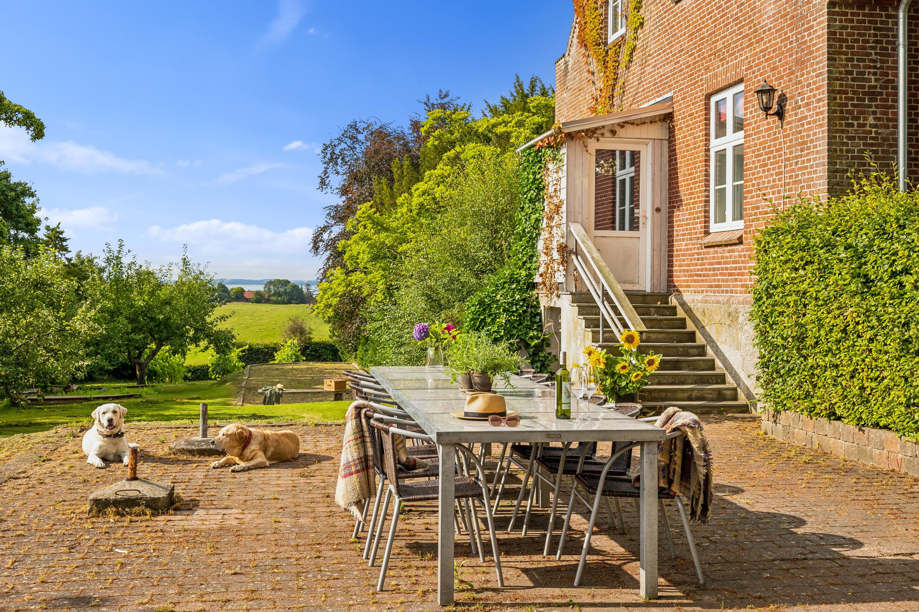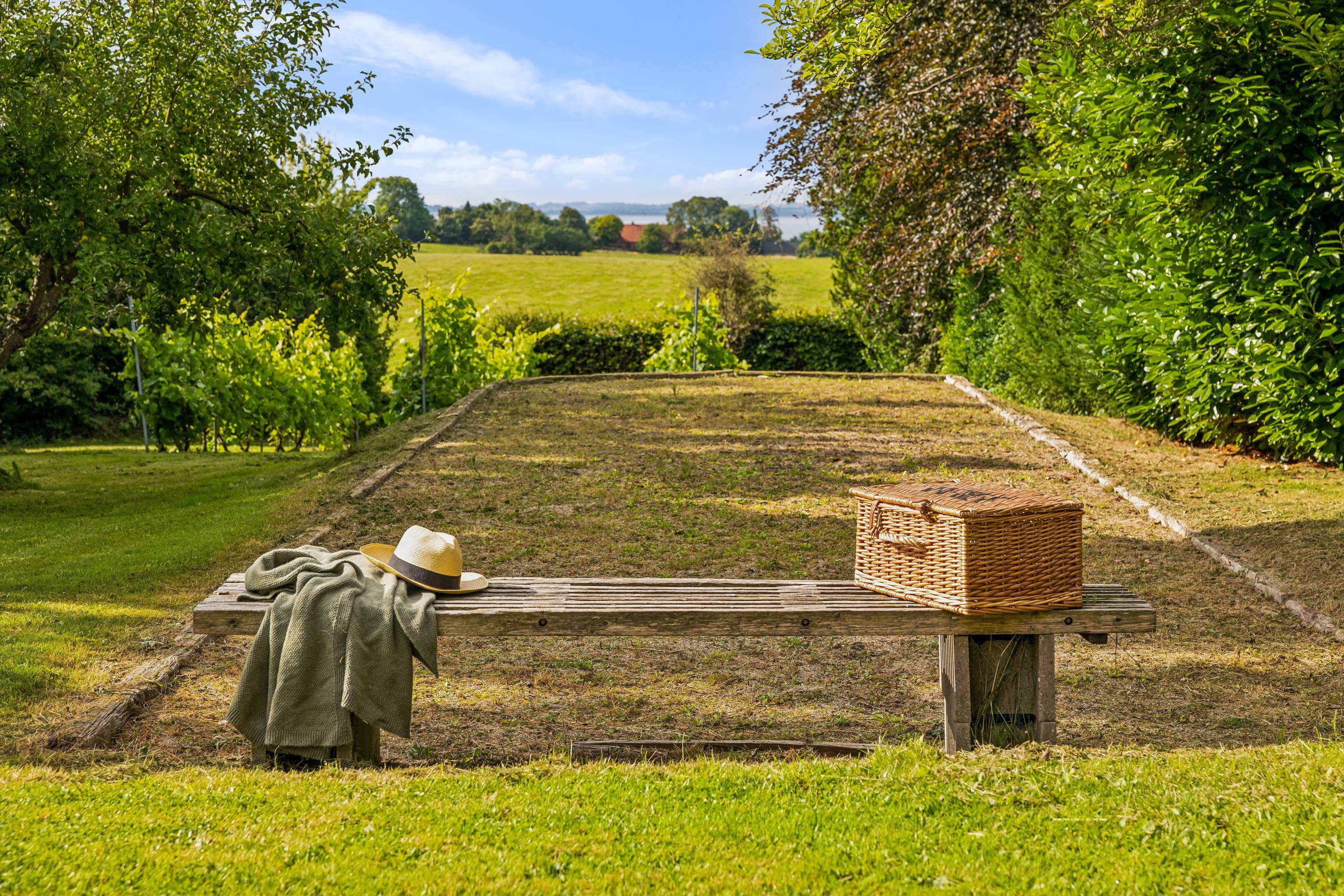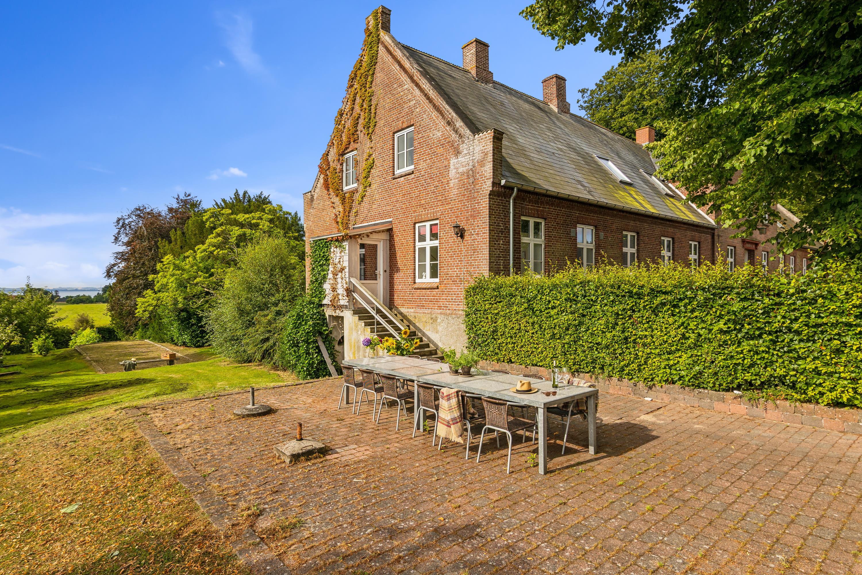 I Hovedbygningen er der plads til 26 personer, og så er der en dejlig, stor terrasse med udsigt ud over Kaløvig. Her er der desuden petanquebane, gynger, legehus og sandkasse samt adgang til fodboldbane og frugthave, og der er altså altid noget at give sig til – uanset om man er voksen eller barn.