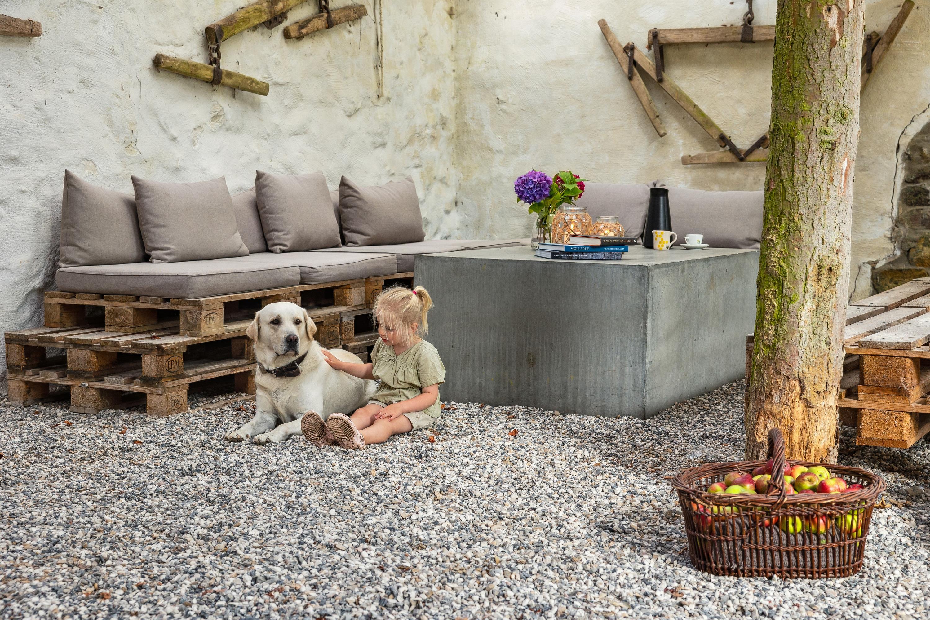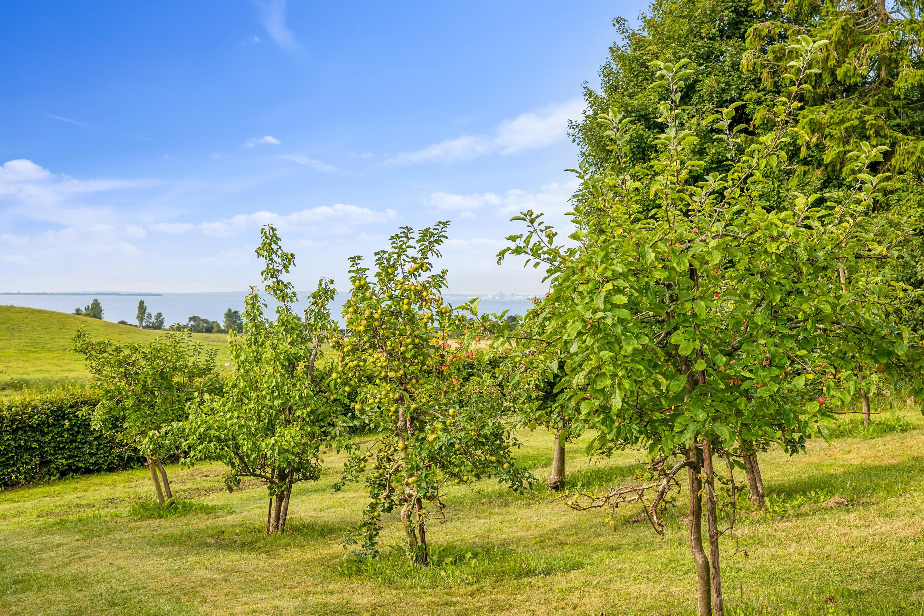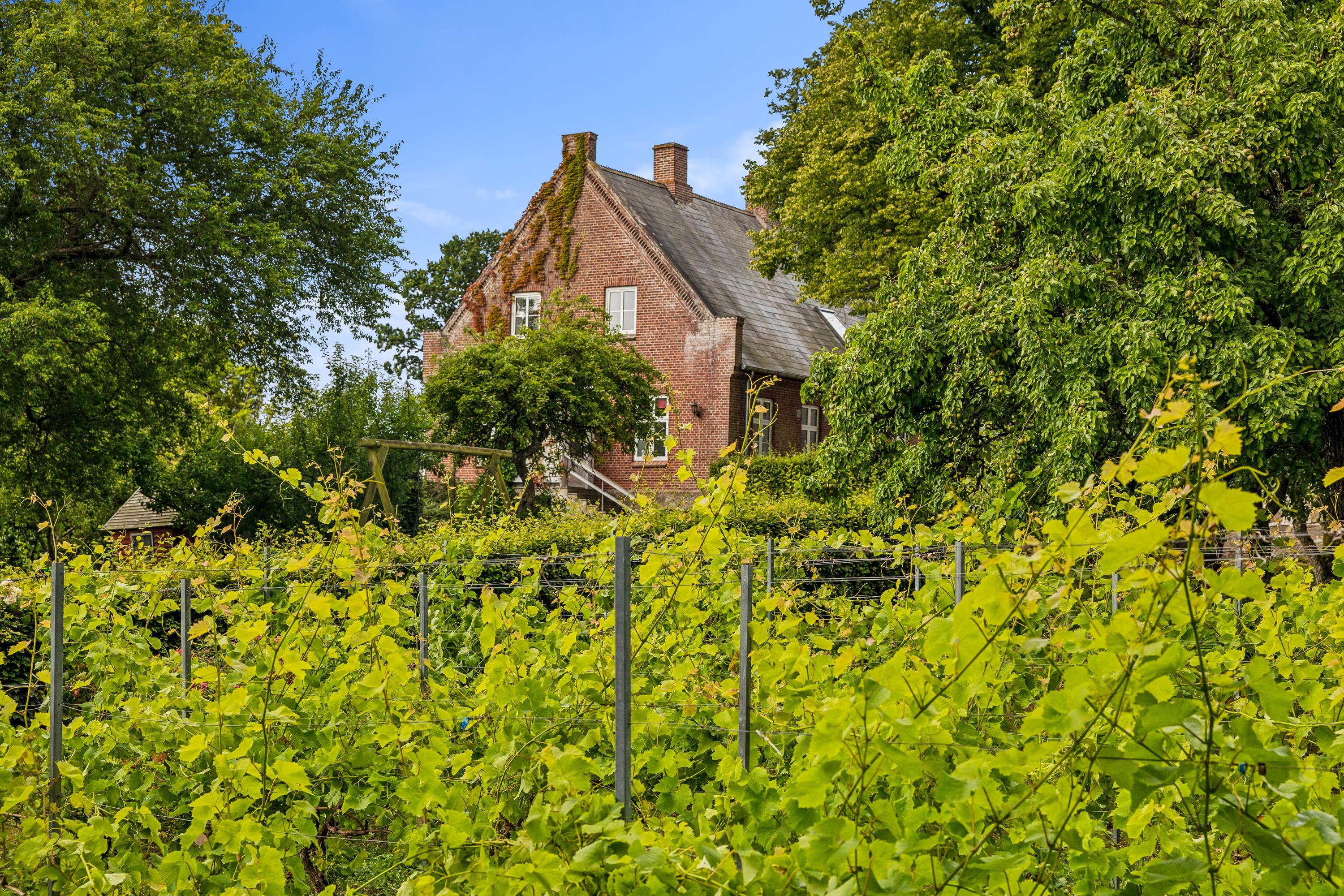 I Hovedbygningen er der plads til 26 personer, og så er der en dejlig, stor terrasse med udsigt ud over Kaløvig. Her er der desuden petanquebane, gynger, legehus og sandkasse samt adgang til fodboldbane og frugthave, og der er altså altid noget at give sig til – uanset om man er voksen eller barn.