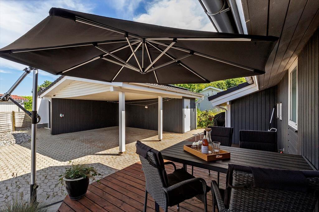 Udenfor venter en stor, delvist overdækket terrasse, hvor du kan nyde solen, grille med familien eller bare læne dig tilbage og lytte til bølgerne. Haven har plads til både leg og afslapning, og du bor kun få skridt fra det dejlige sand og det rolige badevand ved Følle Strand – oplagt til både morgenbadning, sandslotte og aftenture i solnedgangen. Du får et privat fristed med naturen som nærmeste nabo.