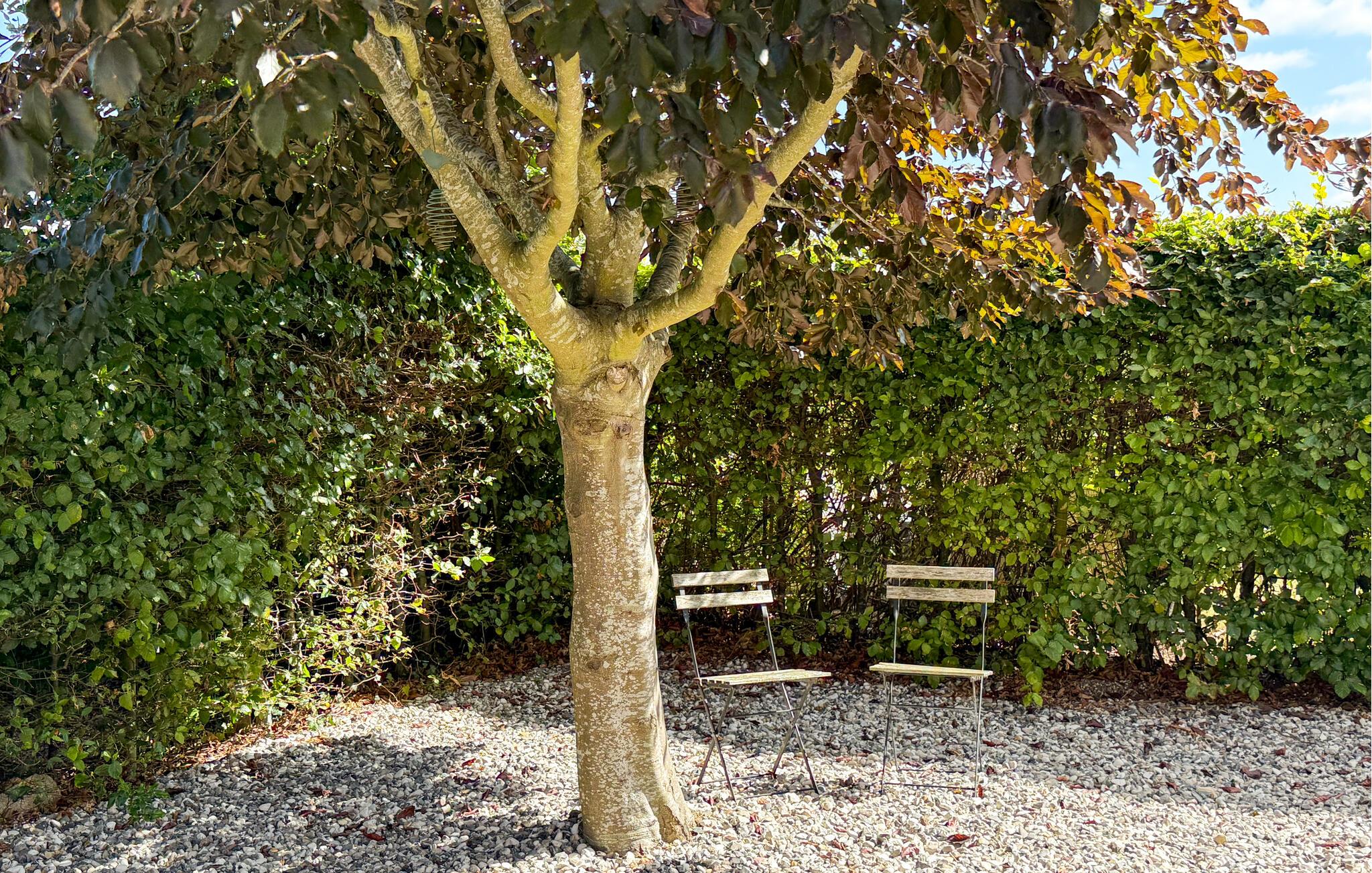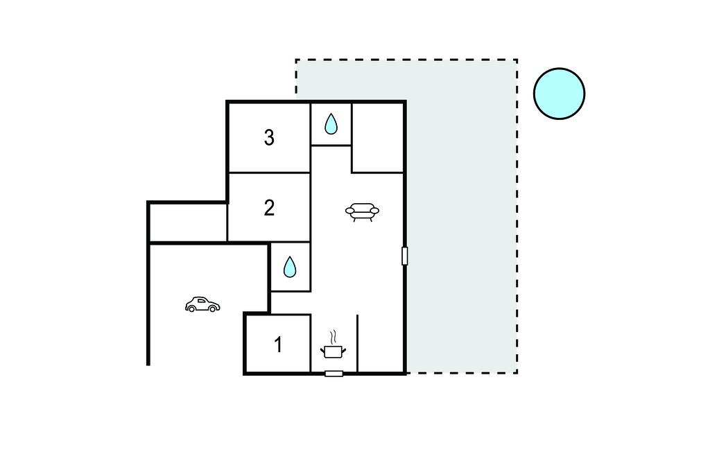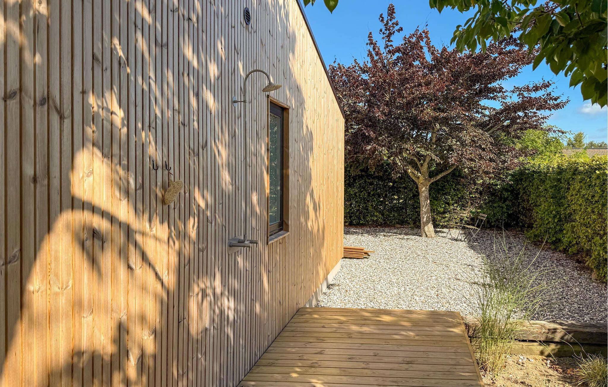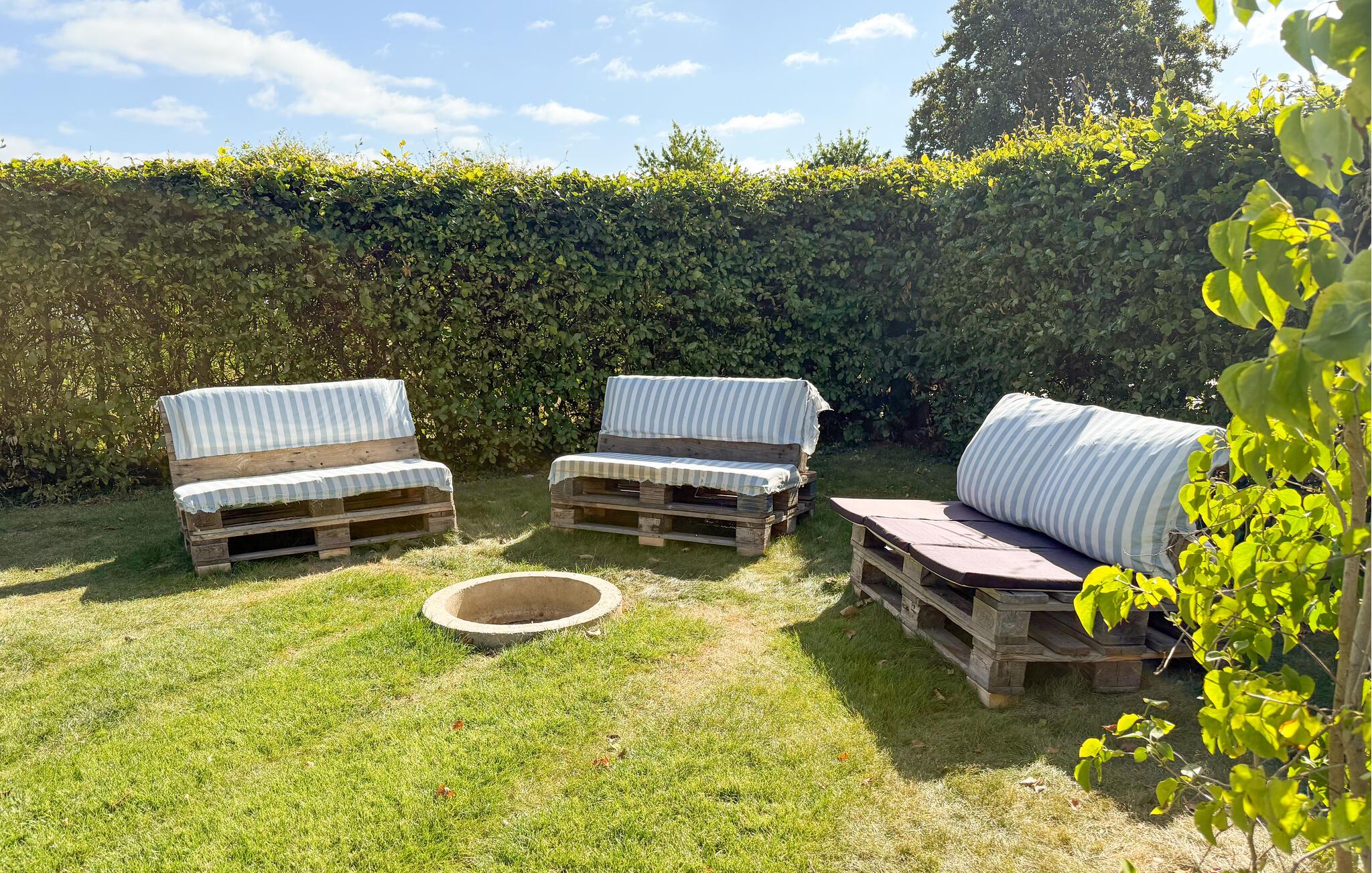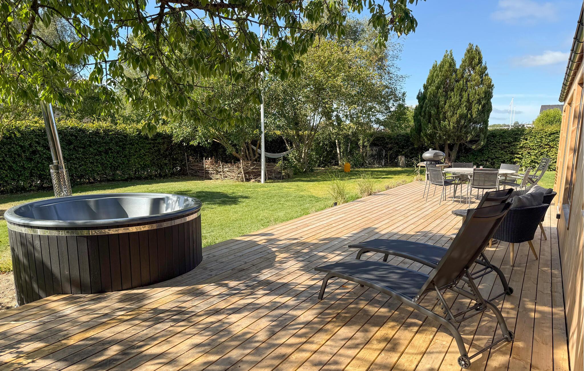 Den store have tilbyder forskellige siddemuligheder, der passer til enhver lejlighed. Den solrige terrasse er perfekt til en solid morgenmad, mens træbænkene lægger op til at hygge jer ved bålstedet om aftenen. Sæt jer godt til rette i vildmarksbadet og slap derefter af på en liggestol.