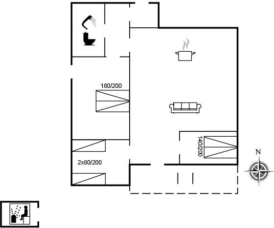 Der er i alt 3 soveværelser. Sovepladserne fordeler sig på: 4 sovepladser i dobbeltsenge. 2 sovepladser i enkeltsenge.