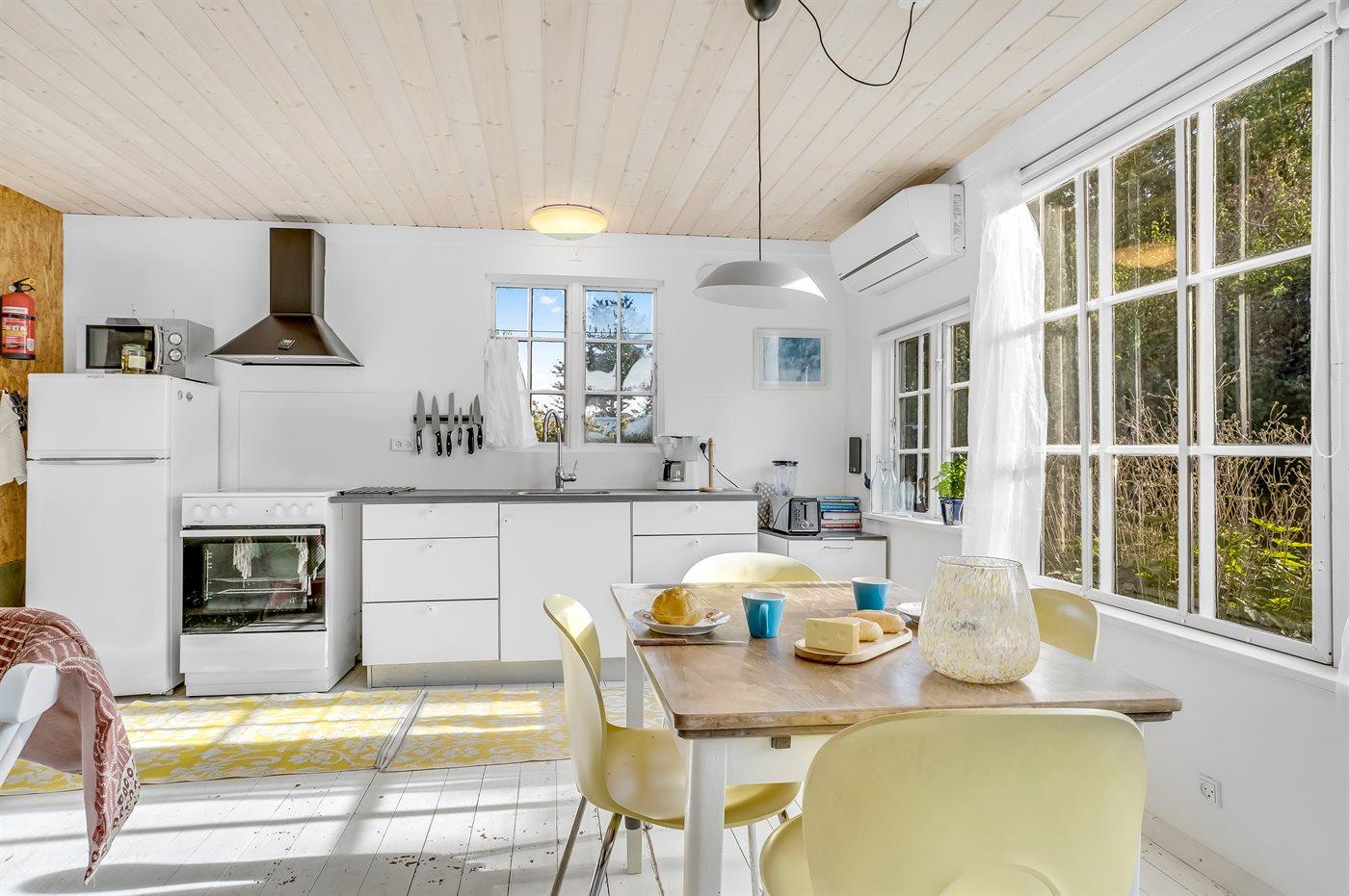 Køkkenet er udstyret med 1 køleskab. Der er 4 keramiske kogeplader, varmluftovn, mikrobølgeovn.