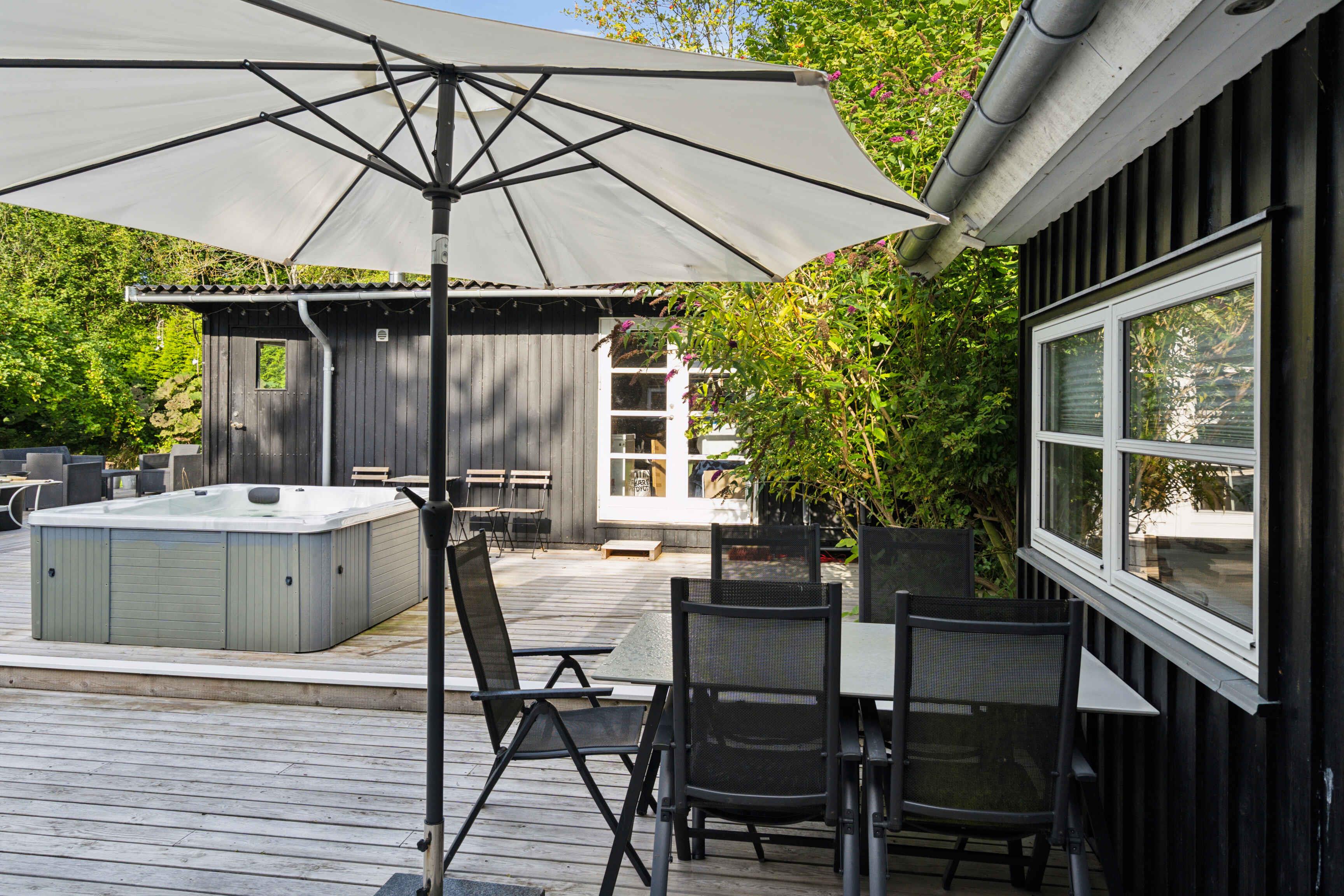 Lækkert moderne sommerhus til kip på stor naturgrund med træterasse, udespa og brændefyret sauna. 450 meter til skøn strand. Tæt på bistro, ishus, supermarkeder, togstation, Troldhøj skov, gamle ege-og bøgetræer, gravhøje og vandreruter.