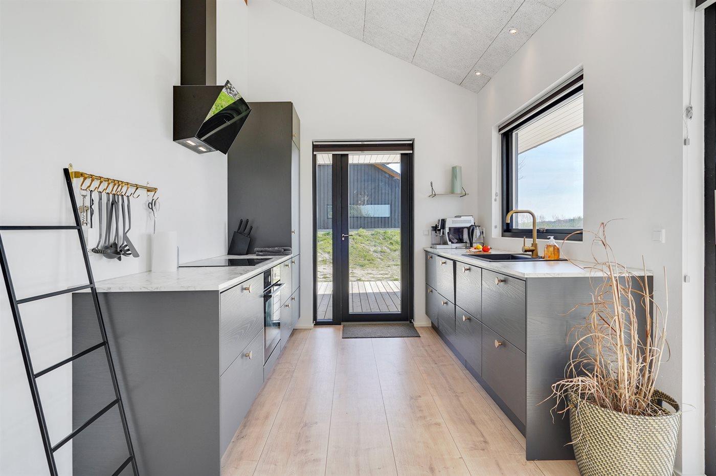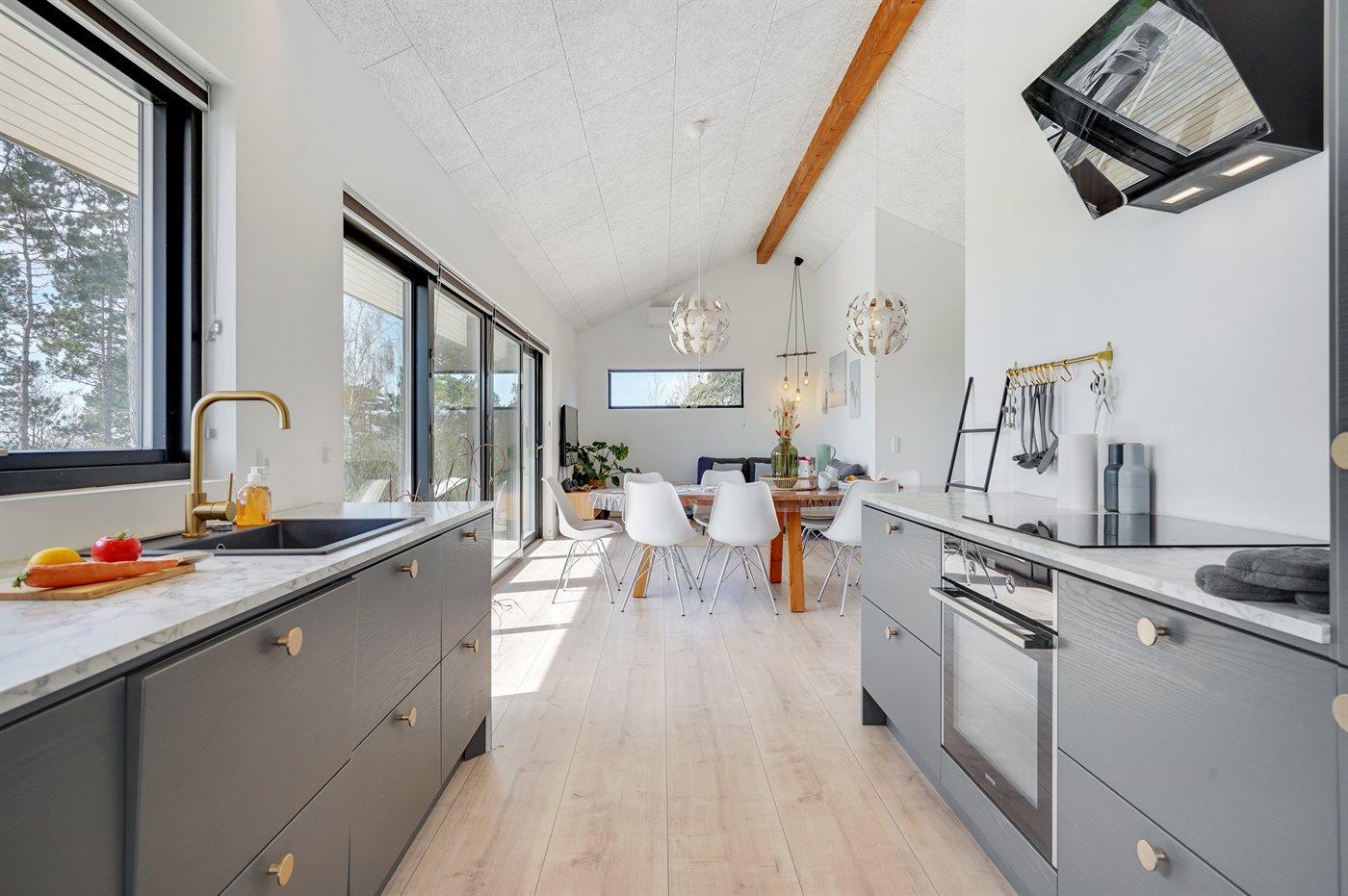 Køkkenet er udstyret med 1 køleskab. Der er 4 keramiske kogeplader, varmluftovn, mikrobølgeovn samt opvaskemaskine.
