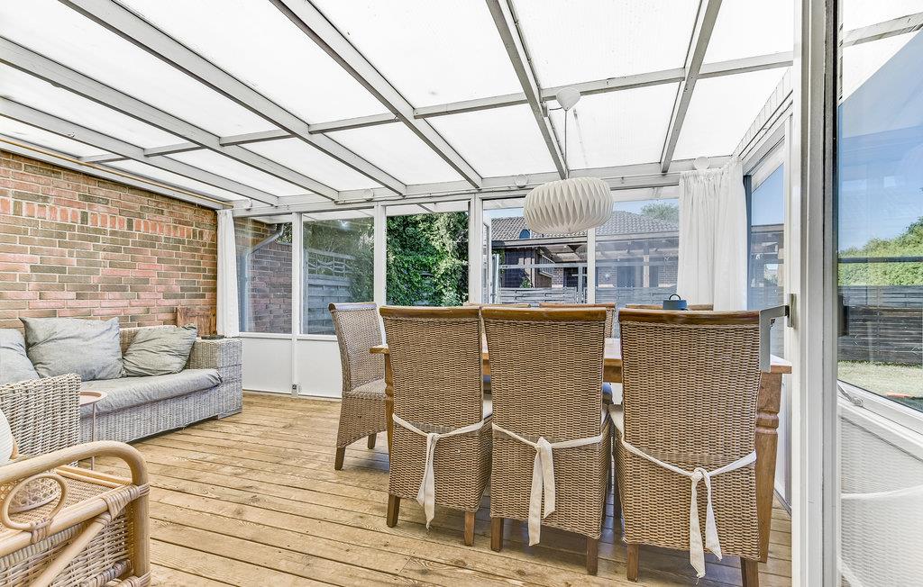 Både fra stuen og udestuen er der en dejlig udsigt til den grønne have. I kan nyde solen fuldt ud på den åbne terrasse.