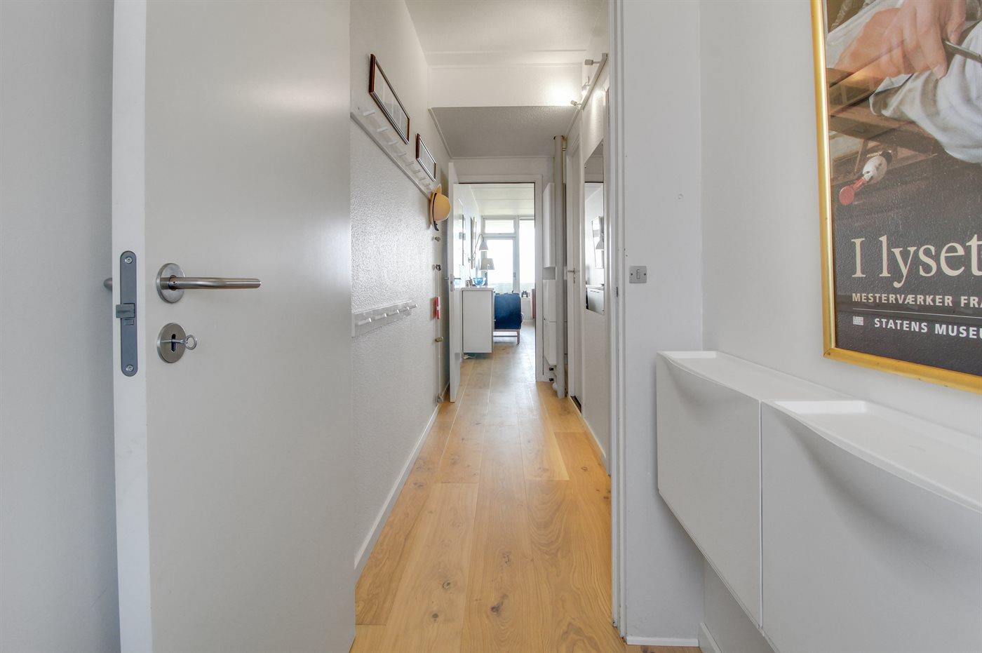Køkkenet er udstyret med 1 køleskab. Der er 2 elkogeplader, miniovn, varmluftovn samt opvaskemaskine.