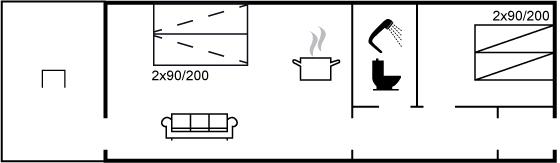 Der er i alt 1 soveværelse. Sovepladserne fordeler sig på: 2 sovepladser i dobbeltseng. 2 sovepladser i sovesofa (dobbelt). 2 af disse sovepladser befinder sig i stuen.