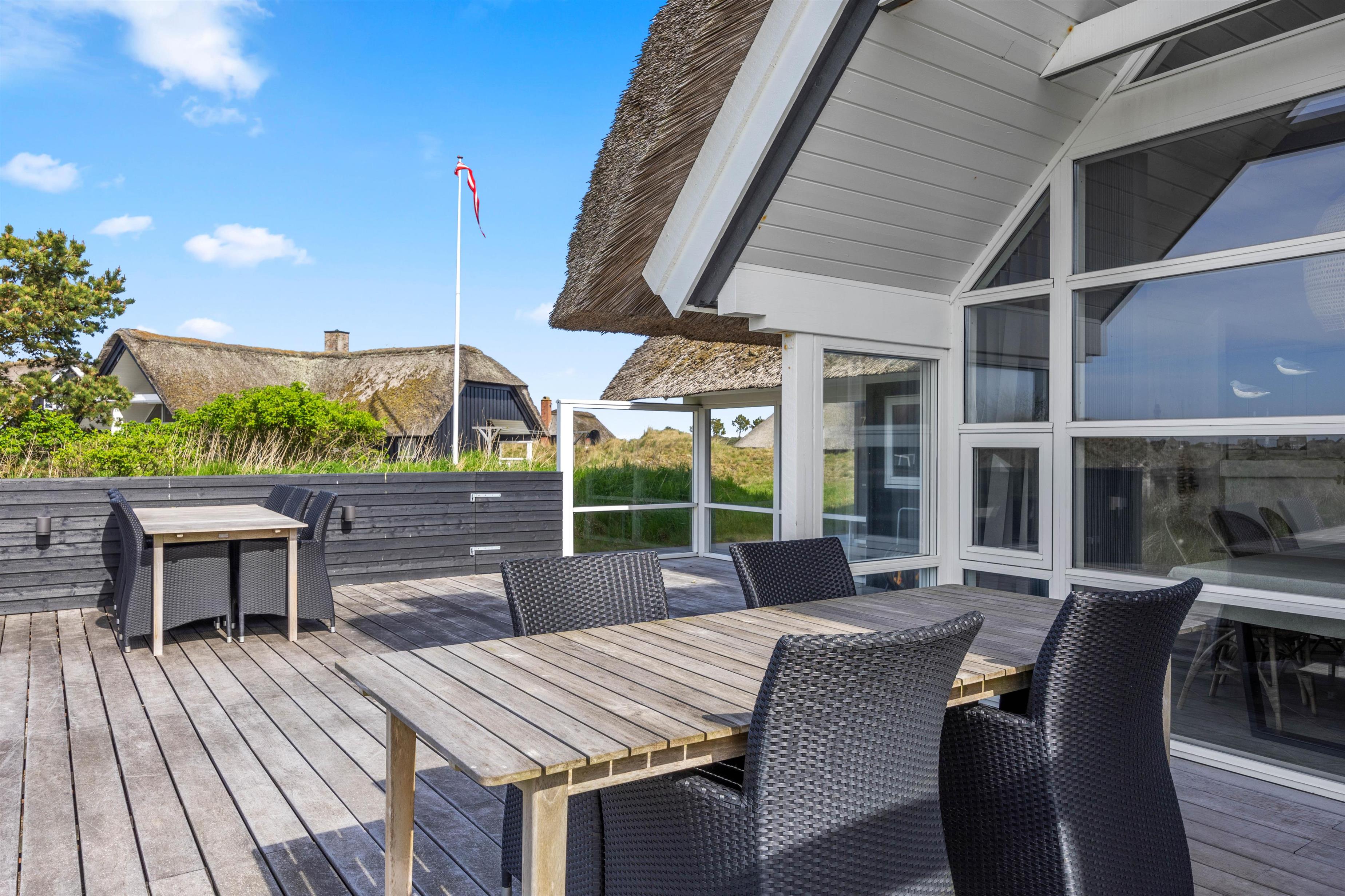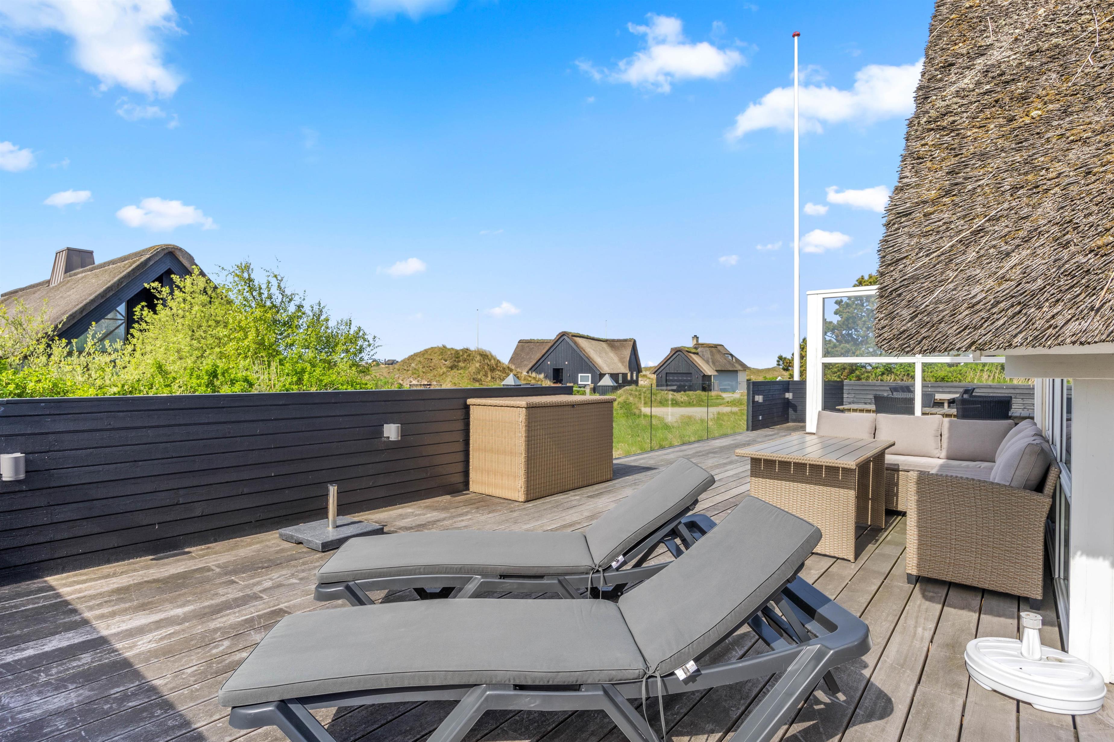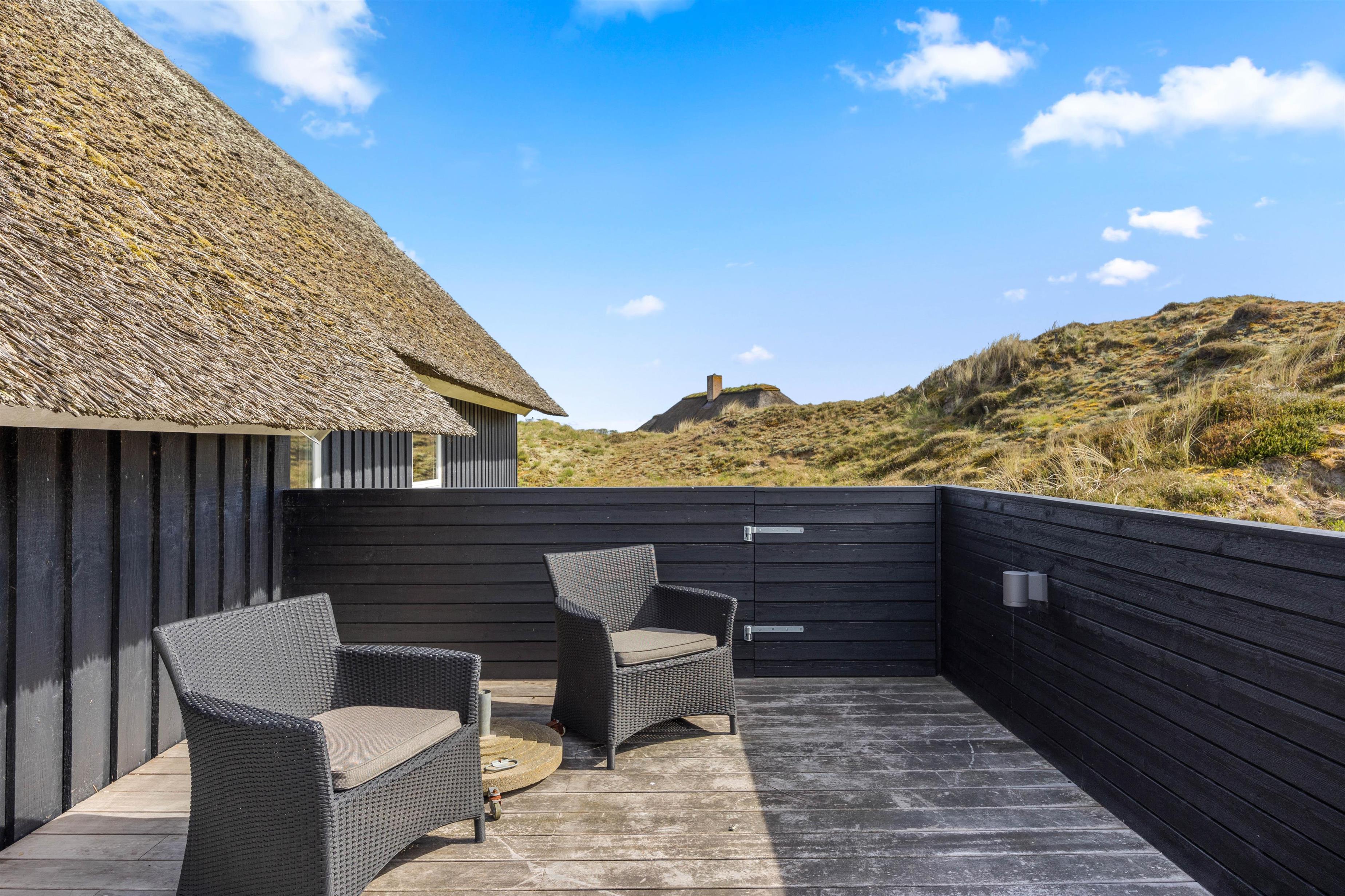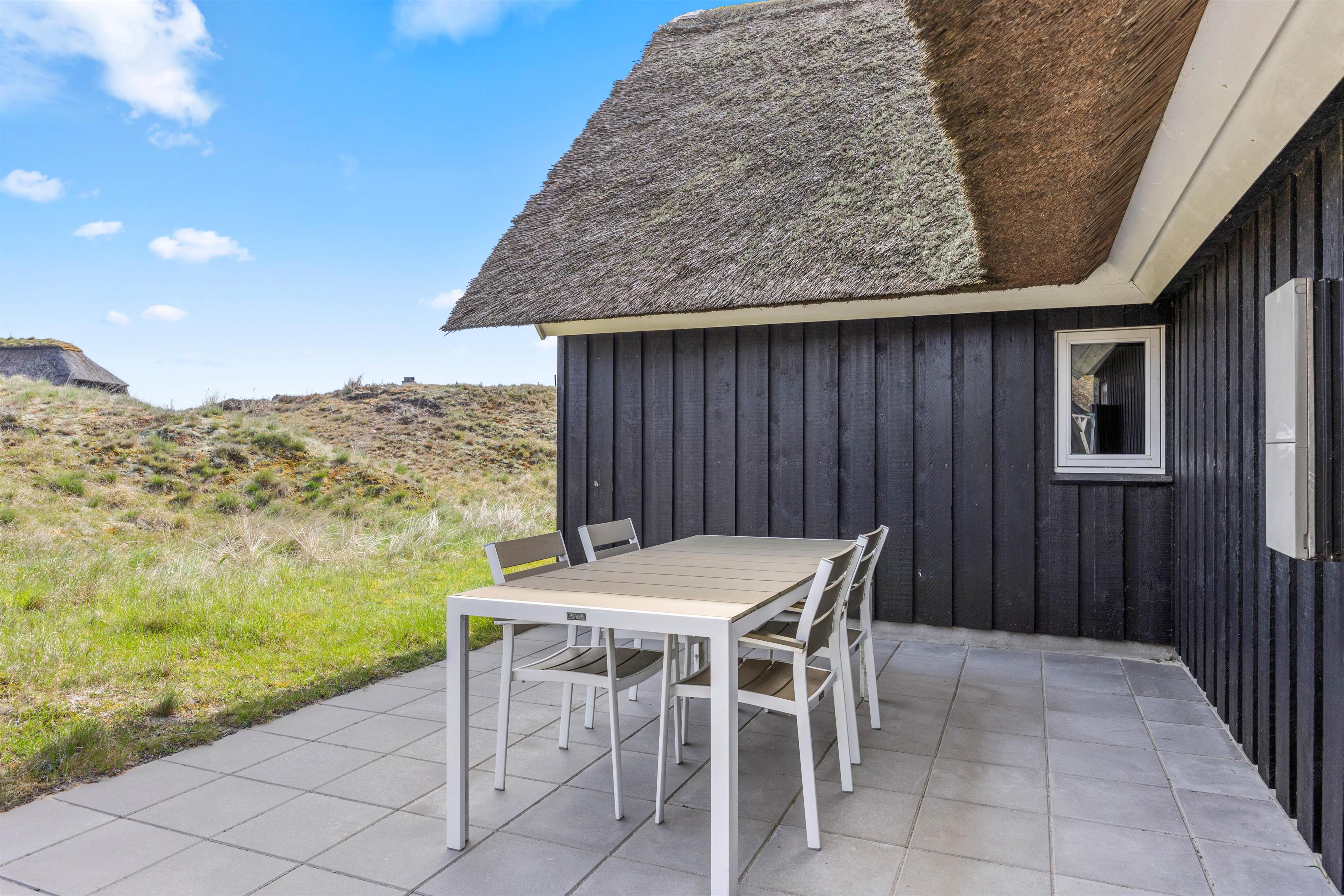 Start dagen med morgenmad på den store træterrasse, som omgiver sommerhuset. Nyd de smukke omgivelser og lyt til fuglesangen. Tag solbad i de komfortable liggestole, slap af i havemøblerne og flyt jer rundt efter solen, som det passer jer bedst. Der vil altid kunne findes en krog med læ eller skygge. Tænd op i grillen til aften, og slut dagen af med et lækkert grillmåltid sammen, imens skyggerne bliver lange. Bagefter kan I gå en tur til Vesterhavet, hvis I trænger til mere frisk luft og motion. En god kilometer hver vej giver jer mulighed for at opleve solnedgangen, som altid er en oplevelse, uanset vejret.