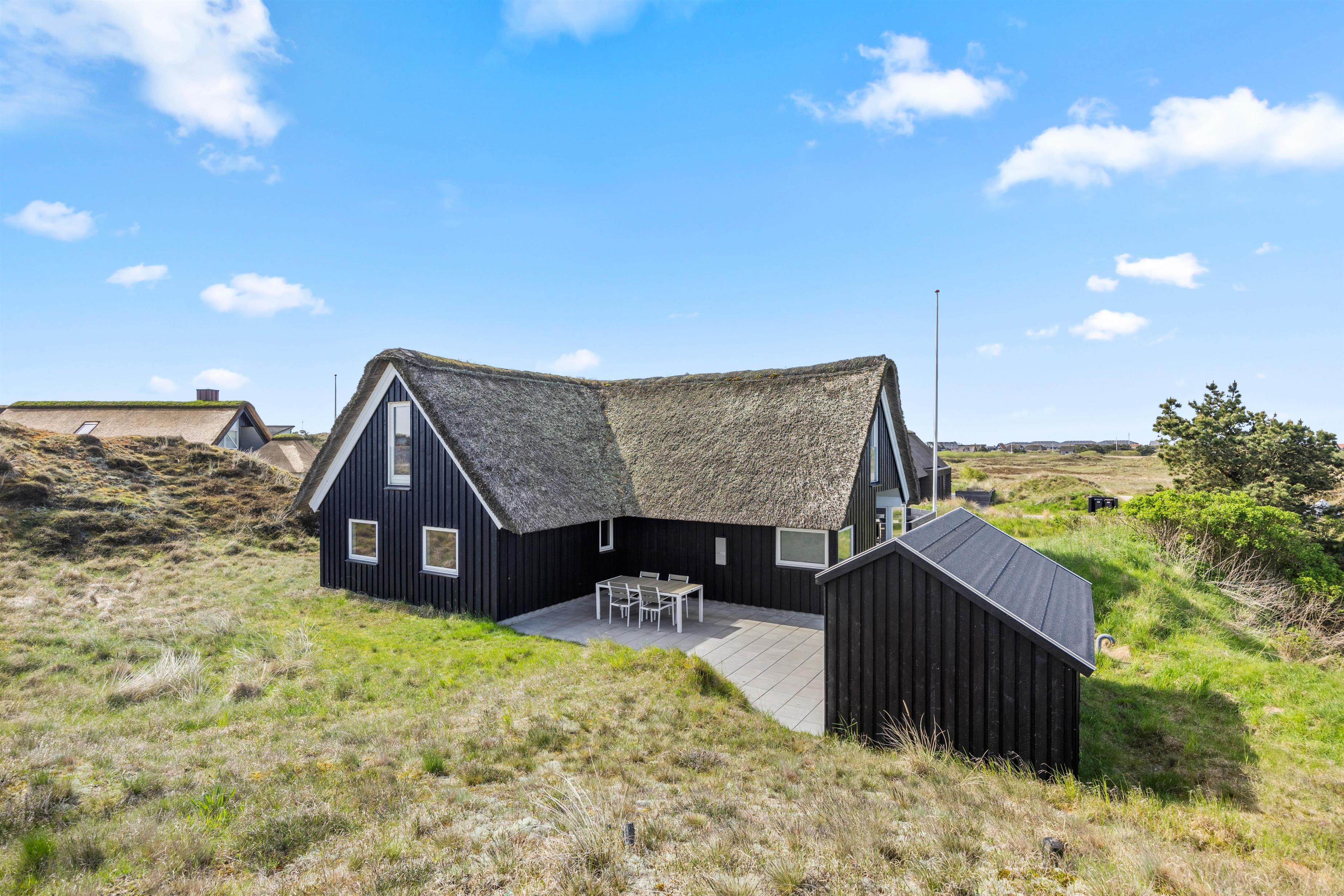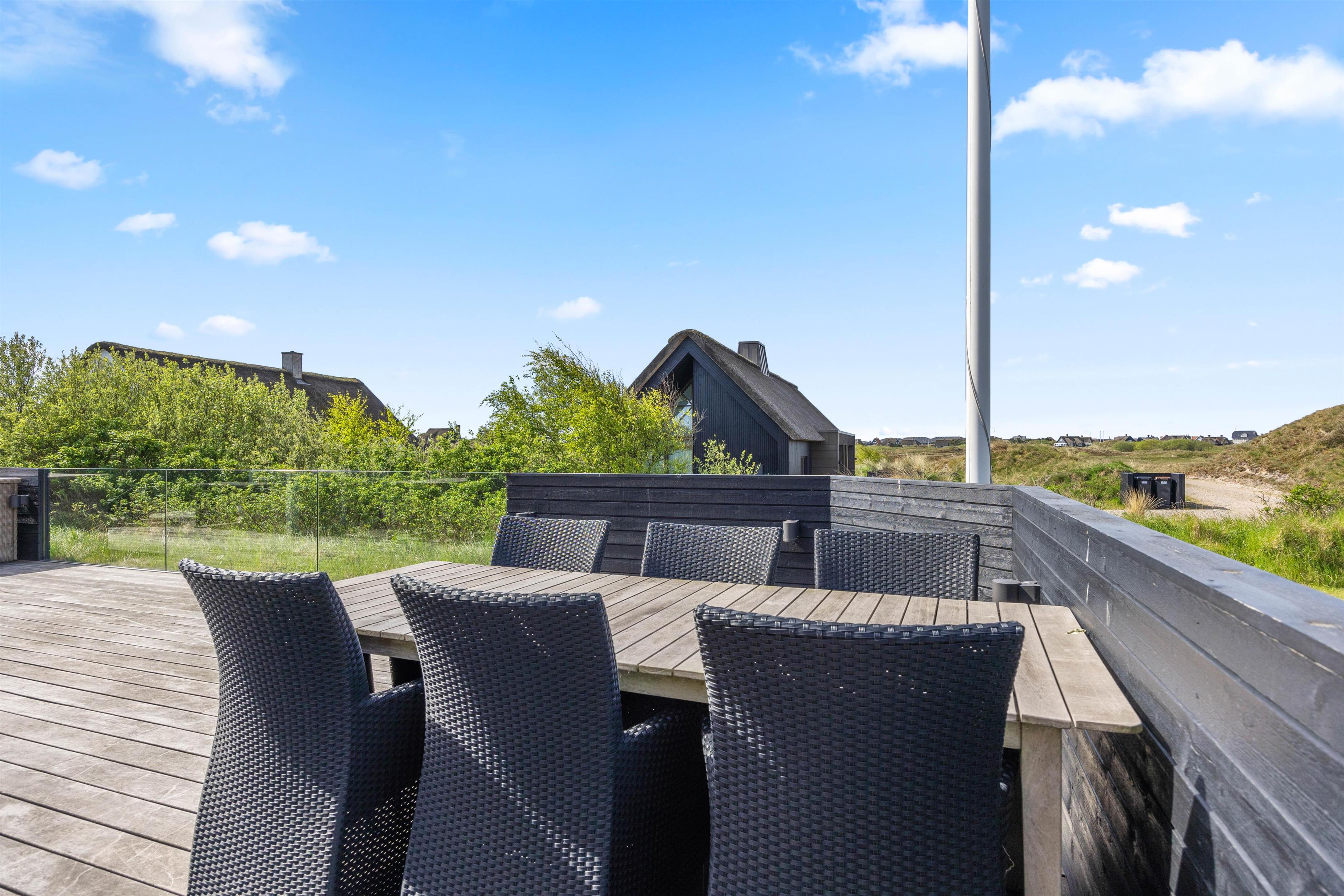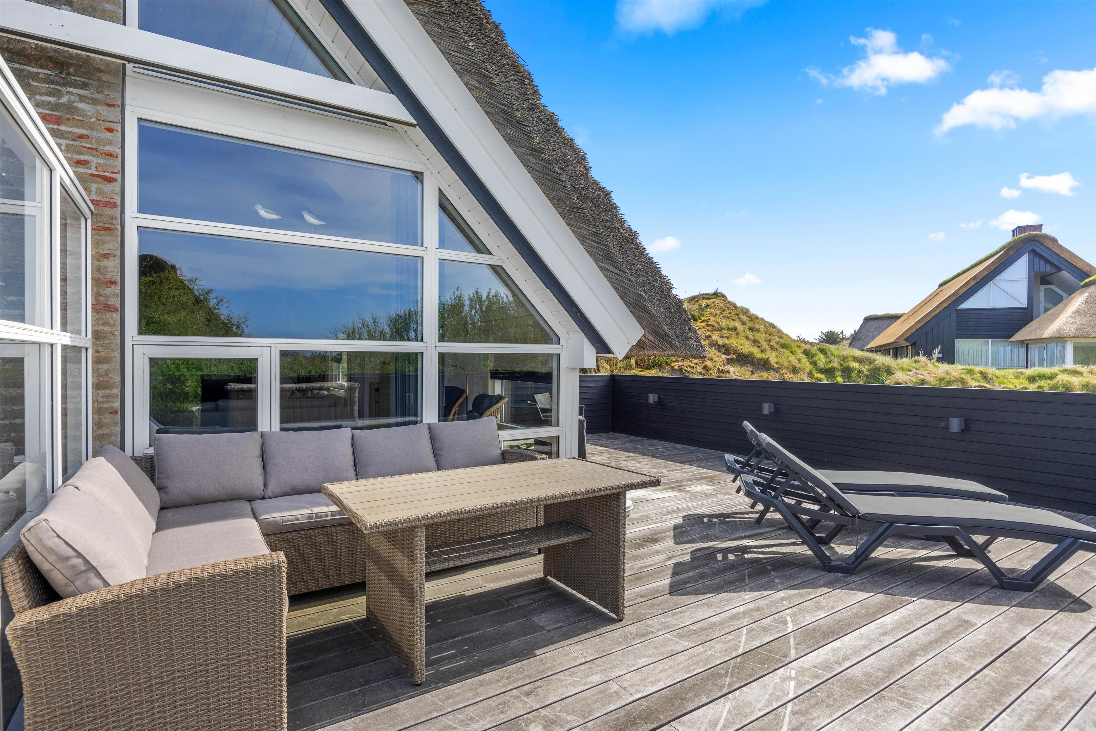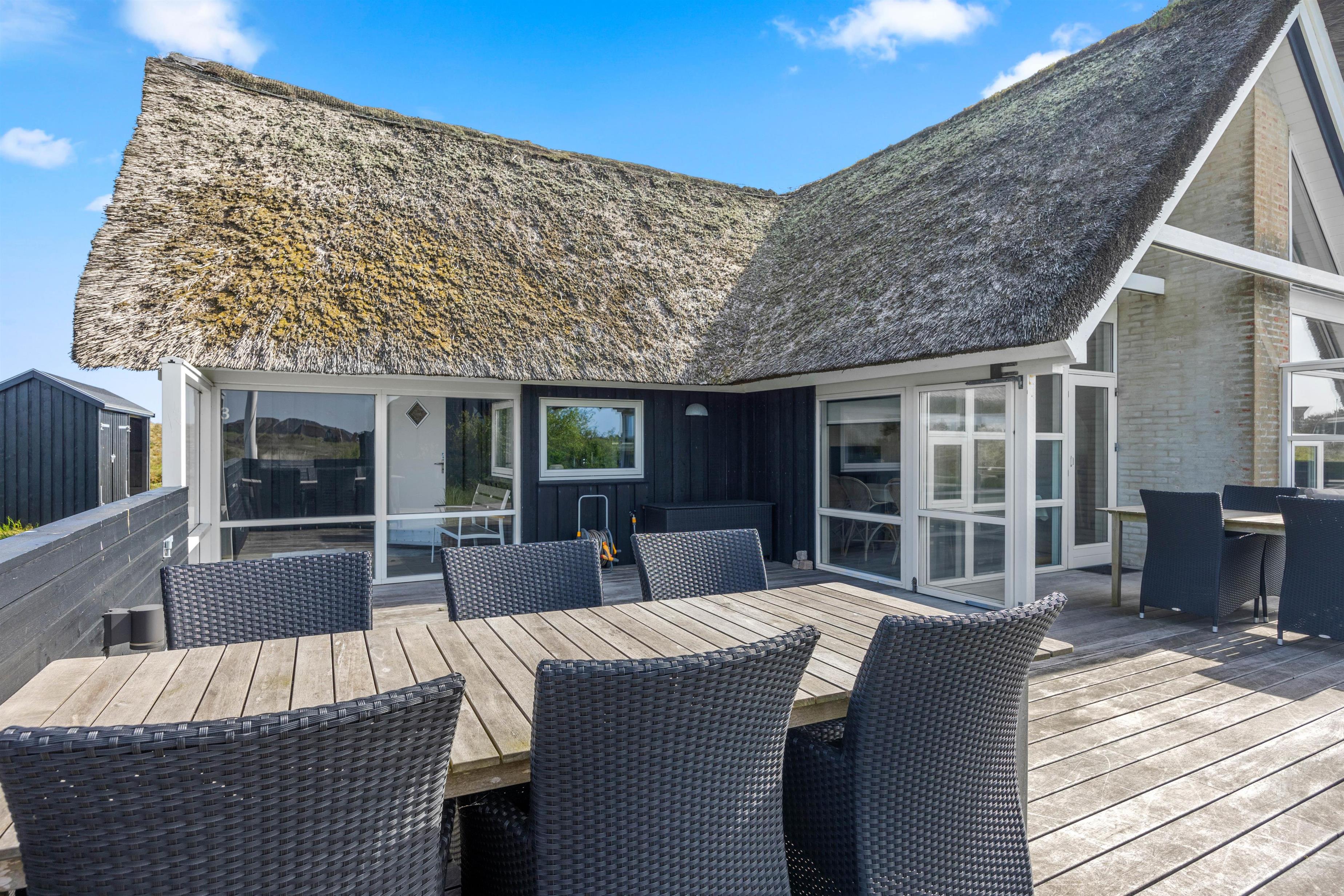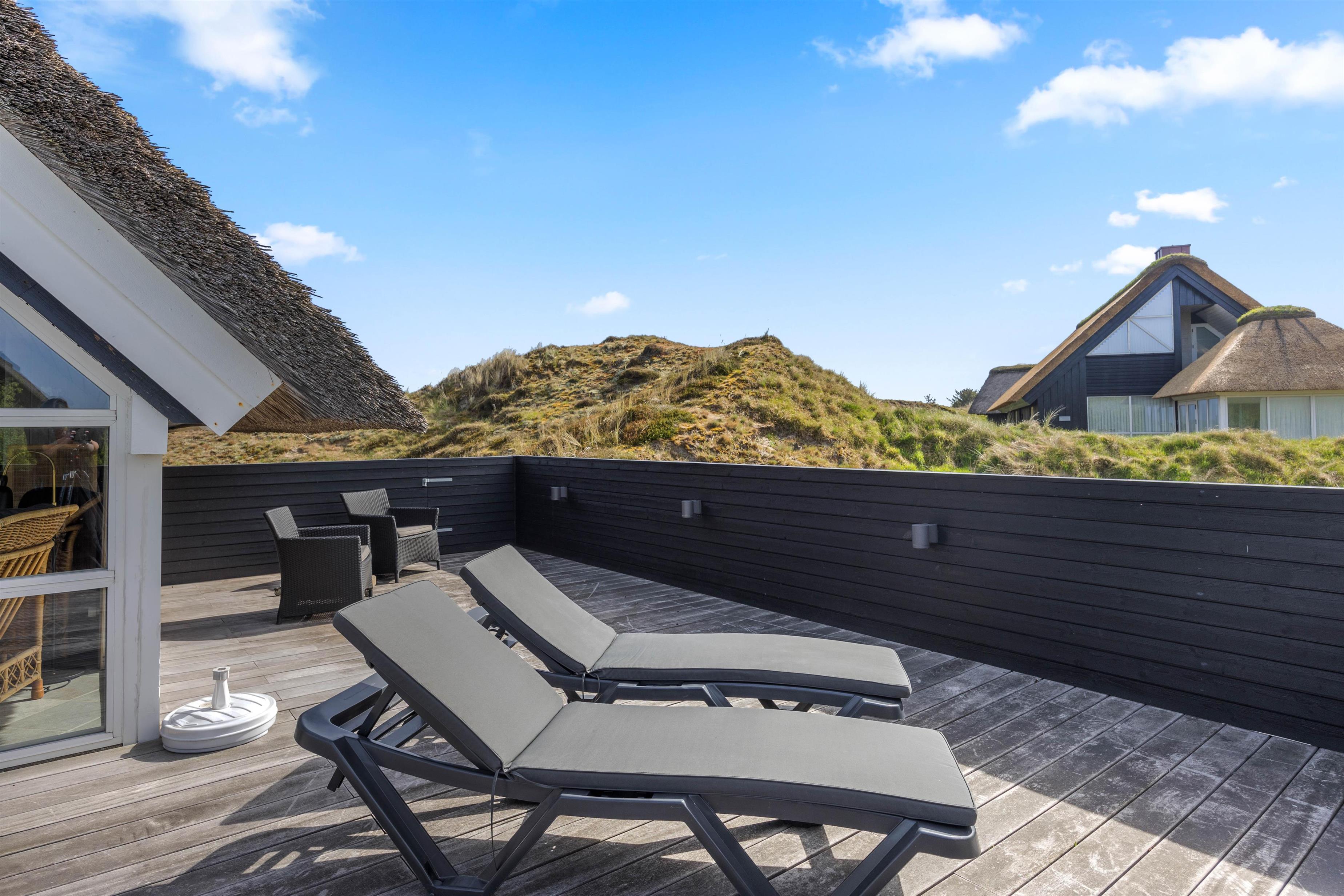 Start dagen med morgenmad på den store træterrasse, som omgiver sommerhuset. Nyd de smukke omgivelser og lyt til fuglesangen. Tag solbad i de komfortable liggestole, slap af i havemøblerne og flyt jer rundt efter solen, som det passer jer bedst. Der vil altid kunne findes en krog med læ eller skygge. Tænd op i grillen til aften, og slut dagen af med et lækkert grillmåltid sammen, imens skyggerne bliver lange. Bagefter kan I gå en tur til Vesterhavet, hvis I trænger til mere frisk luft og motion. En god kilometer hver vej giver jer mulighed for at opleve solnedgangen, som altid er en oplevelse, uanset vejret.