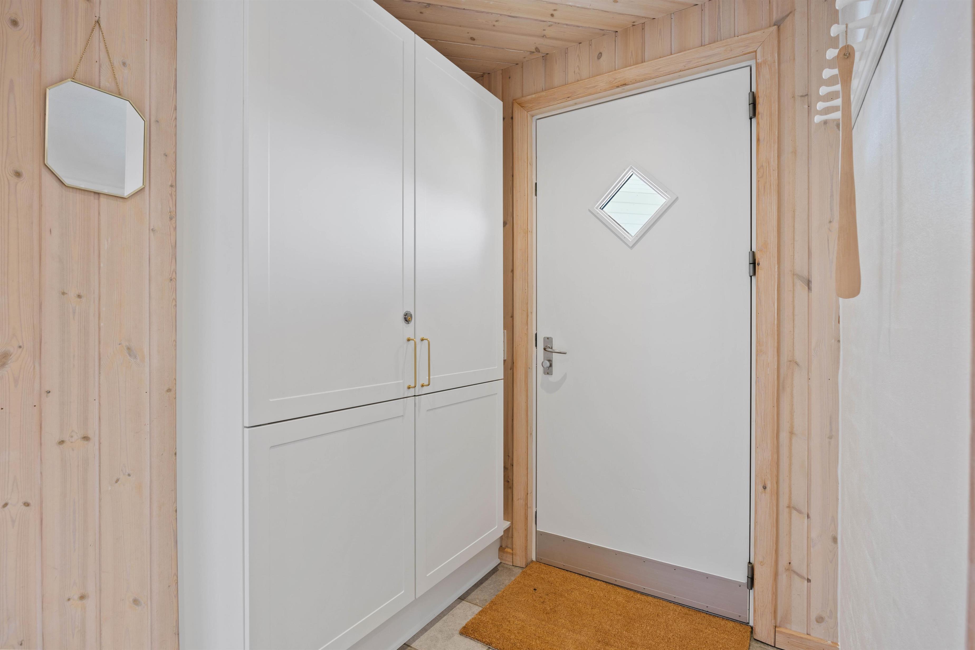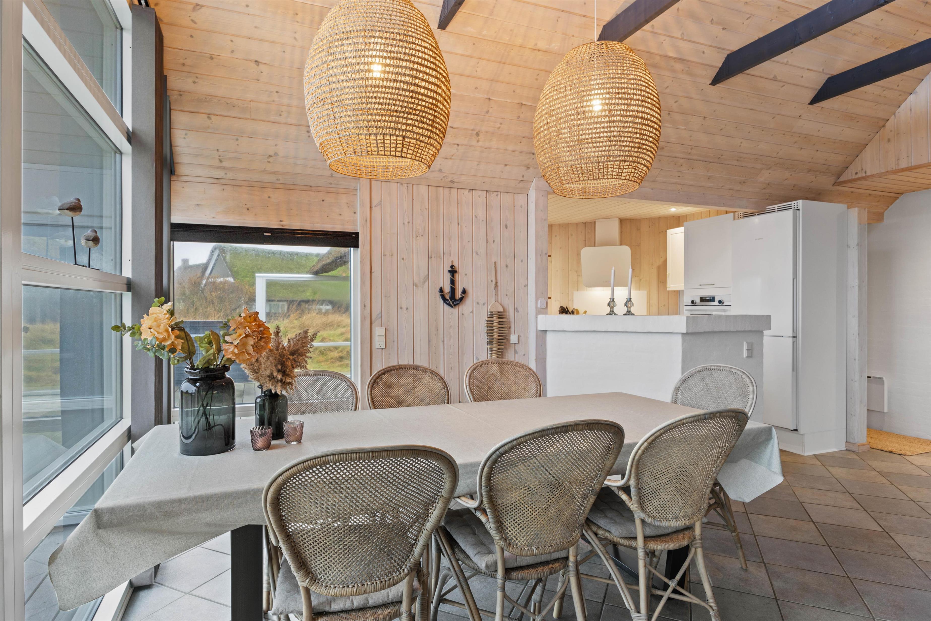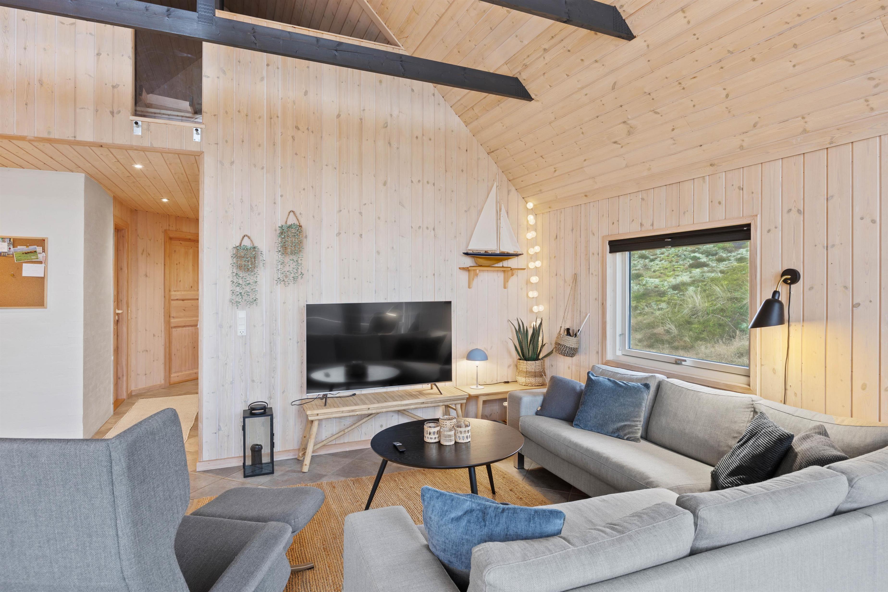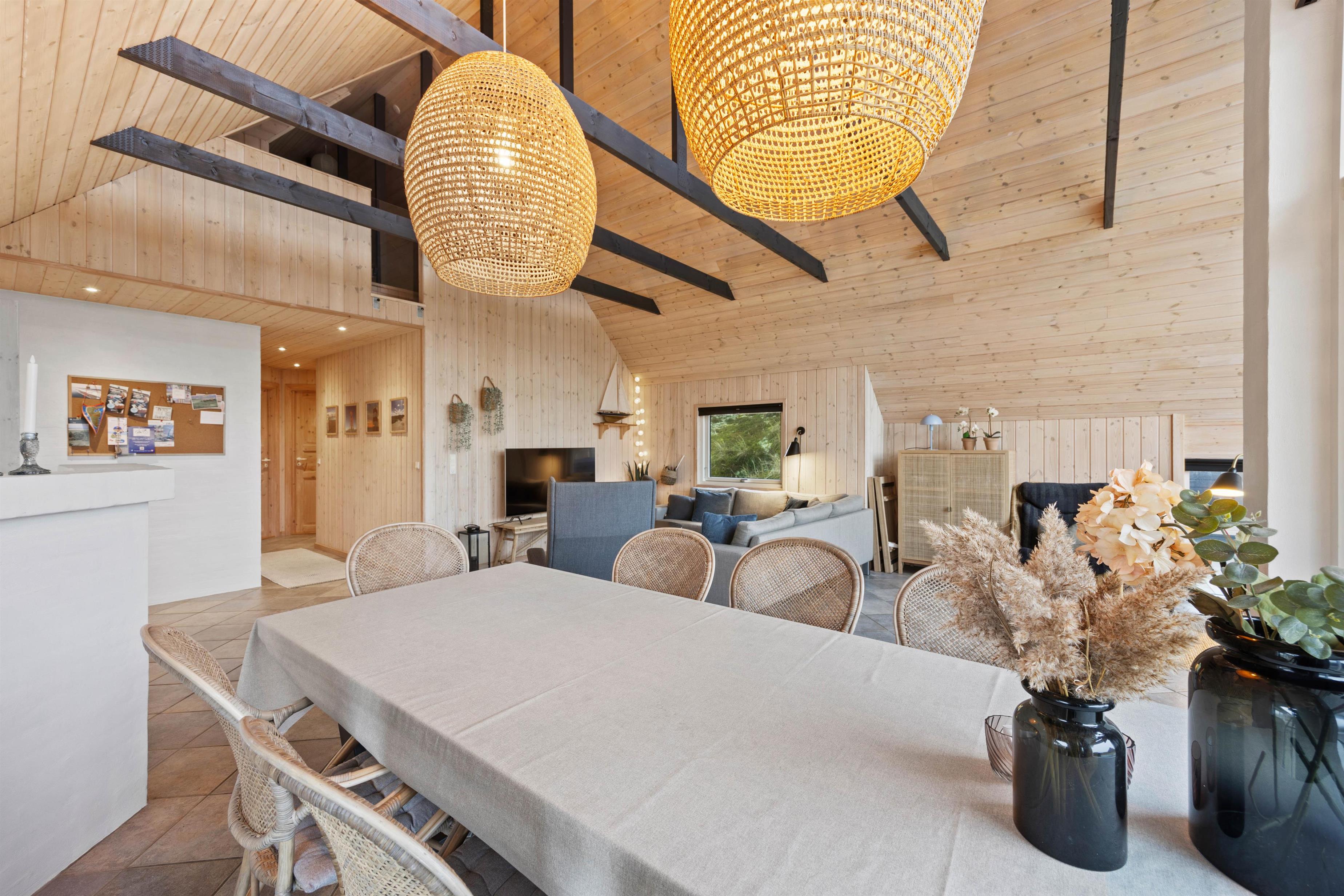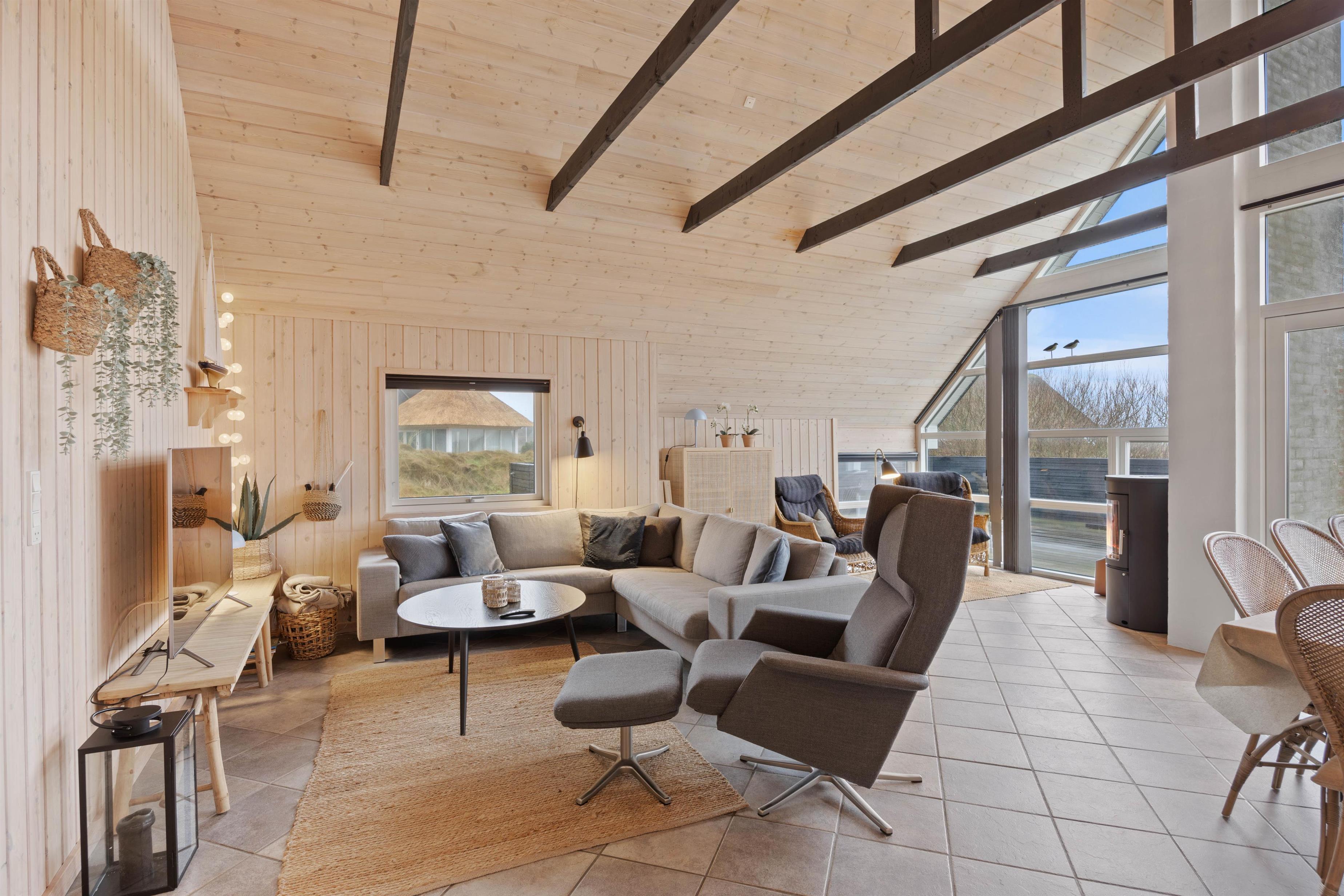 Man mærker feriestemningen straks, man træder indenfor på Skovstien 73. Her er det fælles opholdsrum åbent i forbindelse med køkkenet. Det lyse indtryk understreges af de lysnede, træbeklædte vægge og lofter op i kip med synlige hanebånd. Lysindfaldet gennem de brede vinduespartier medvirker til, at man føler sig midt i landskabet. Med ild i brændeovnen på kølige dage bliver atmosfæren blot endnu mere hyggelig. Nyd timerne sammen – indendørs såvel som udendørs.