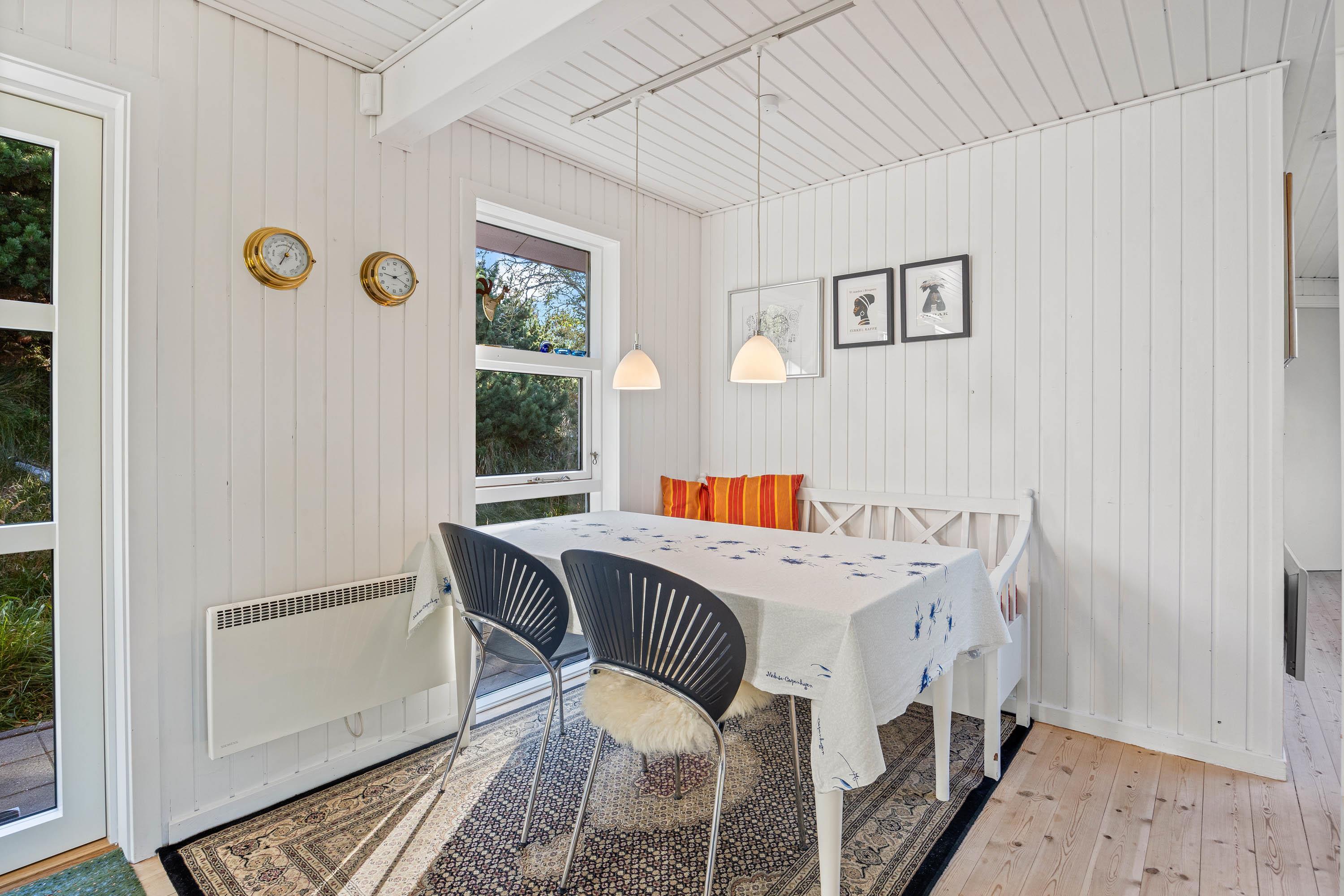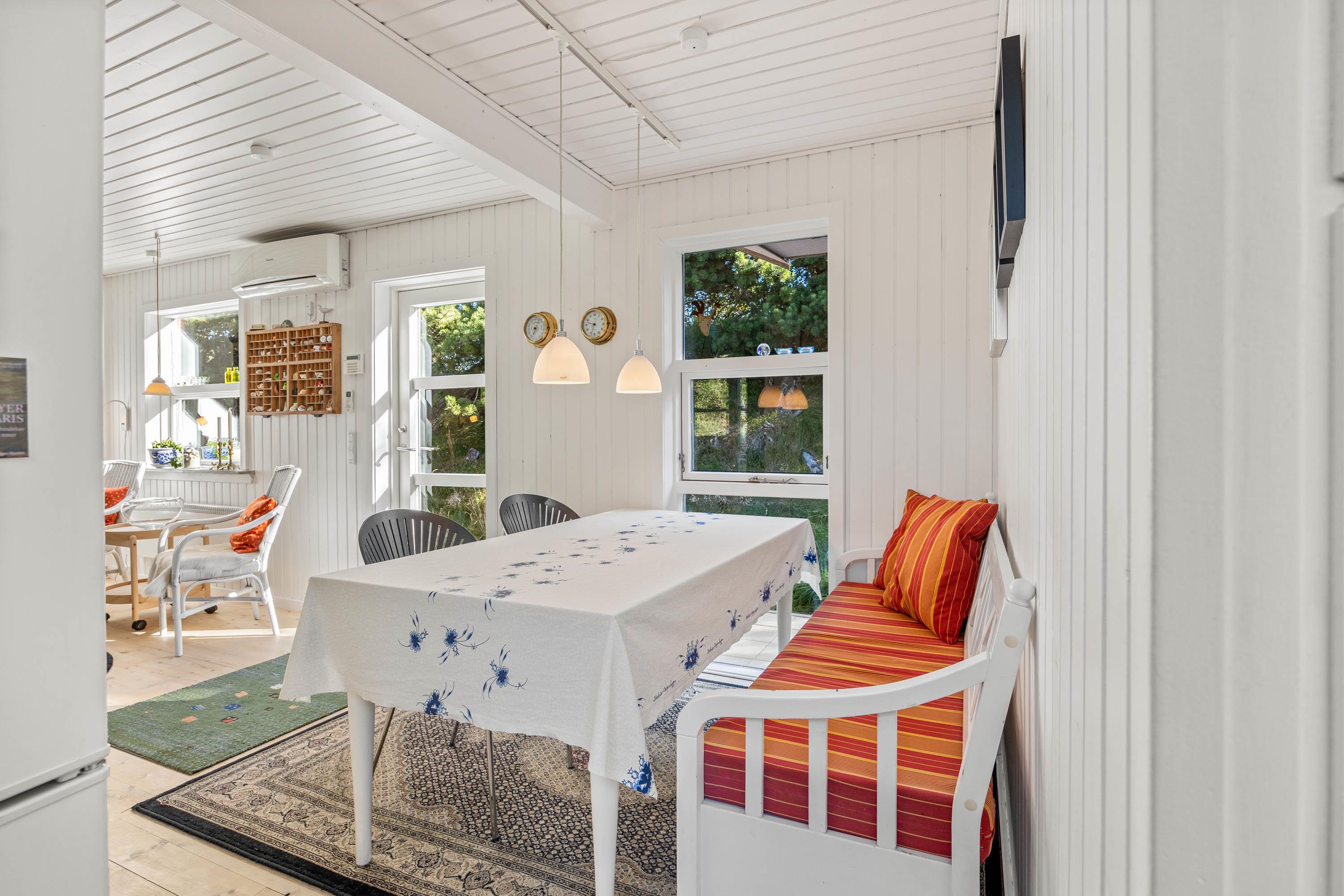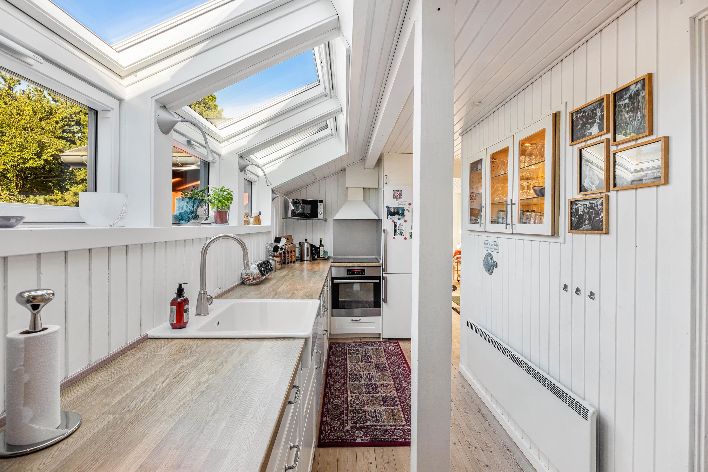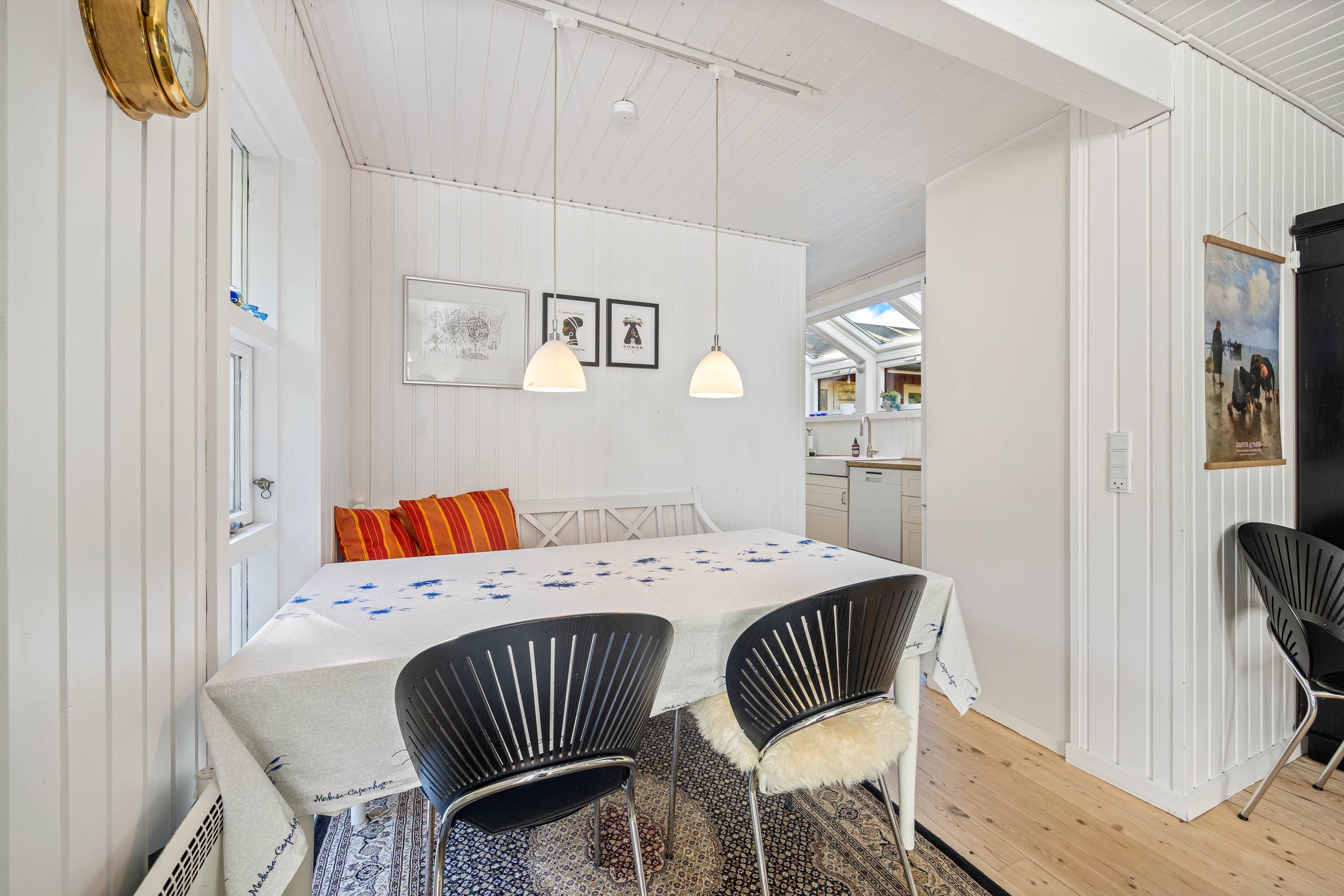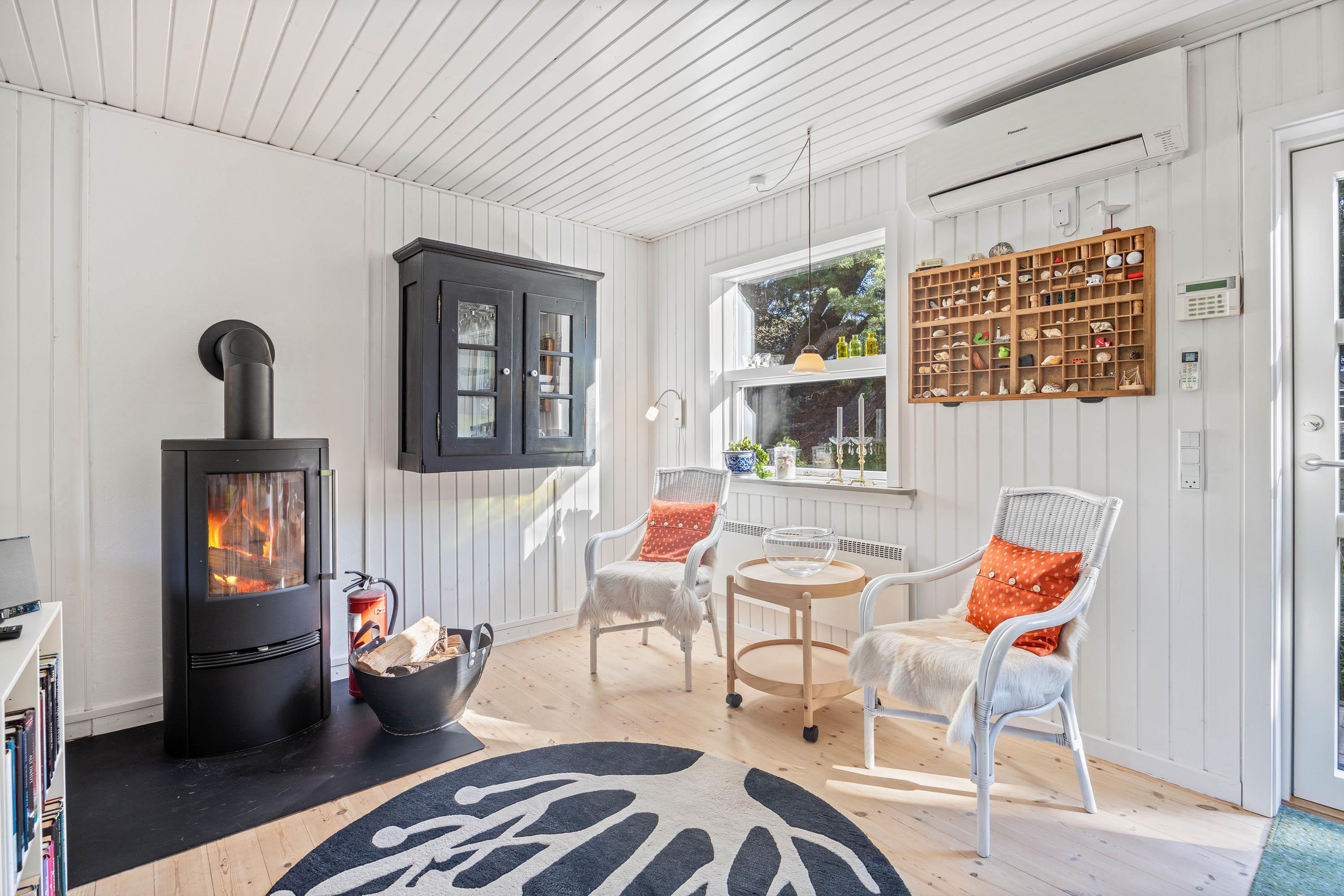 Husets rustikke stue har trægulve, og der kan tændes op til familiehygge i brændeovnen. I det praktiske køkken, udstyret med en 70 liters fryser, er der også opvaskemaskine. Derudover er der tre soveværelser med to dobbeltsenge og to enkeltsenge ligeledes med trægulve, og på badeværelset er der gulvvarme. Sommerhuset er udstyret med en moderne energisparende varmepumpe, der sørger for hurtig og effektiv opvarmning, og der er både vaskemaskine og tørretumbler, der sikrer at komforten er i top. Desuden er der Chromecast og fibernet.
